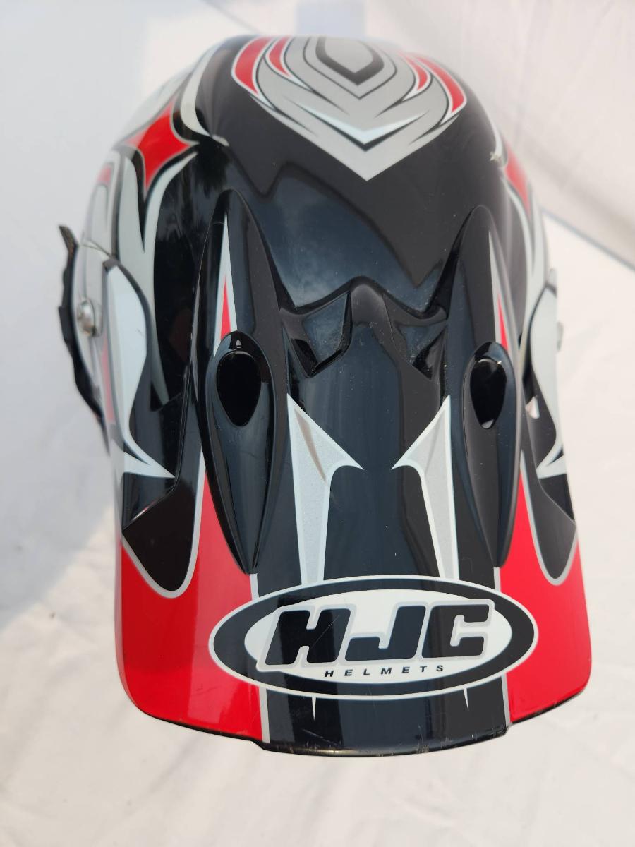 HJC off-road motorcycle helmet featuring a striking red, black, and white graphic design. Includes an adjustable visor and built-in mounting points. Comes with tinted goggles for eye protection. Designed for off-road use, this helmet is lightweight and offers optimal ventilation. Branding visible on the visor and sides. Appears to be in good condition with no visible major defects.