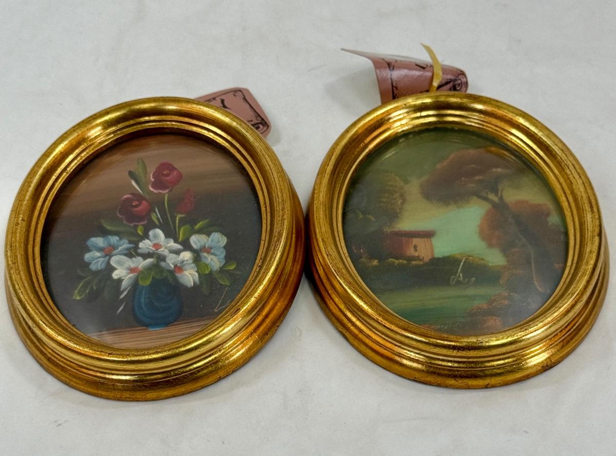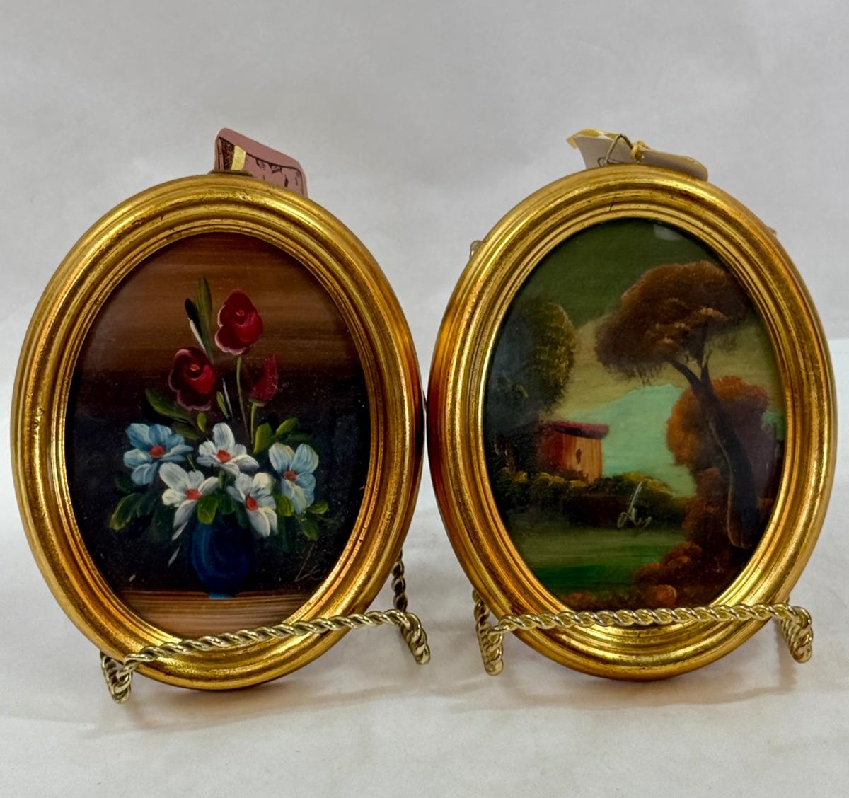 Pair of Vintage Miniature Oil Paintings in oval gift frames Landscape & Still Life