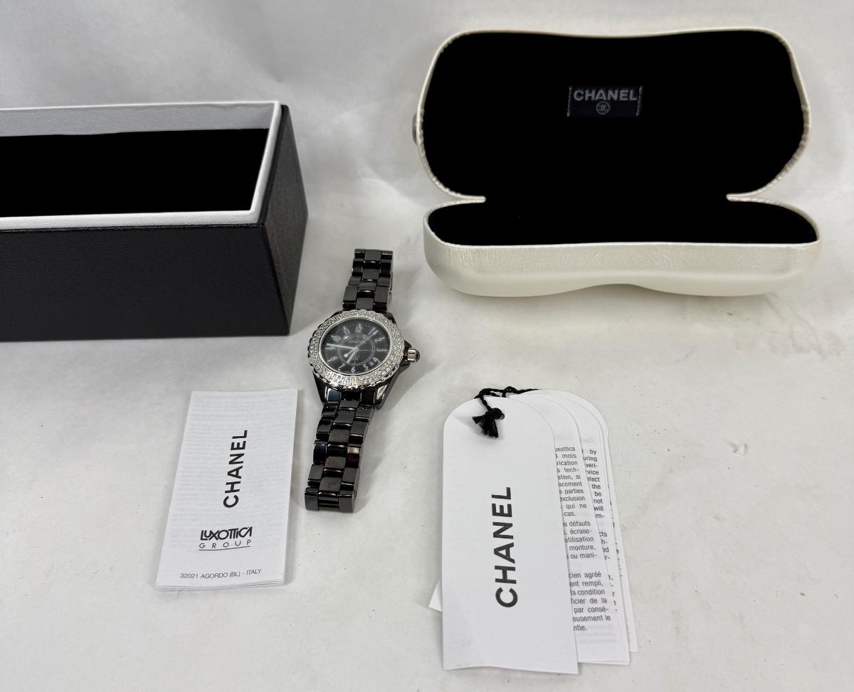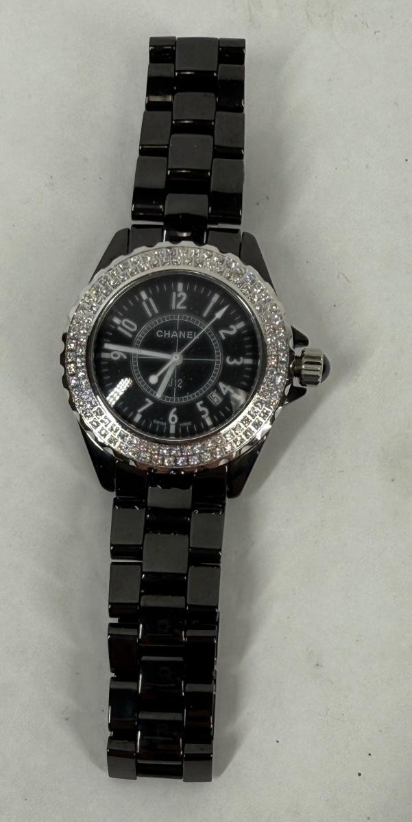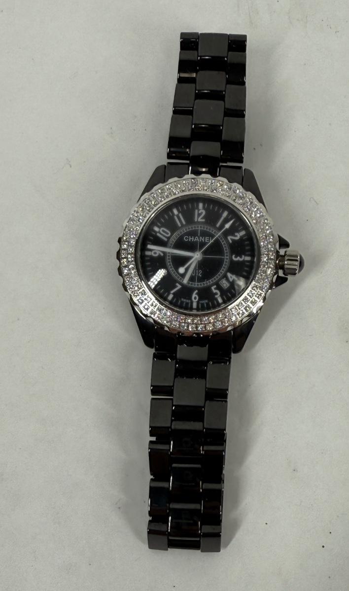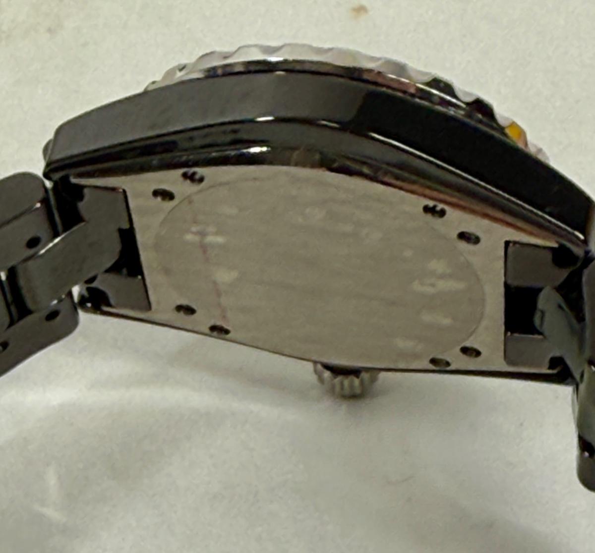 In good used condition. Style is similar to the Chanel J12 Diver's watch, with rotating encrusted bezel. Not working, may simply need a new battery. Has a date window on the dial between the 4 & 5 position. Stored in a Chanel Sunglasses case.