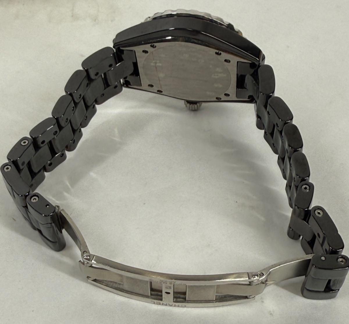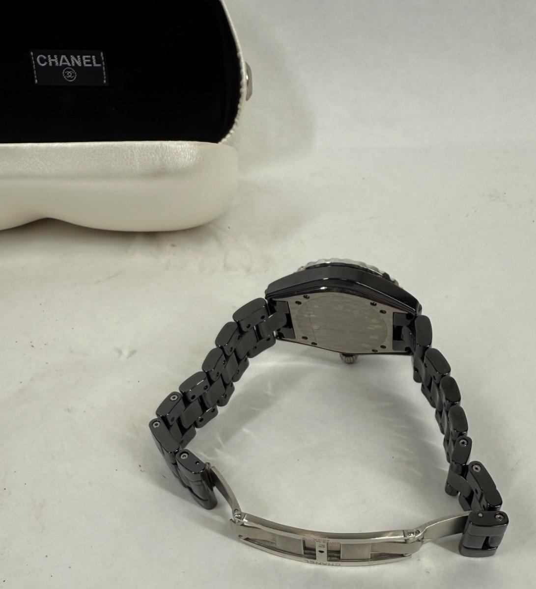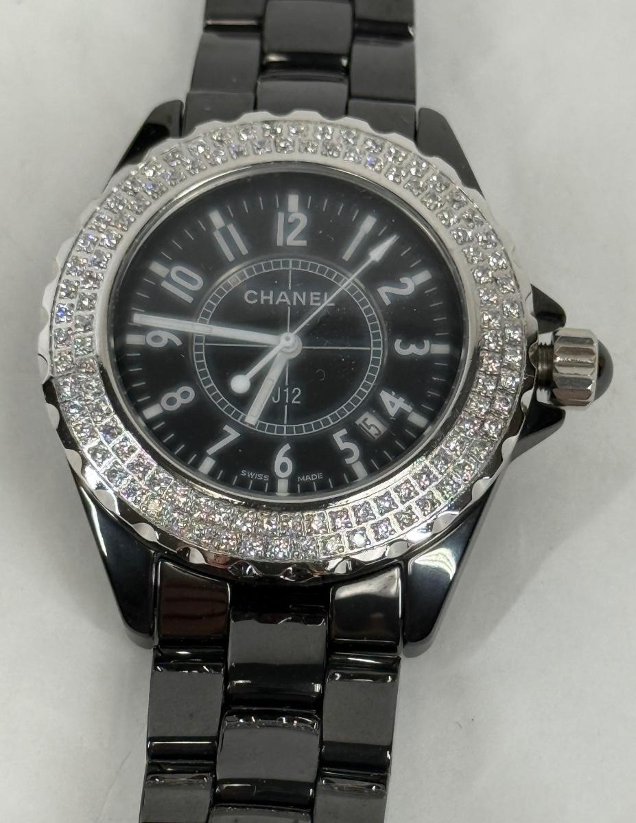In good used condition. Style is similar to the Chanel J12 Diver's watch, with rotating encrusted bezel. Not working, may simply need a new battery. Has a date window on the dial between the 4 & 5 position. Stored in a Chanel Sunglasses case.