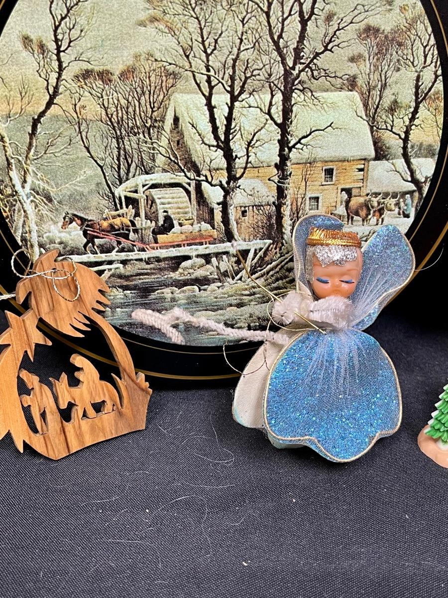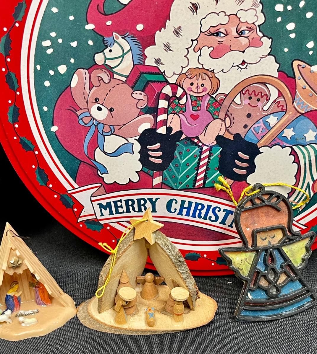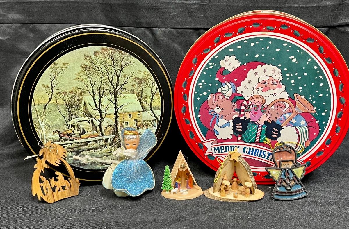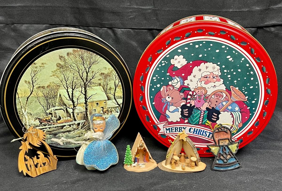 Mixed Lot of Christmas Holiday Ornaments and Collector Tin Canisters. In good vintage condition.