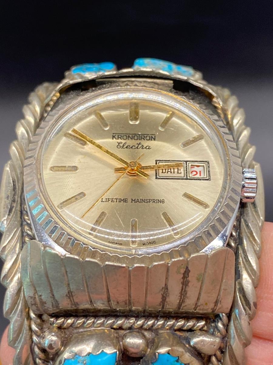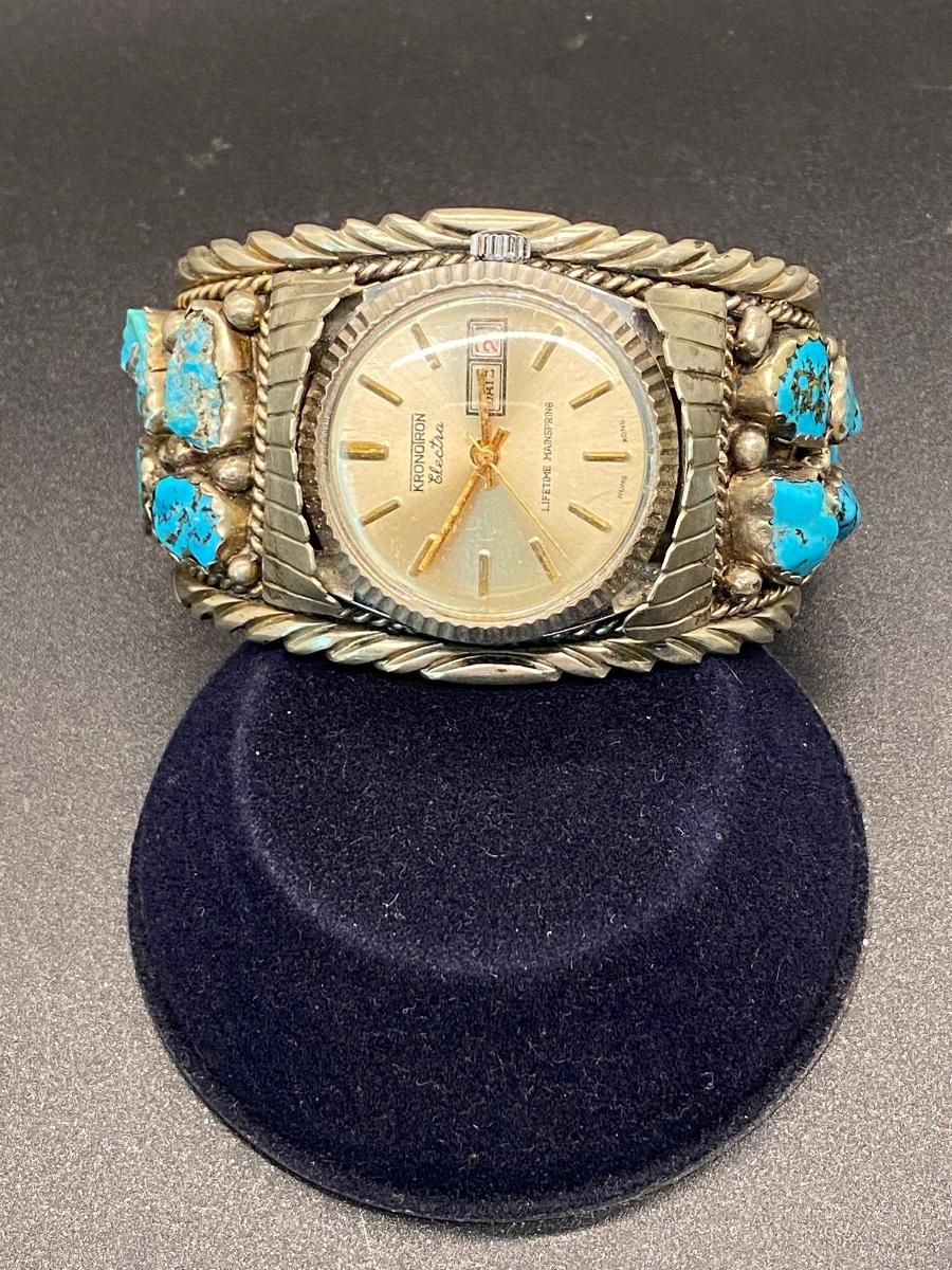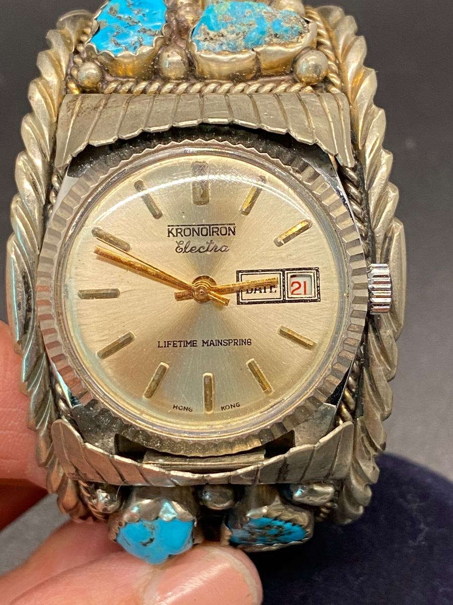 Men's vintage southwestern old pawn turquoise cuff watch. Large rough polish turquoise on the sides, stamped metalwork. Has a Kronotron wind up watch face in it that works. Looks like sterling but could not find any definite marks. Heavy. about 1.5" wide at the widest part.