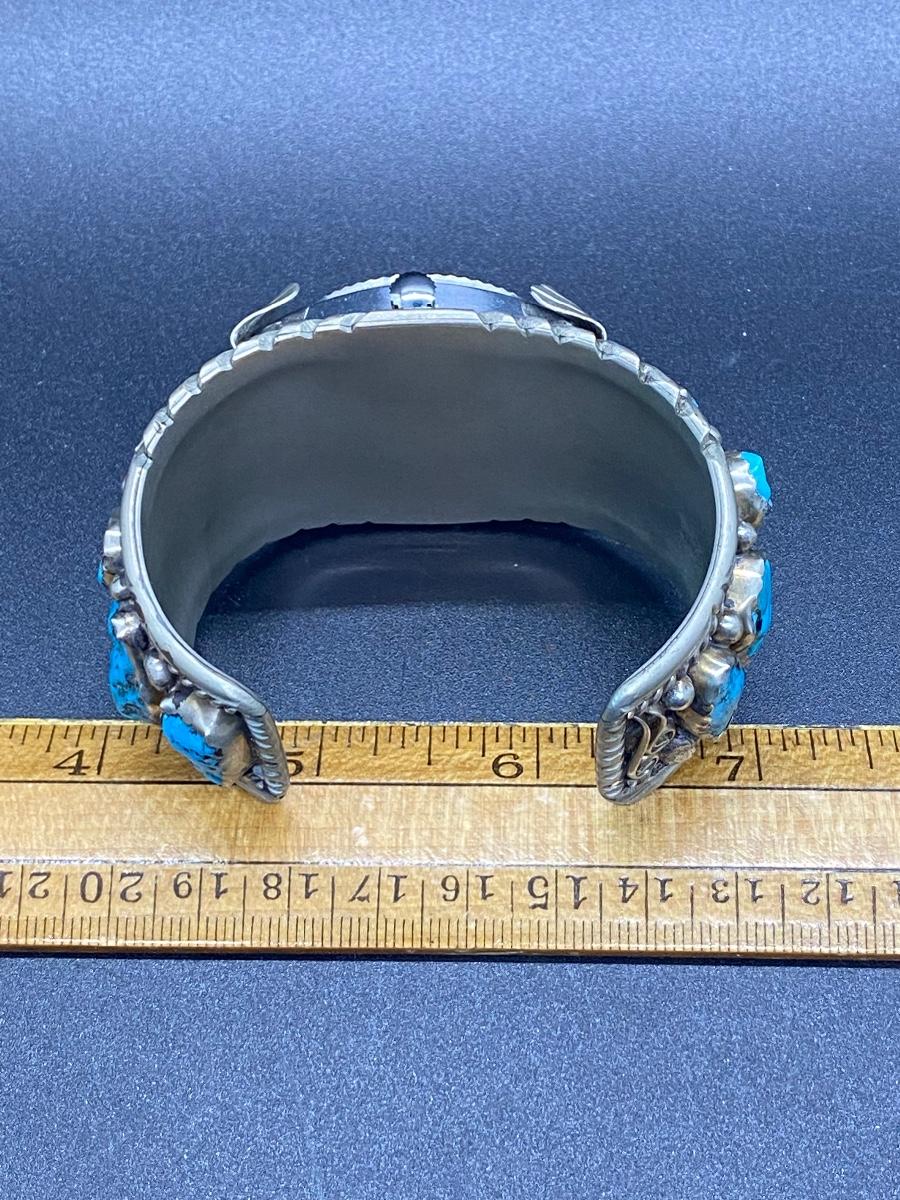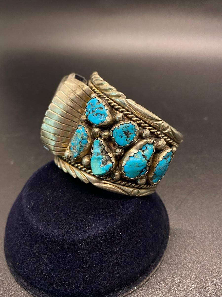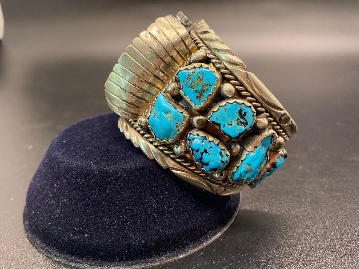 Men's vintage southwestern old pawn turquoise cuff watch. Large rough polish turquoise on the sides, stamped metalwork. Has a Kronotron wind up watch face in it that works. Looks like sterling but could not find any definite marks. Heavy. about 1.5" wide at the widest part.