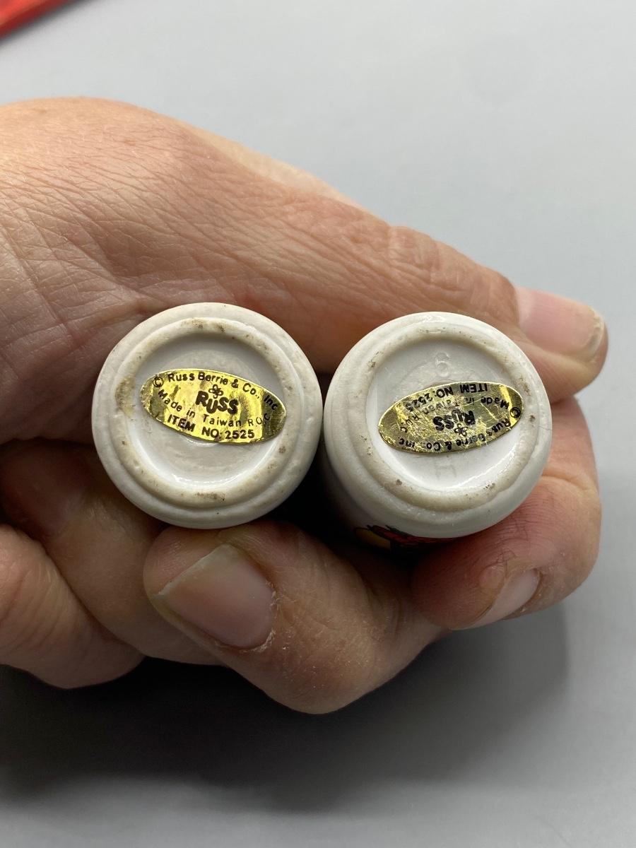 Pair of Vintage Halloween Autumn Fall Miniature Tiny Candle Holders. About the size of a thimble. Feature jack-o-lantern, moon, and haystack. Made by Russ.