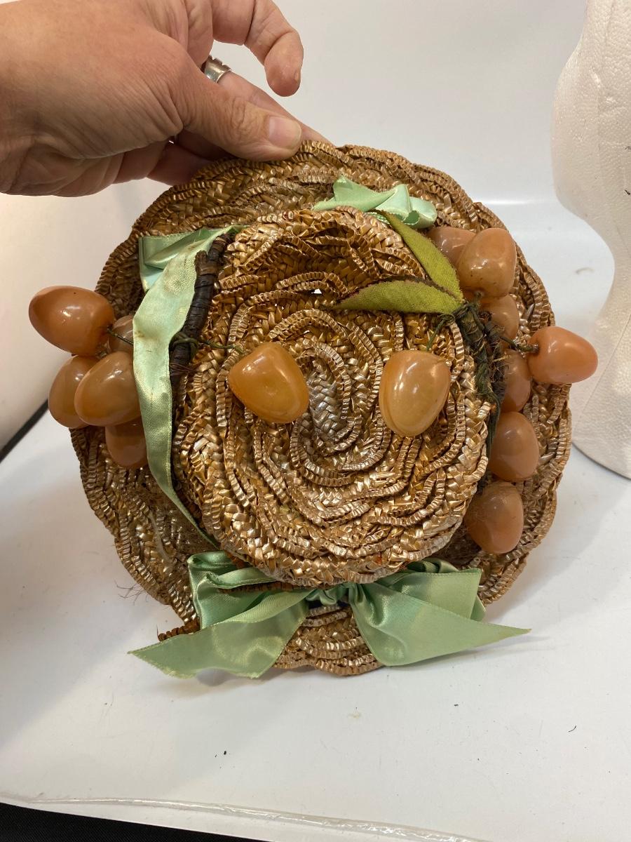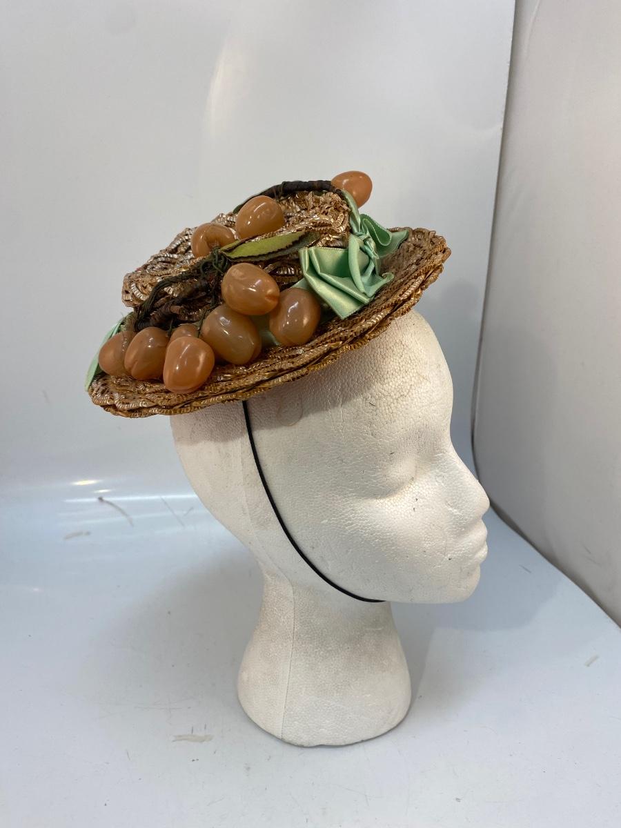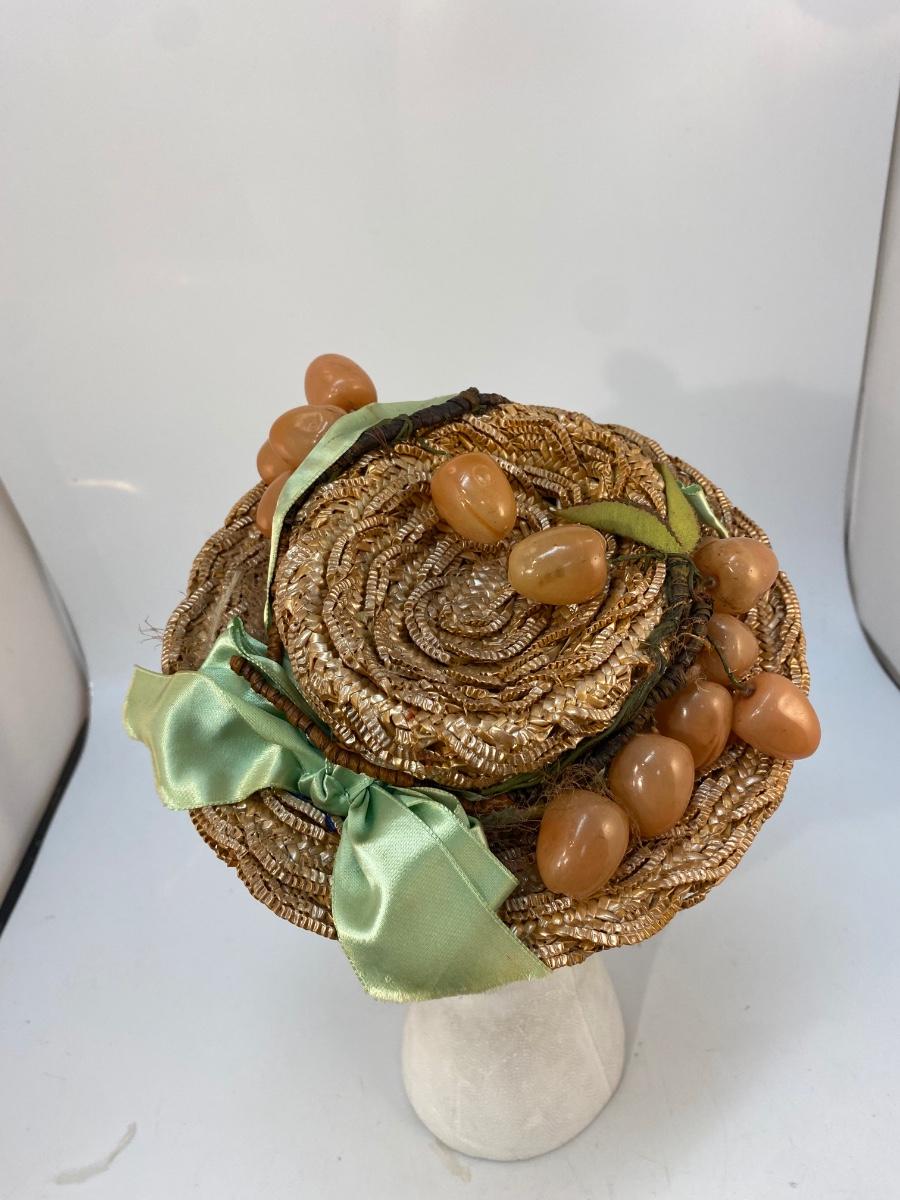 Vintage Antique Small Straw Hat Fascinator Laddie Northridge. In good vintage condition. Nicely woven with green ribbon and artificial fruit.