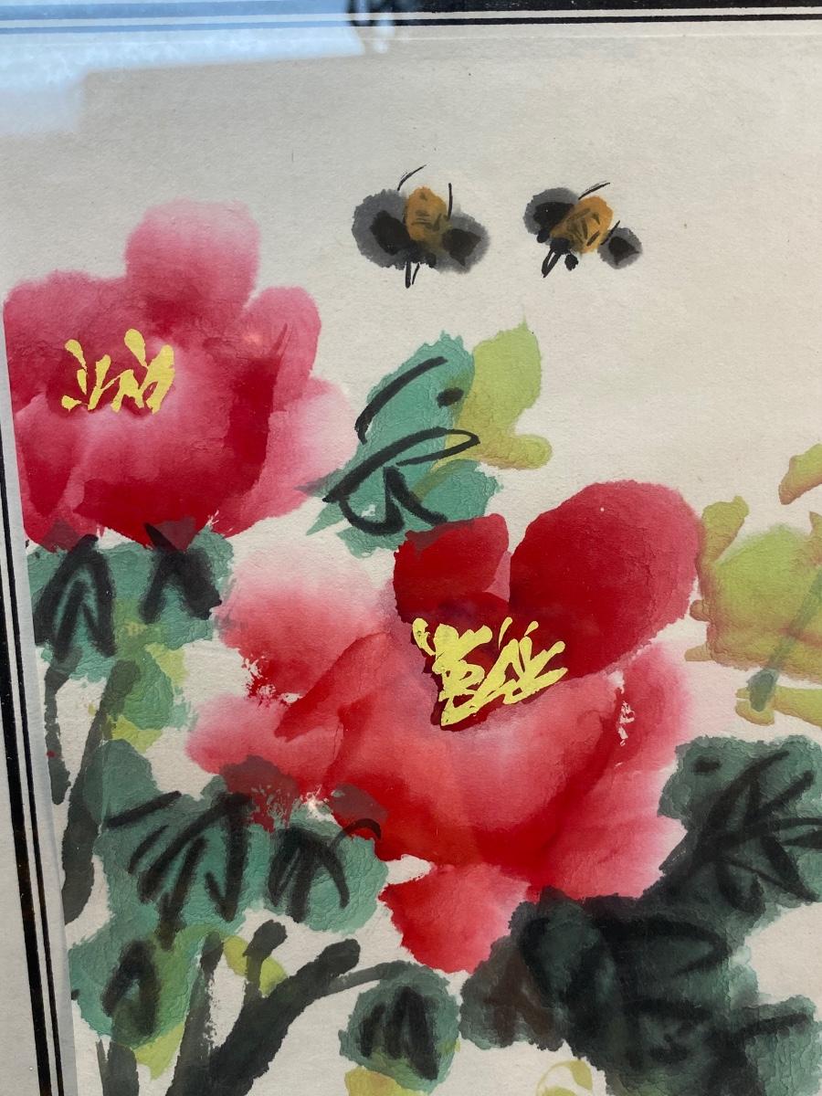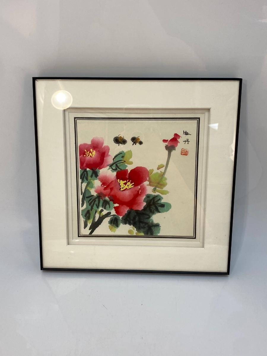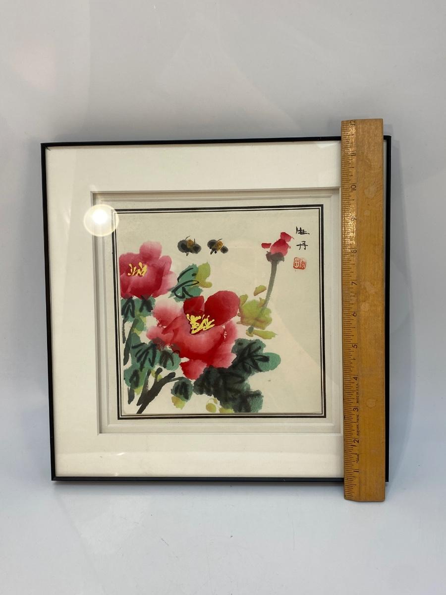 Asian Style Watercolor Painting Flowers and Bees. 12" frame.