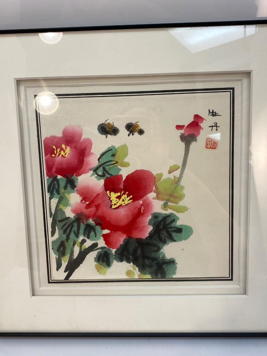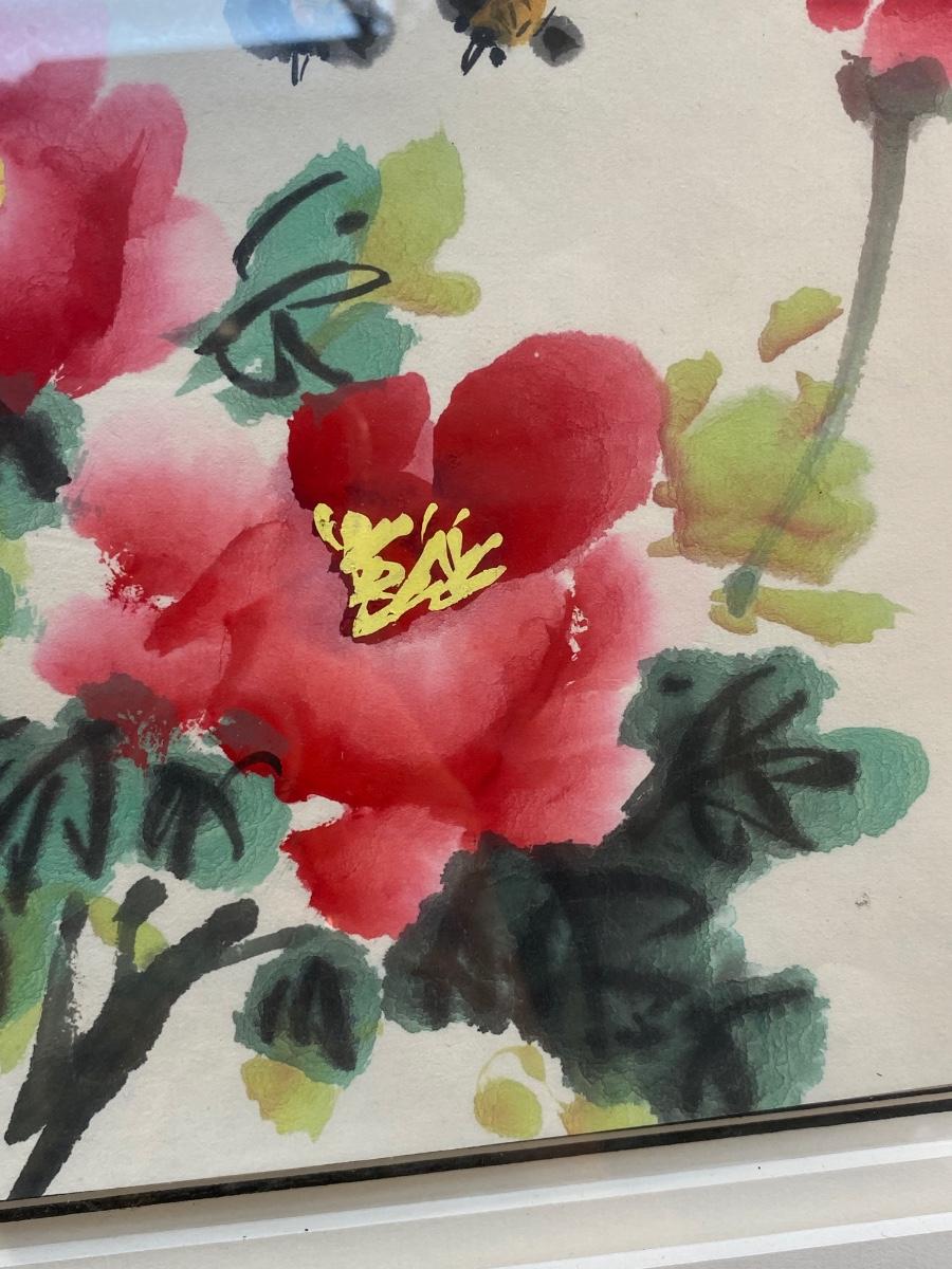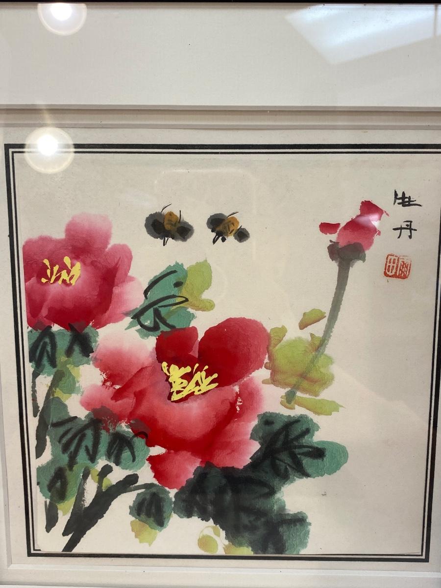 Asian Style Watercolor Painting Flowers and Bees. 12" frame.