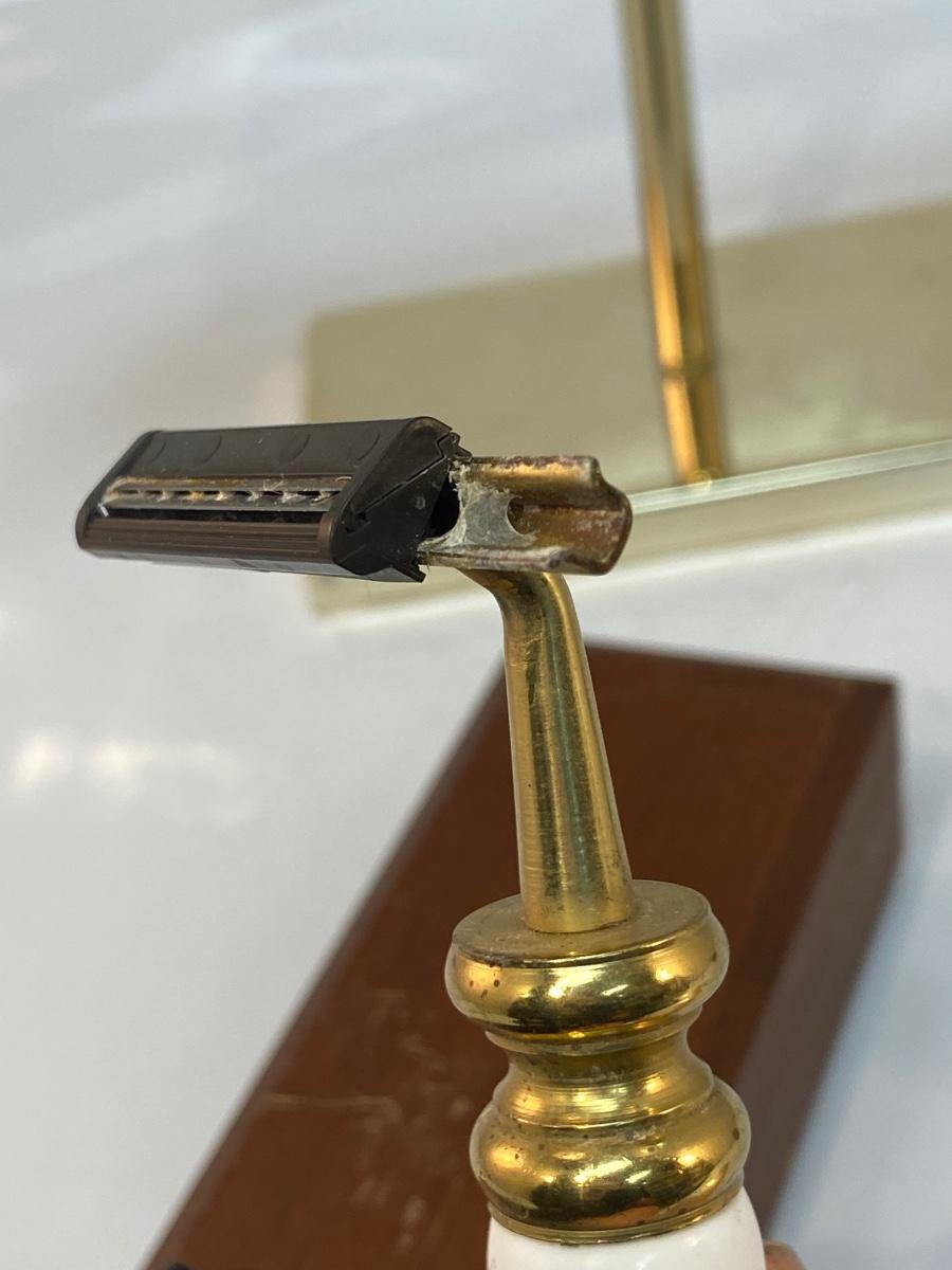 Vintage Porcelain Handled Shaving Razors Mallard Ducks Pattern with Wood Box. Does not take a razor blade, takes removeable heads that slide on and off. Handle is in good condition. Unsure if the box is original or used because razor fit.