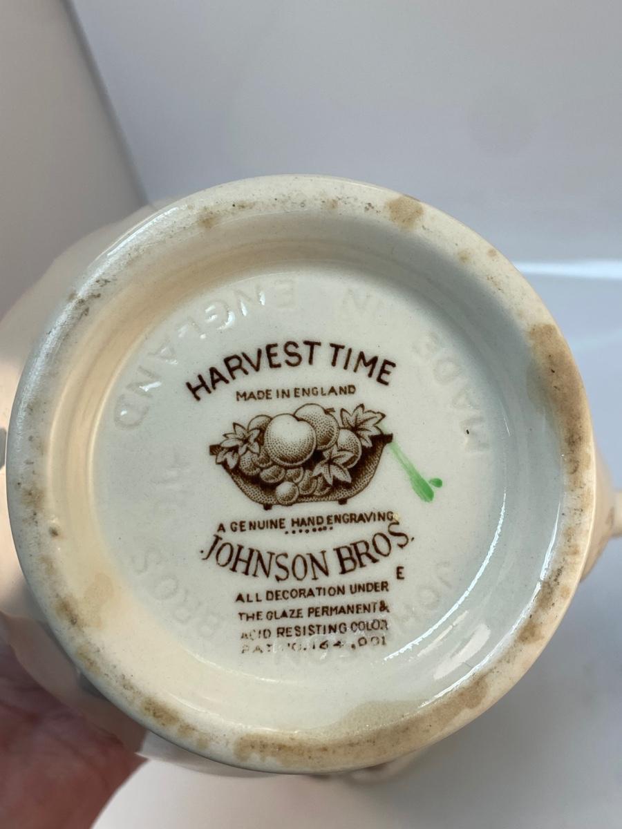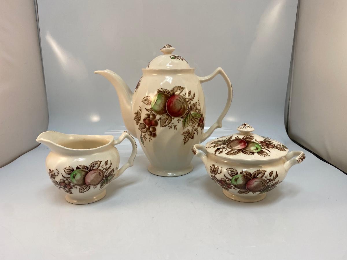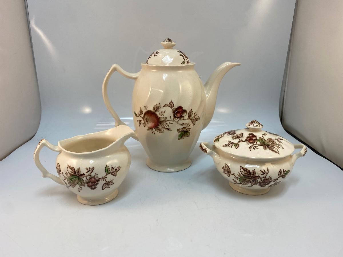 Three Piece Harvest Time Johnson Brothers England Tea Coffee Serving Set. Taller coffee style urn/pot, cream pitcher, and a lidded sugar bowl. In good condition, no chips, may have crazing.