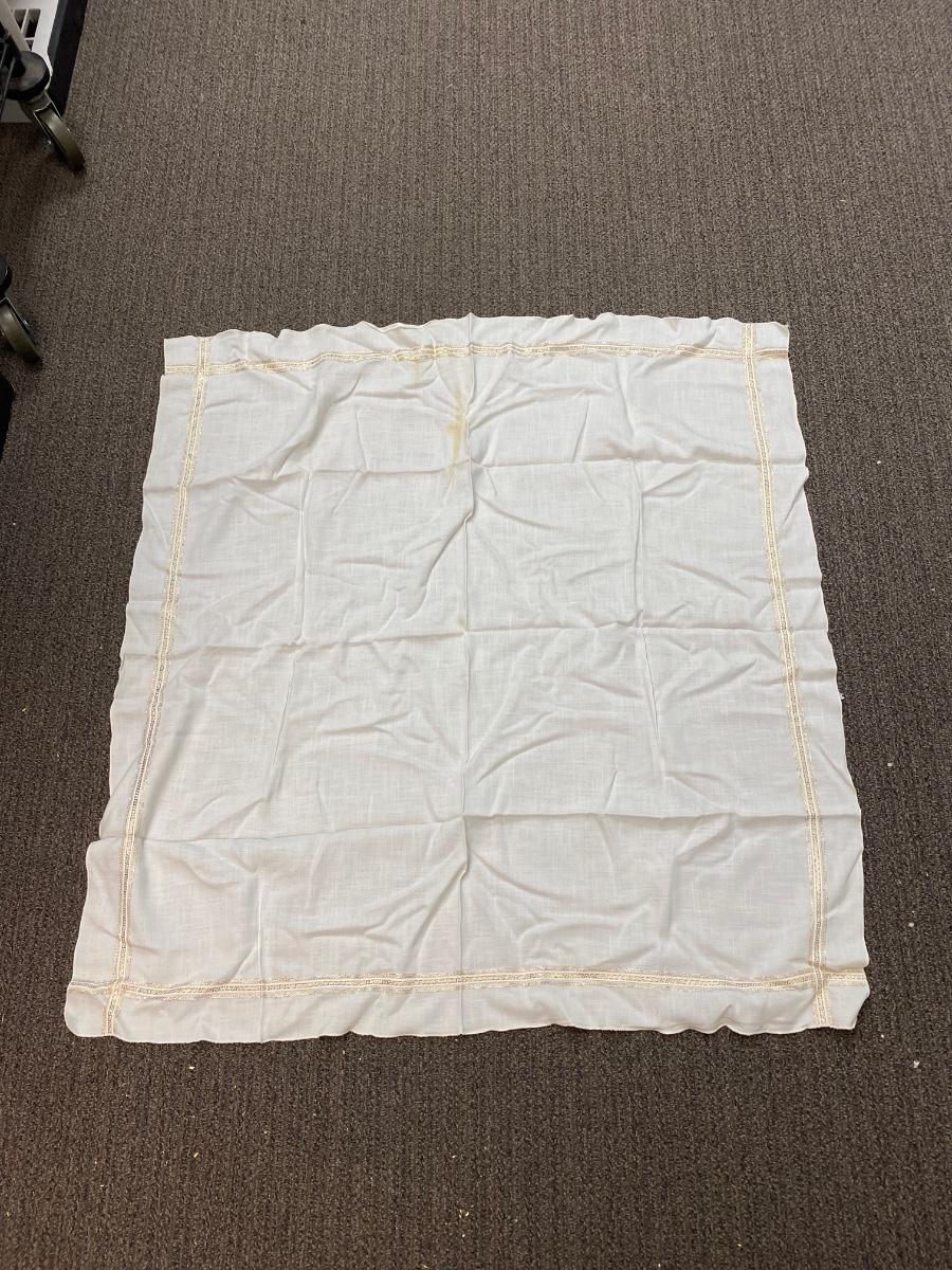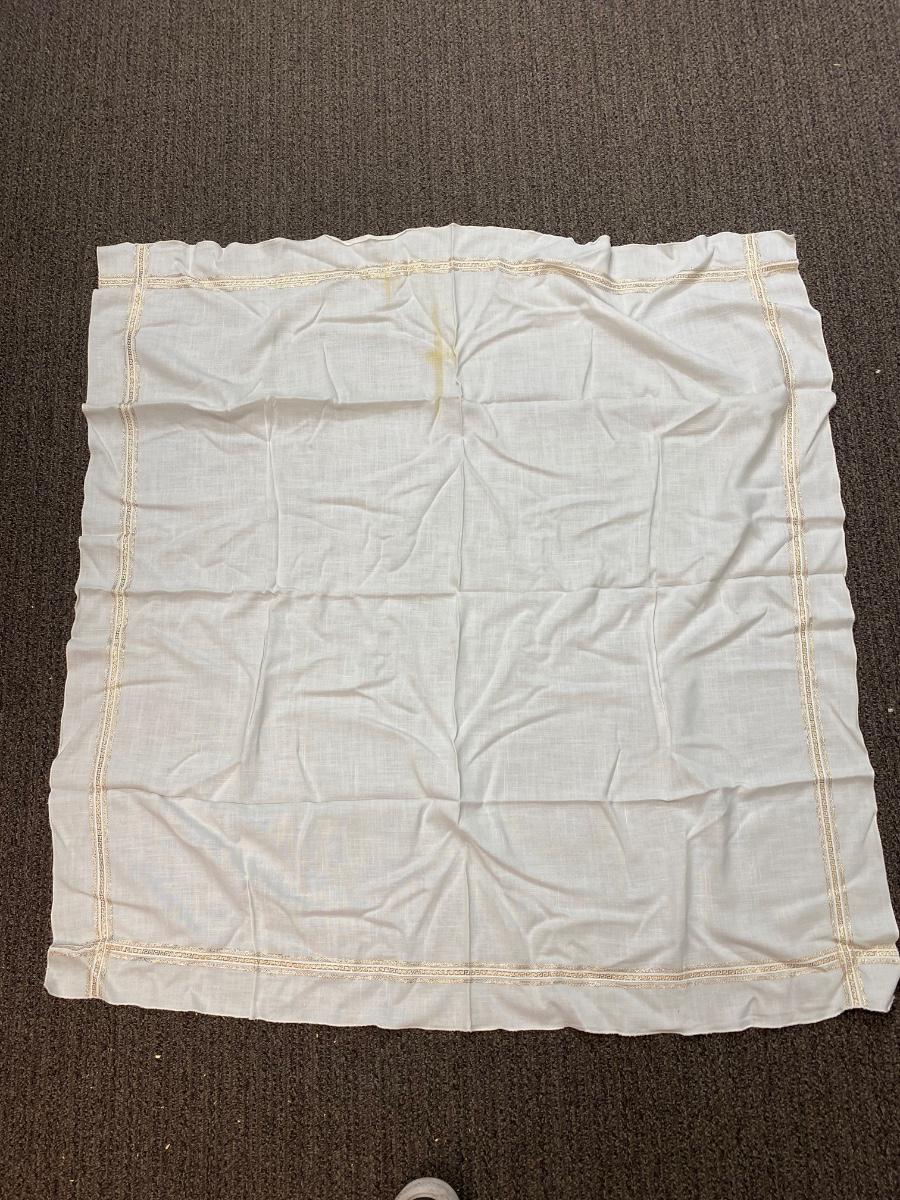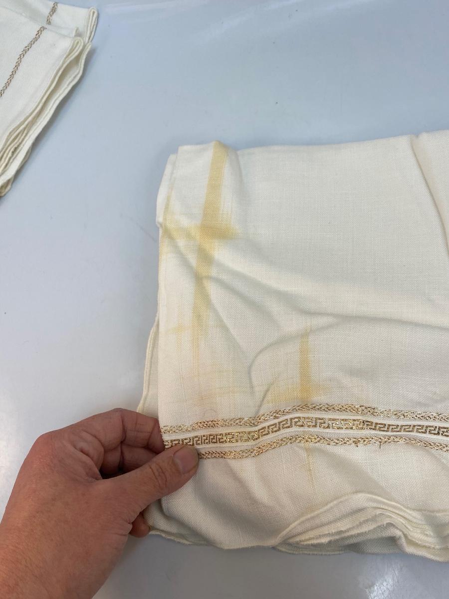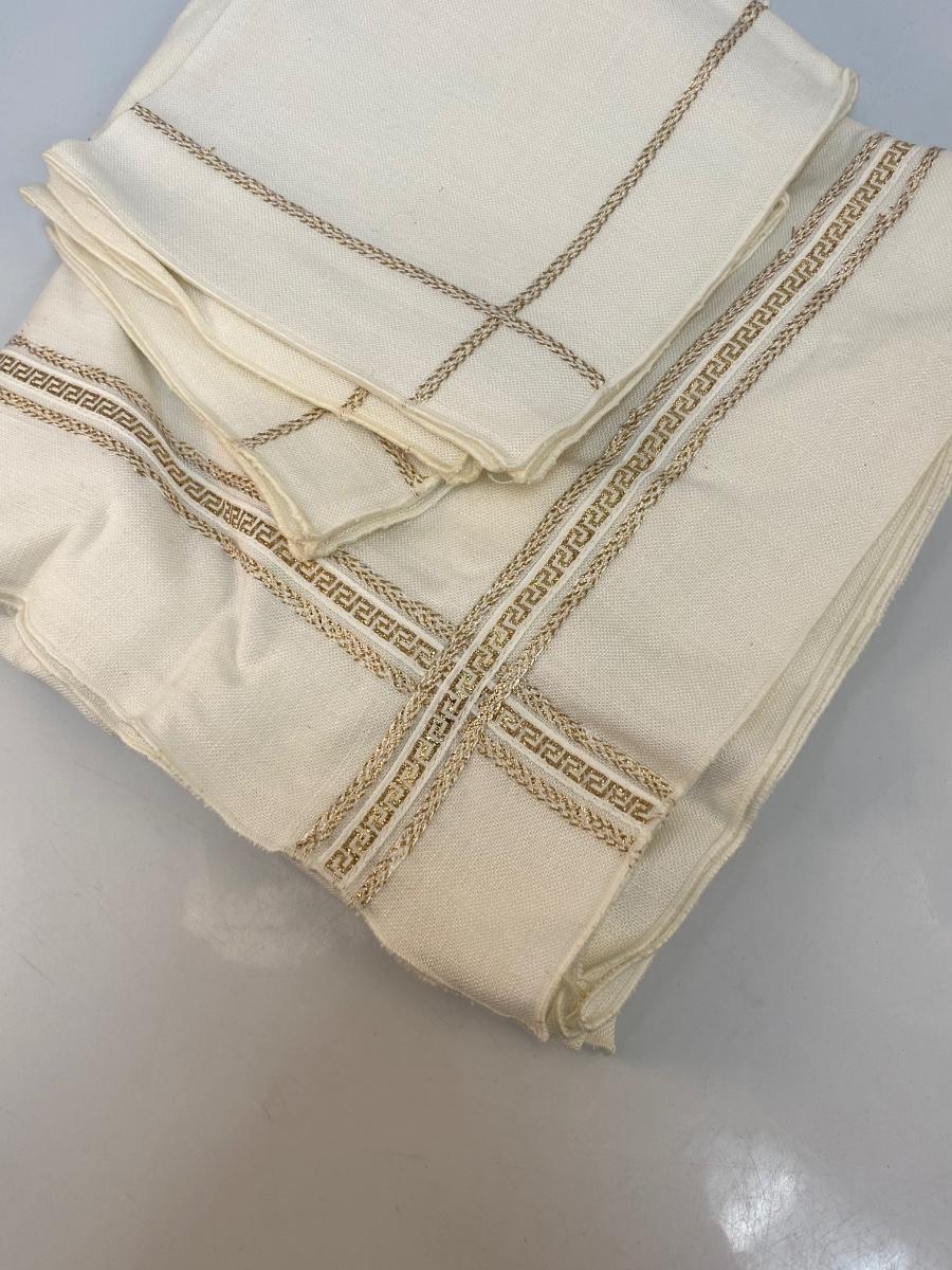 White & Gold Metallic Greek Key Edge Tablecloth and Napkin Set. In vintage condition. Tablecloth is about card table size. There is some staining on one edge.
