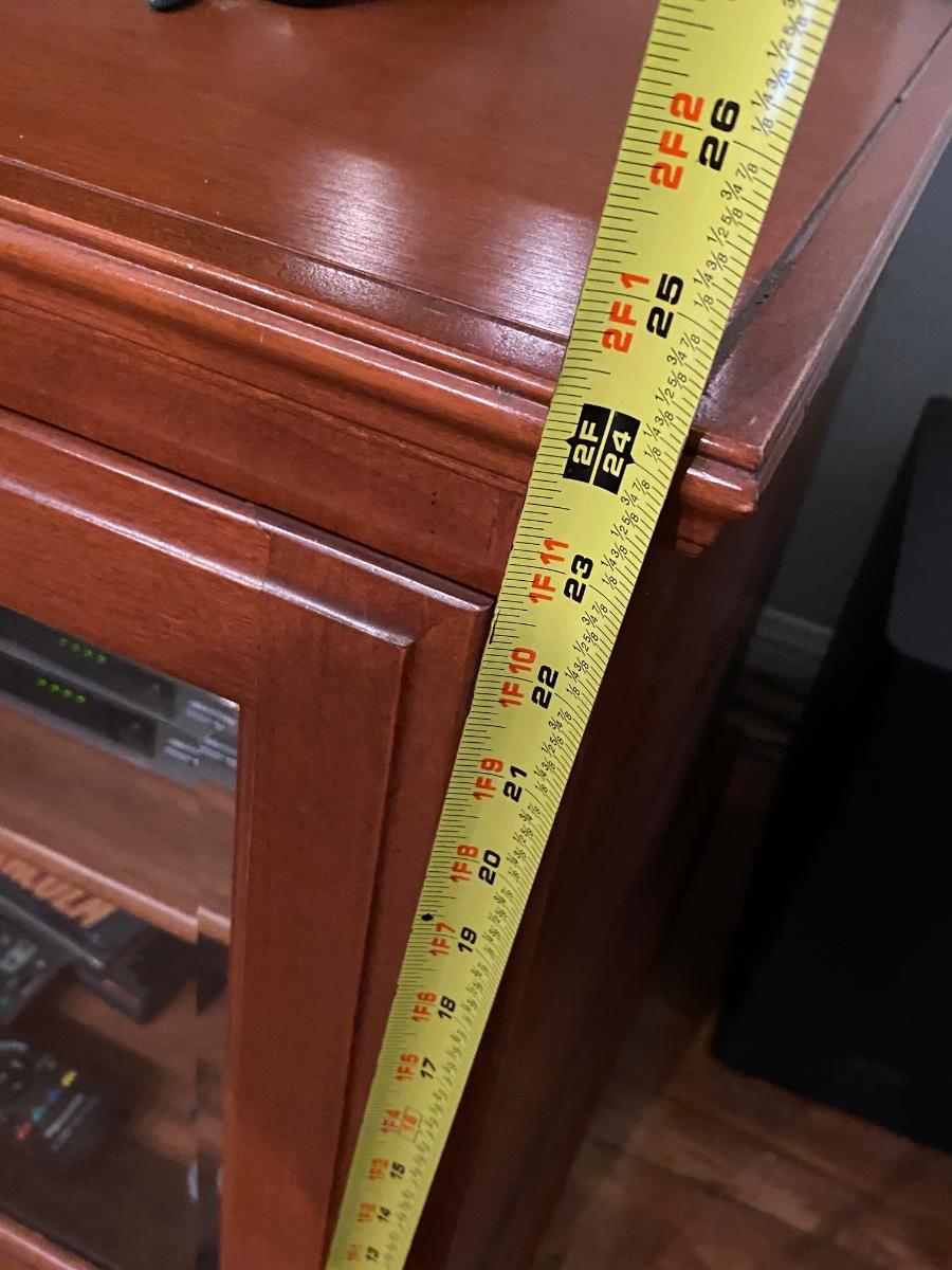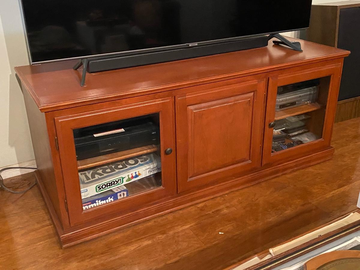 Wood Three Door Cabinet TV Stand Media Center Console Table. In good used condition. Each cabinet space has a single shelf. Glass door fronts on outer cabinets. About 5' length, 24" tall and 24" deep.