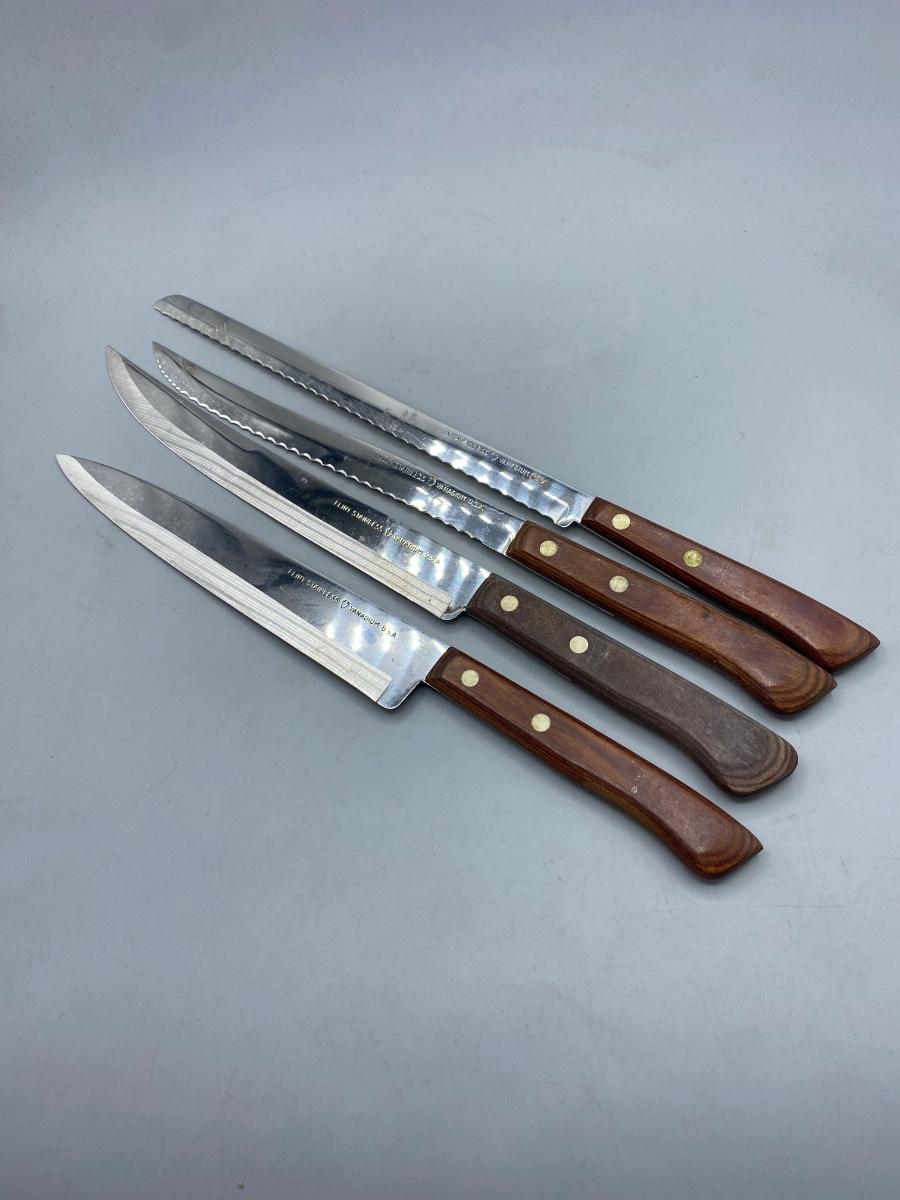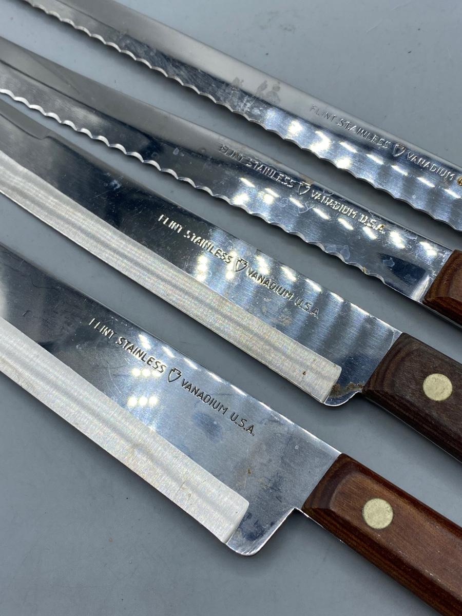 Set of 4 Flint Stainless Vanadium USA Kitchen Knives Cutlery. Four different blade styles with wood handles. In good previously used condition.