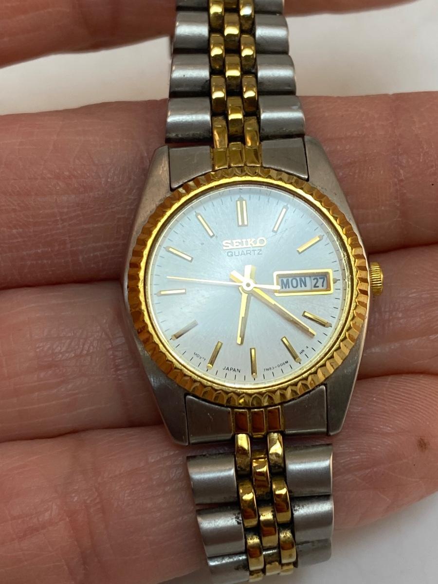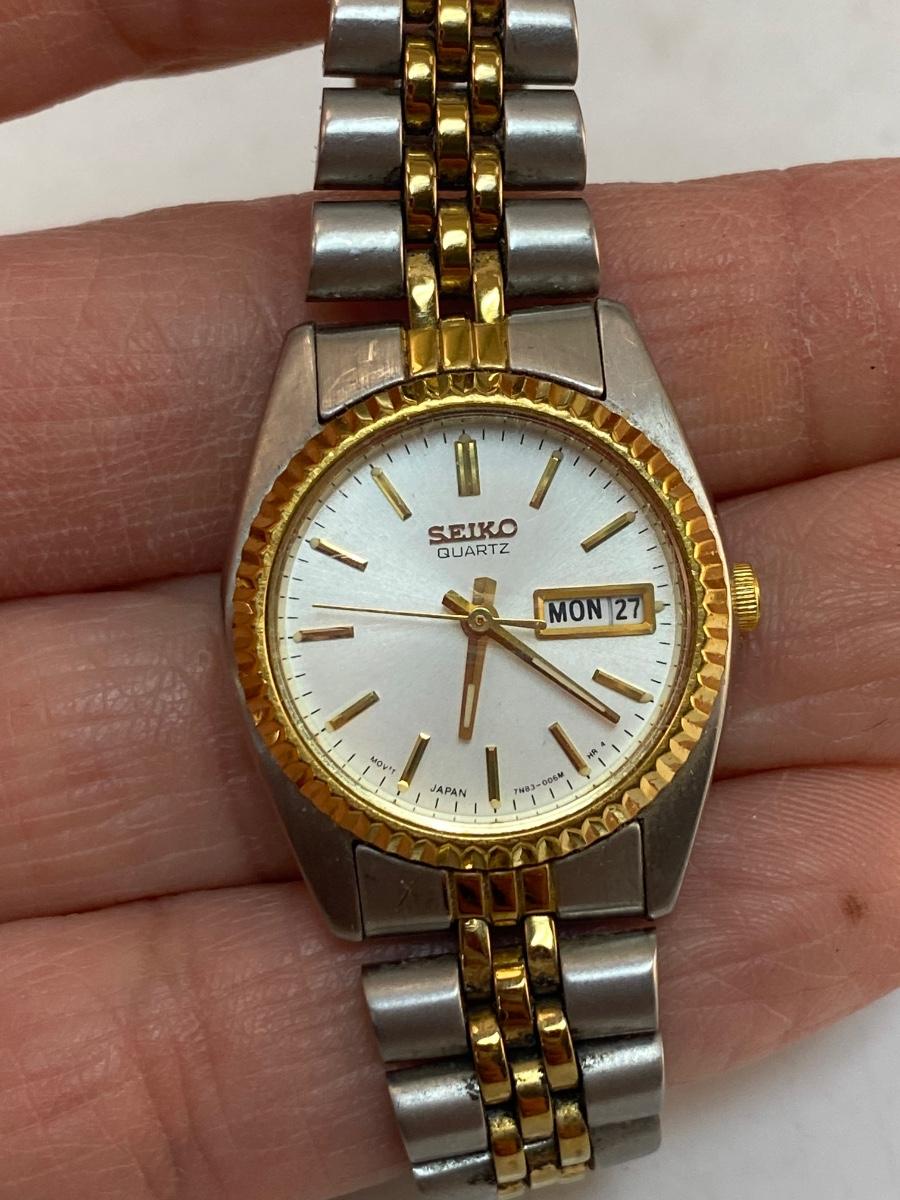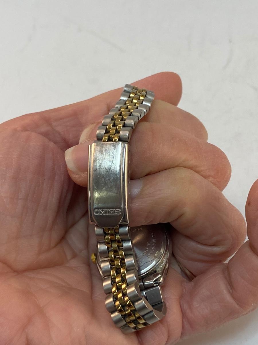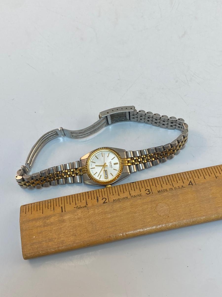 Stainless Steel and Gold Tone Womens Seiko Quartz Watch Timepiece Date and Time. In good condition. Face looks scratch free. Not running, in need of new battery.