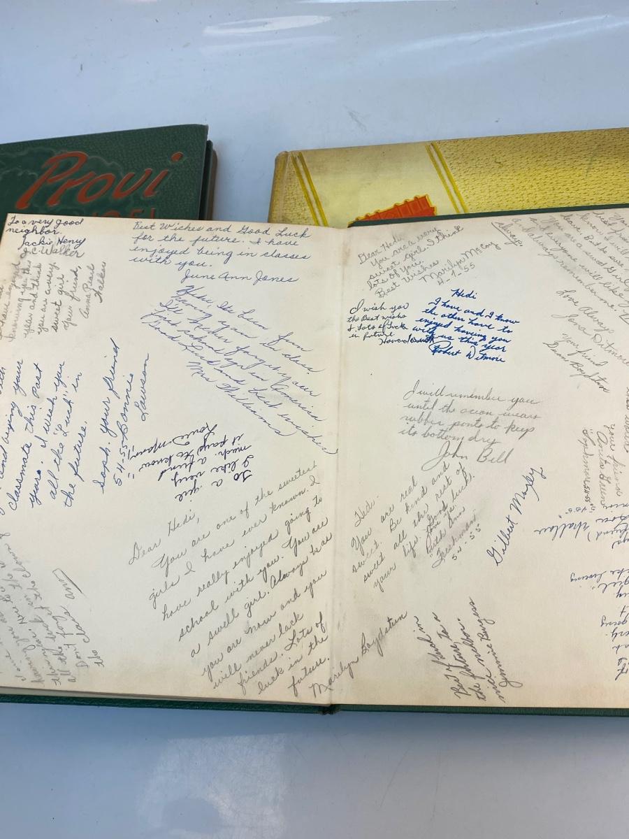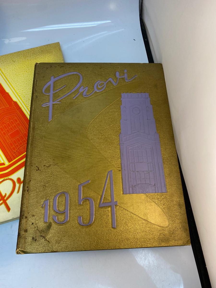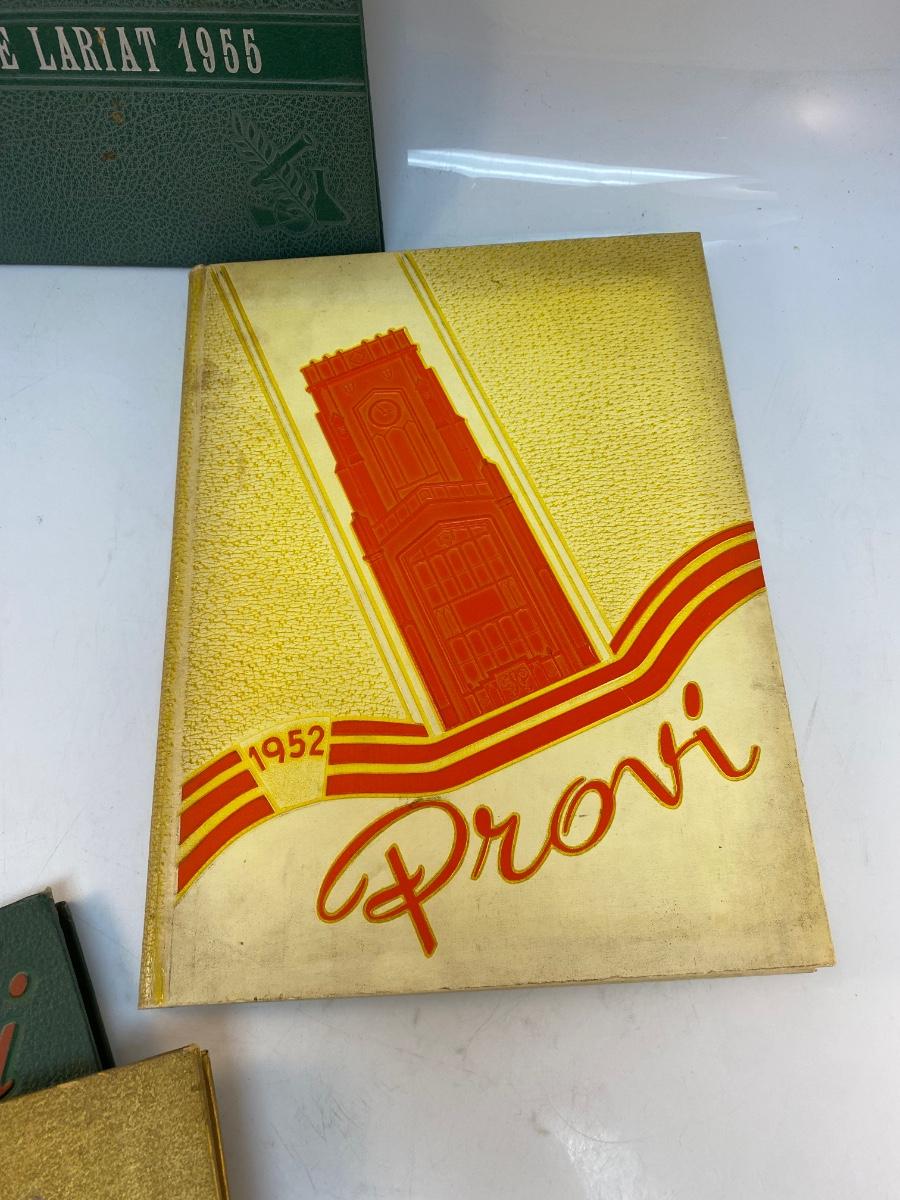 Lot of 4 Mid 1950s High School Year Books The Lariat & Provi. The Lariat is from a school in Oklahoma that housed kids from first grade through their senior year. It is the only book with classmate signatures. The other three are unwritten in, from a different school in Illinois.
