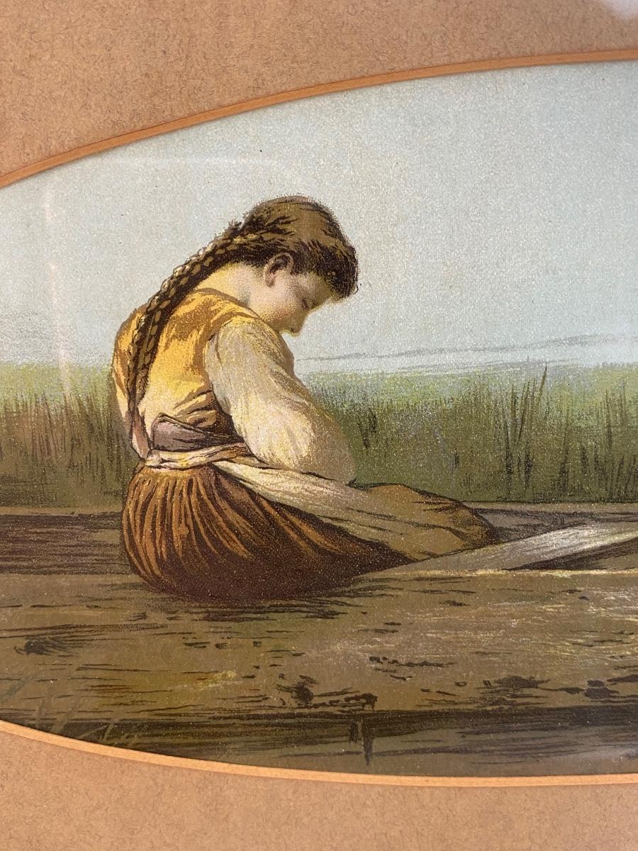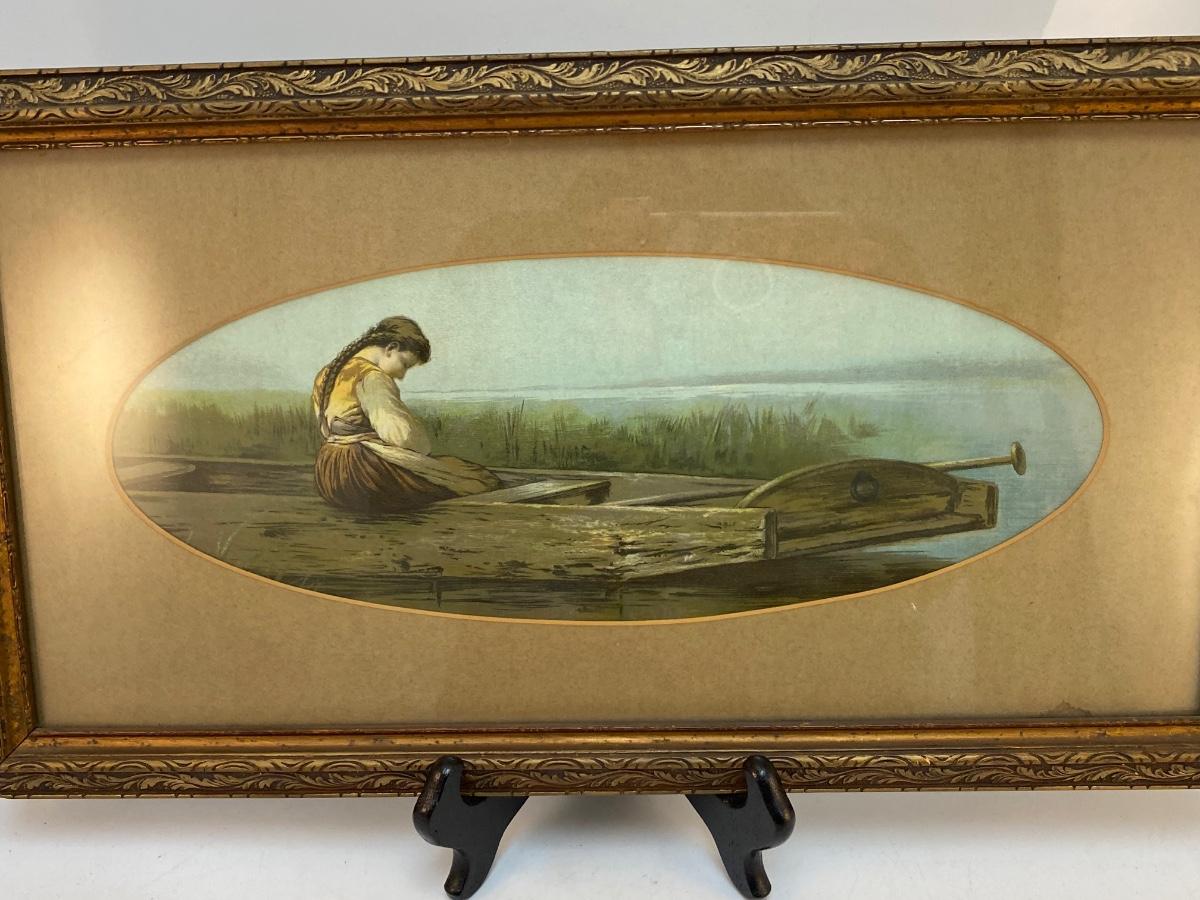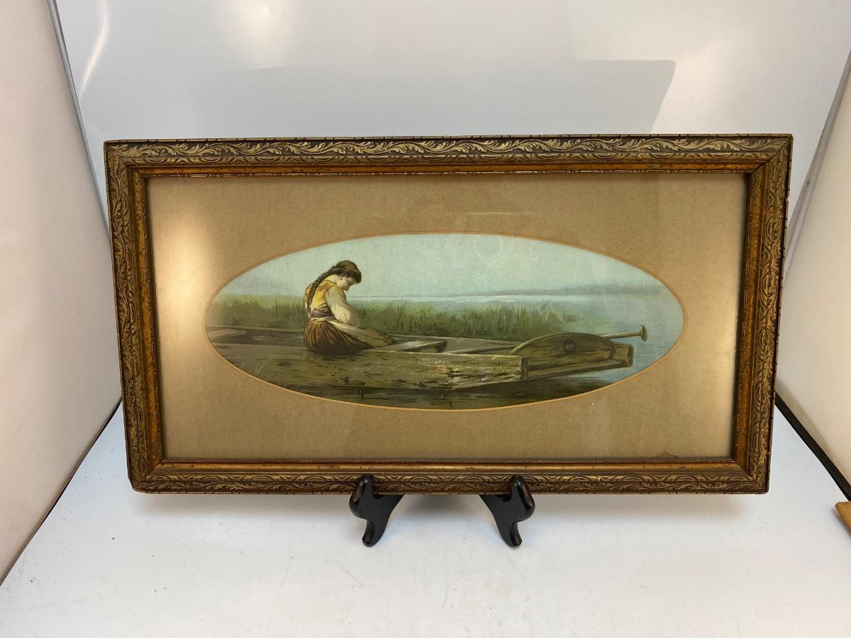 Vintage Framed Print Alone and Forsaken by H Vosberg CIRCA 1887 Sad Girl in Boat. In good condition. About 17.5"x9.5" size. Online searches have this as a picture Lizzie Borden gave to a handyman. Did not remove to see if there were any signatures.