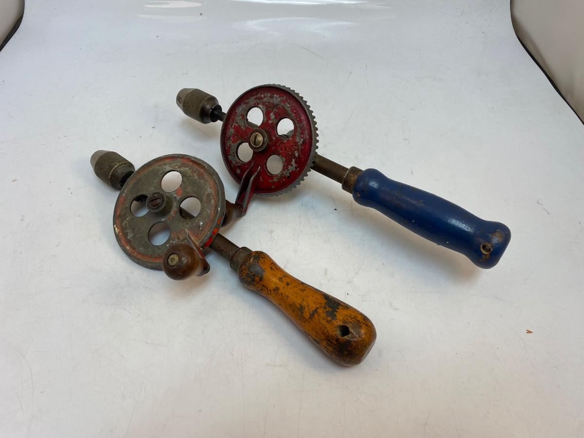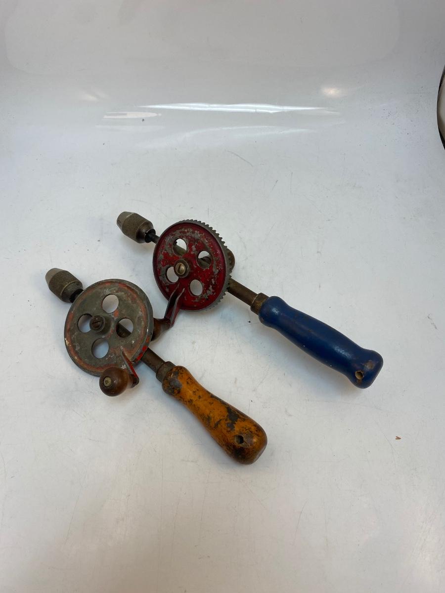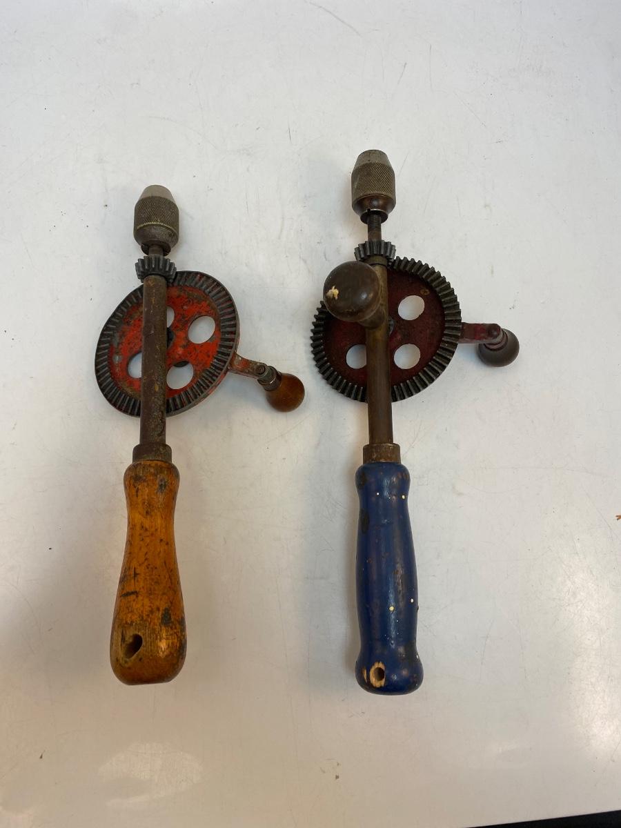 Pair of Vintage Wood Handle Manual Crank Straight Egg Beater Type Drill. A bit of wear from use and age but both turn nicely.