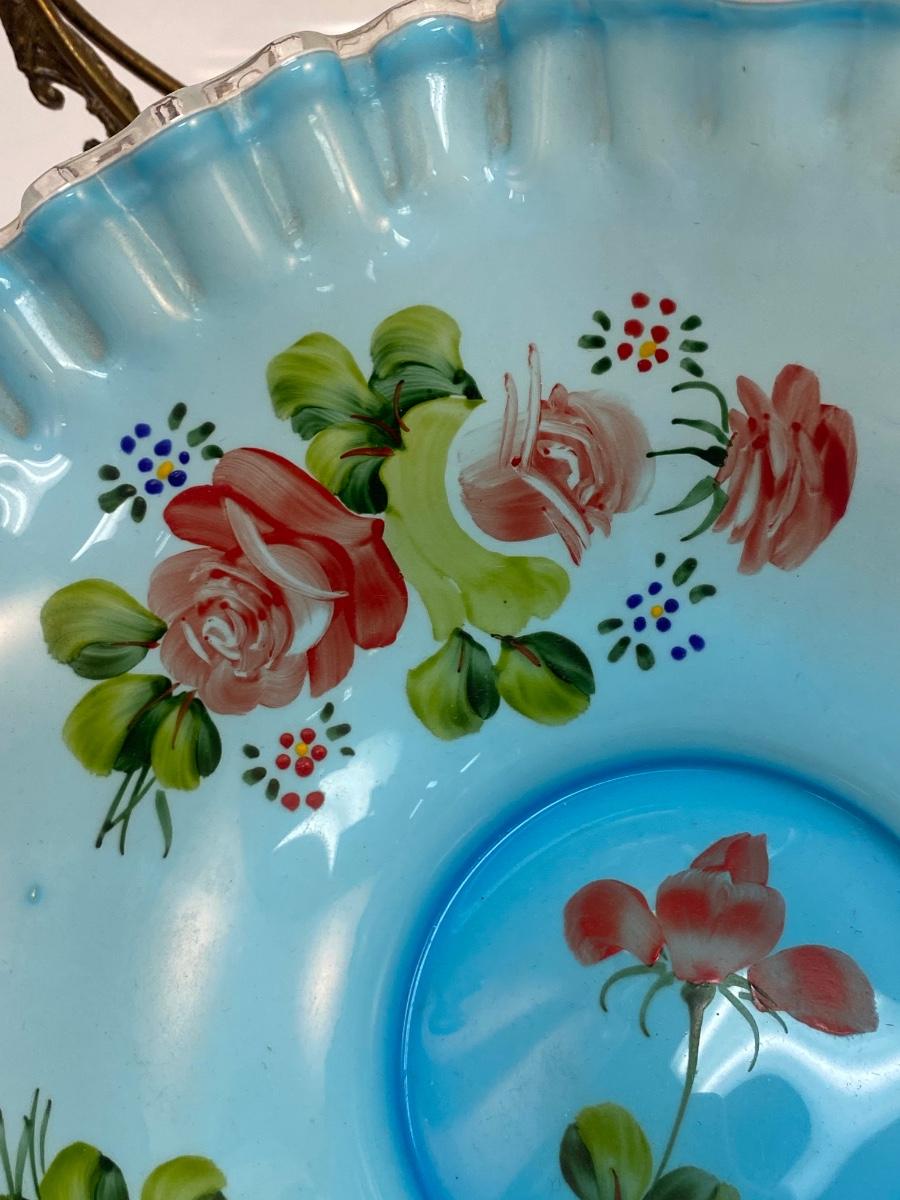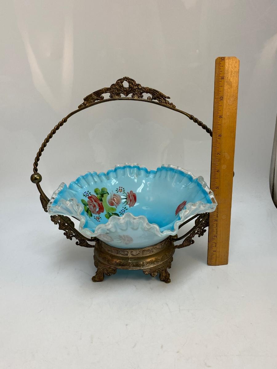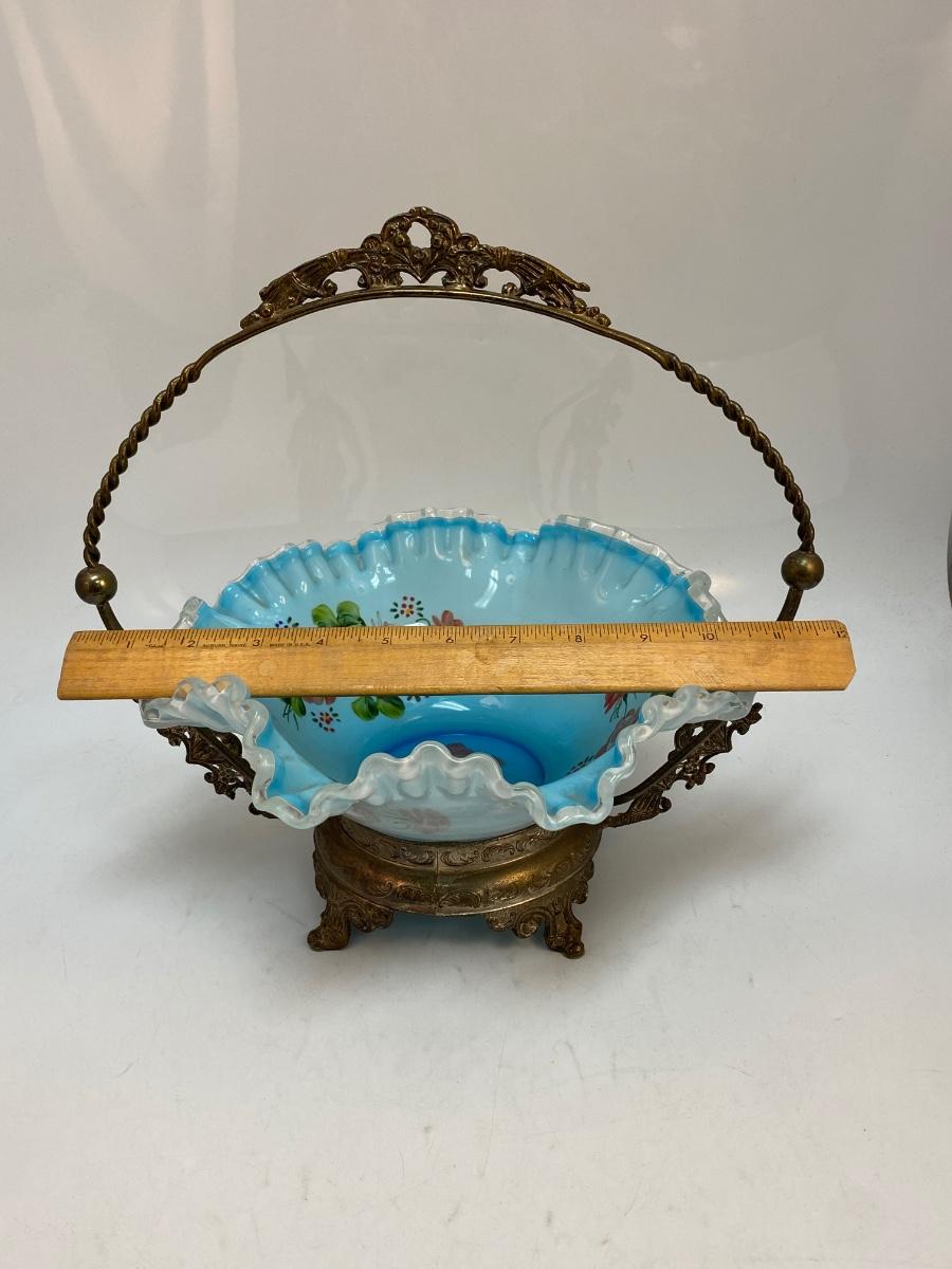 Vintage Ruffled Edge Turquoise Blue Fenton Glass Hand Painted Floral Brides Wedding Basket. In good antique vintage condition. Painted flower design is vibrant, little signs of age. The bowl is removeable from the metal basket. Basket does seem a slight bit tweaked, easy to reshape.