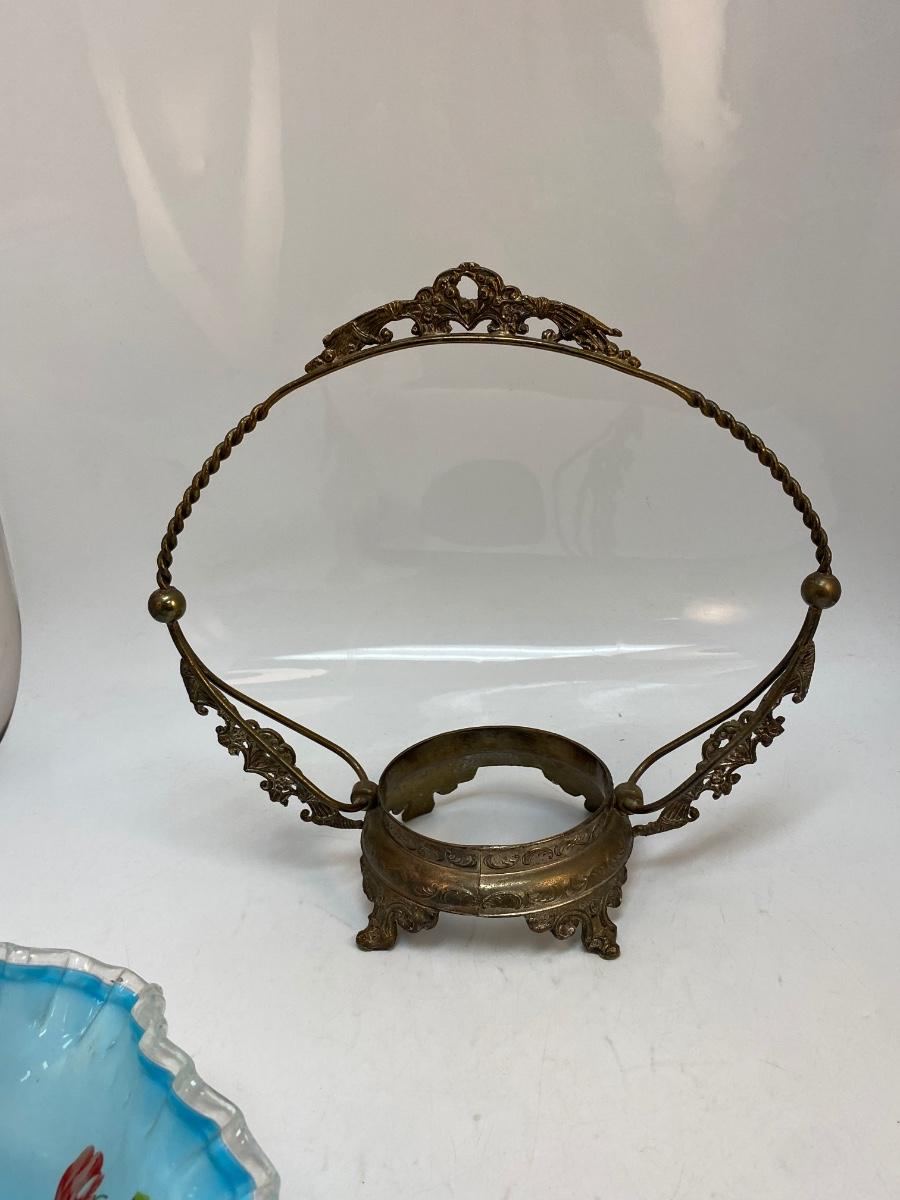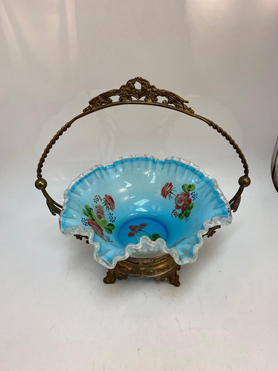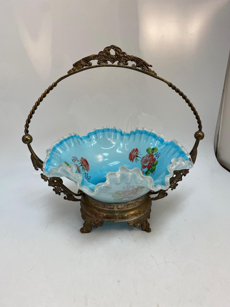 Vintage Ruffled Edge Turquoise Blue Fenton Glass Hand Painted Floral Brides Wedding Basket. In good antique vintage condition. Painted flower design is vibrant, little signs of age. The bowl is removeable from the metal basket. Basket does seem a slight bit tweaked, easy to reshape.