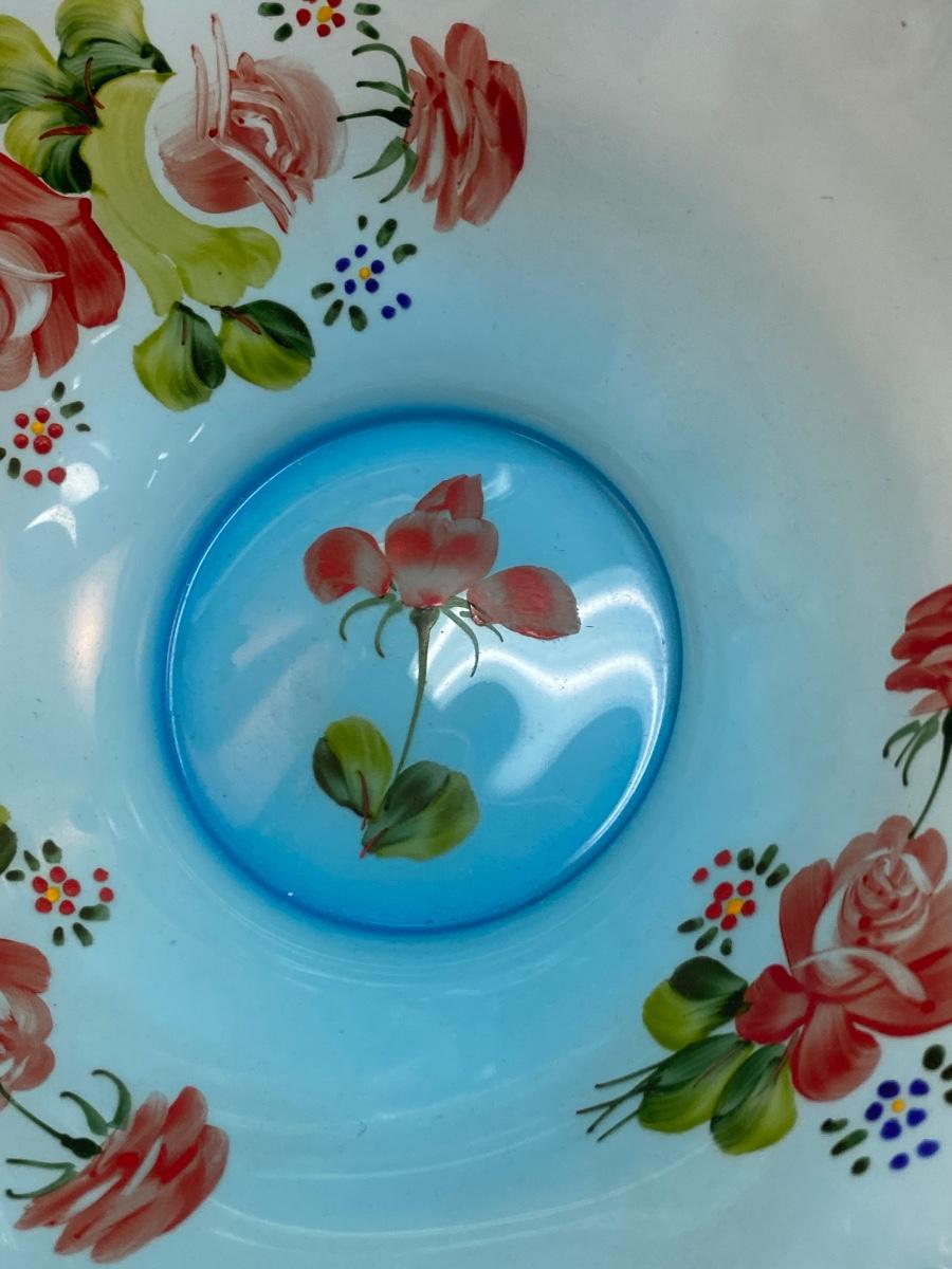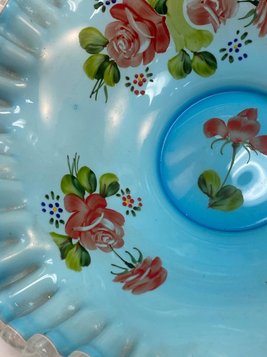 Vintage Ruffled Edge Turquoise Blue Fenton Glass Hand Painted Floral Brides Wedding Basket