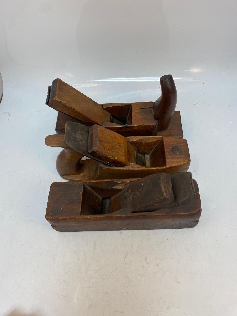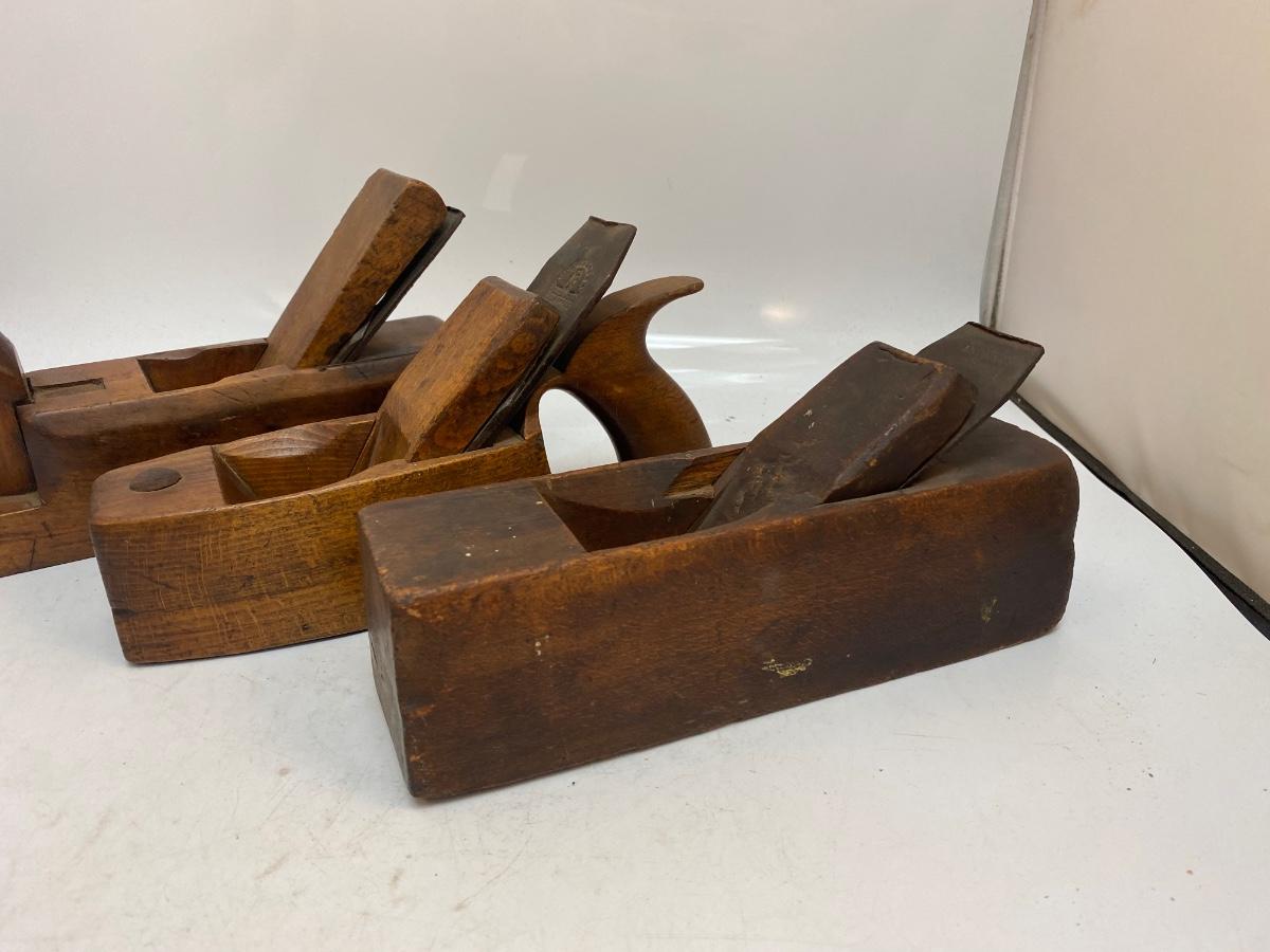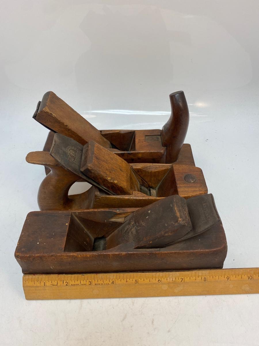 Lot of Three Antique Short Jack Block Planes Wooden Hand Grater Marked Woodworking tools