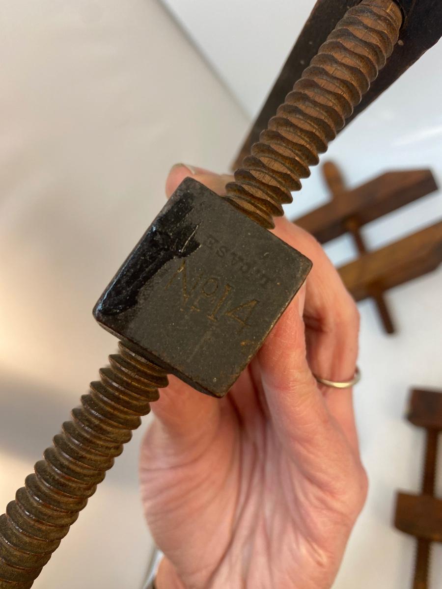 Lot of Three Antique All Wood Jorgensen Style Furniture Clamps. In good condition. May have name & number stamped in them.