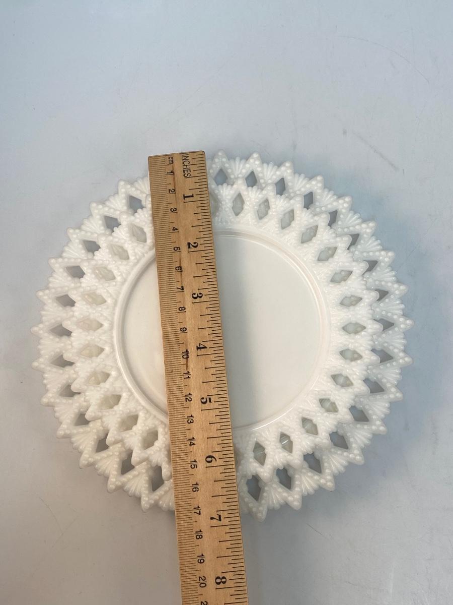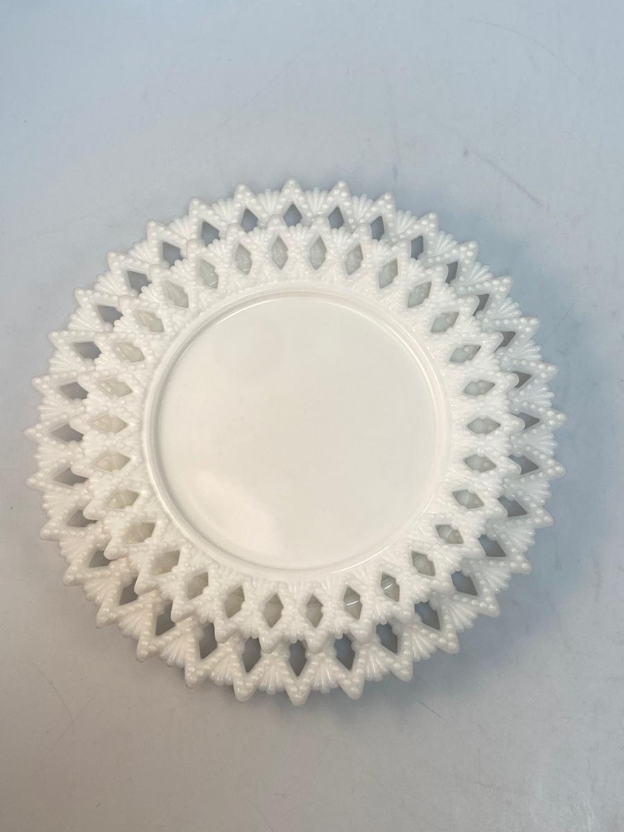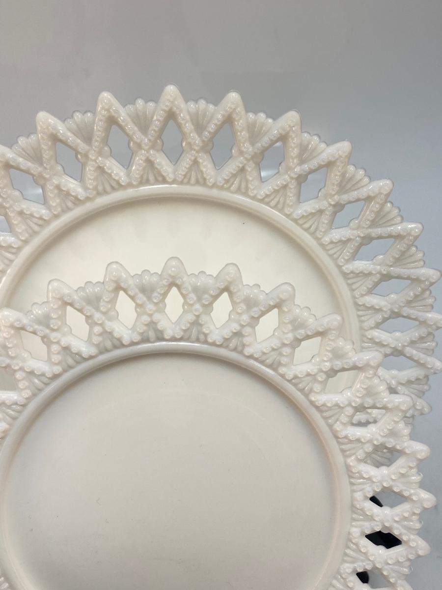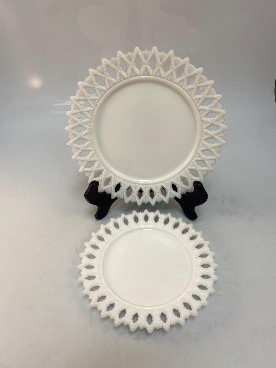 Vintage Pair of Lace Edge Milk Glass Saucer Dessert Plates. Both are in good condition. One is slightly smaller than the other.