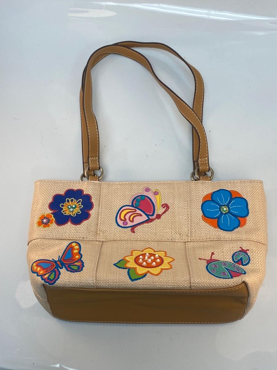 Rosetti Springtime Summer Faux Straw Purse Handbag with Colorful Flower Butterly Lady Bug Pattern. In good condition. Multiple pockets inside. About 12" opening.