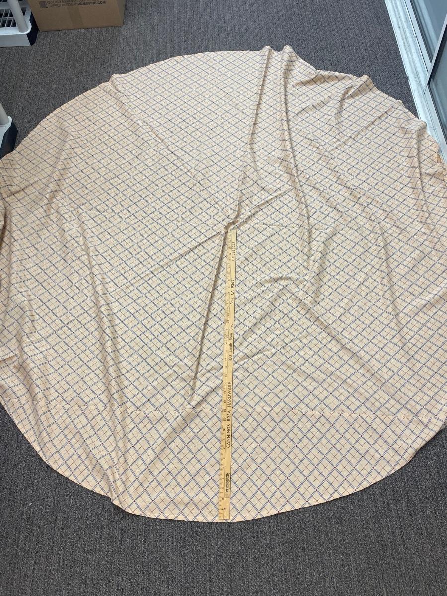 Vintage Retro Beige with Blue & Red Square Pattern Round Tablecloth. Handmade, there is an odd seam along one side where the fabric was joined to make it wide enough. About 5' size.