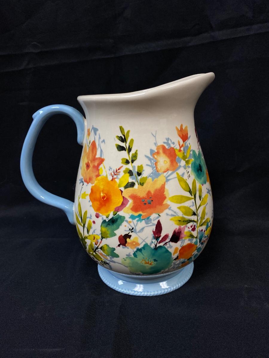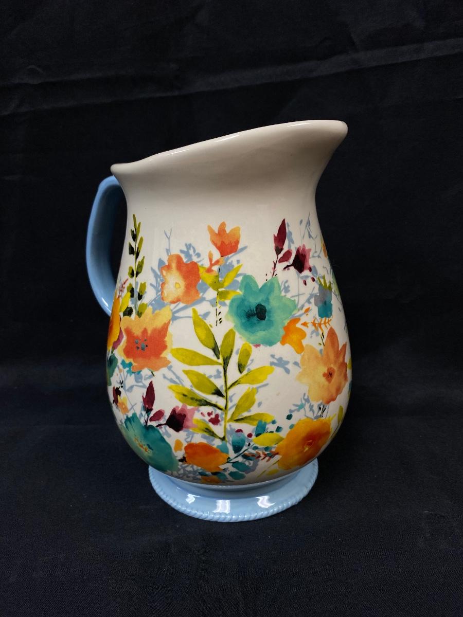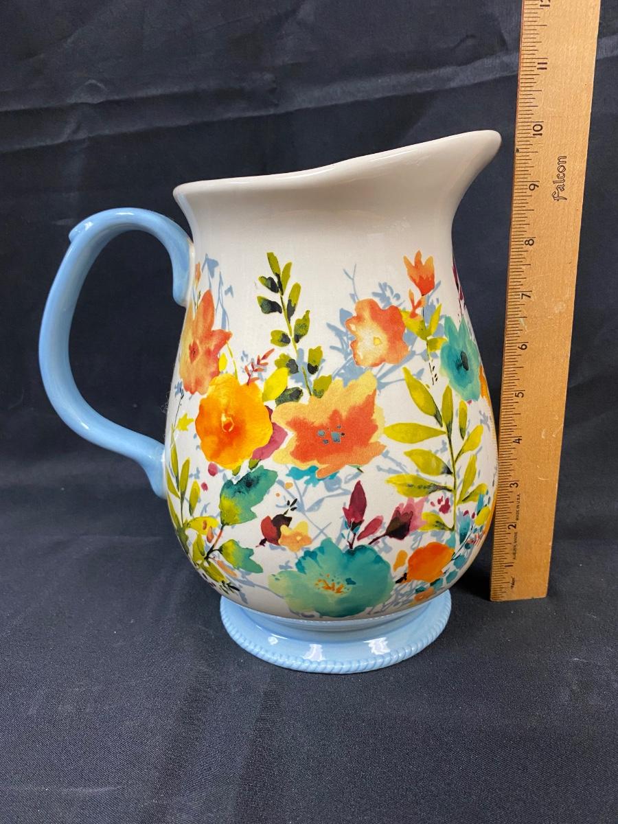 The Pioneer Woman Colorful Floral Stoneware Water Iced Tea Pitcher. In good condition. Original sticker still attached to the bottom. About 10" tall