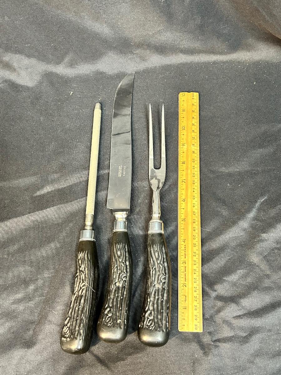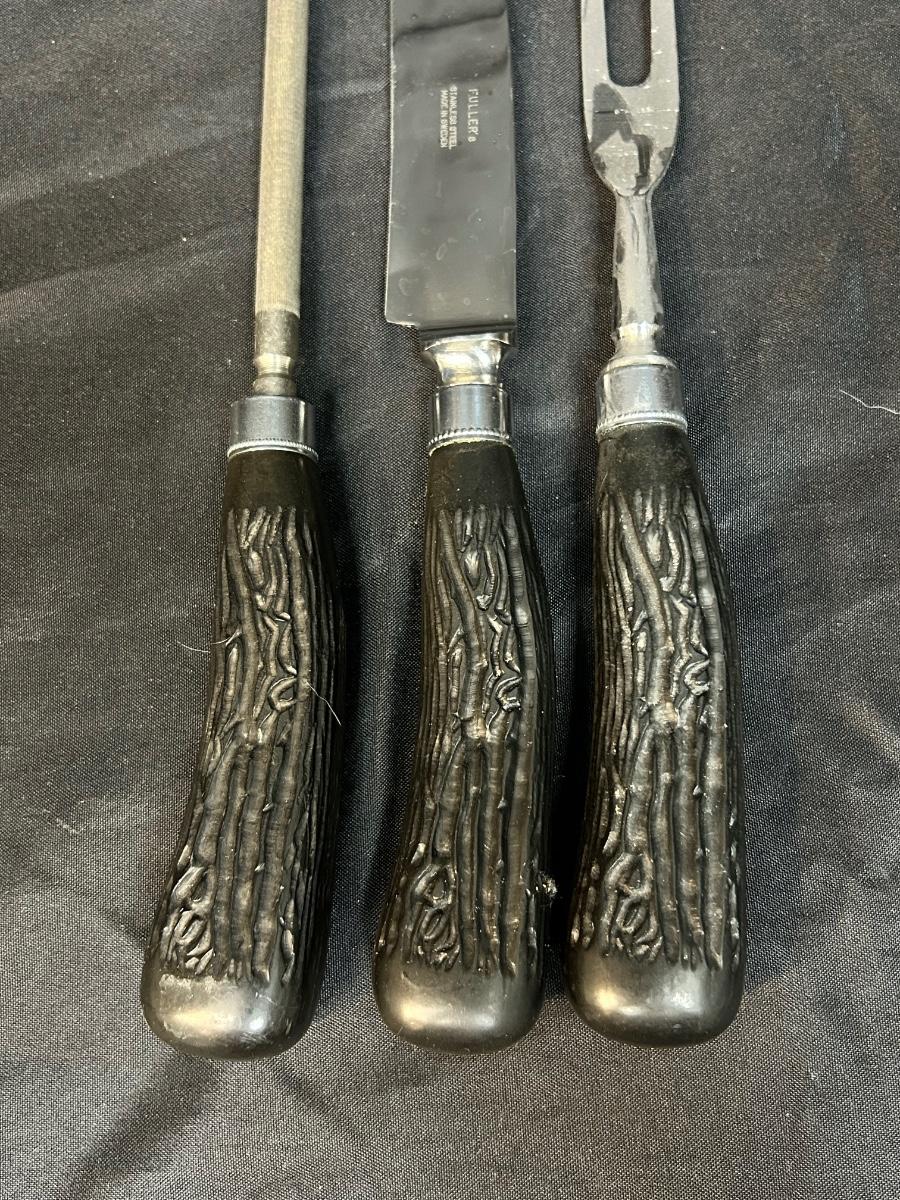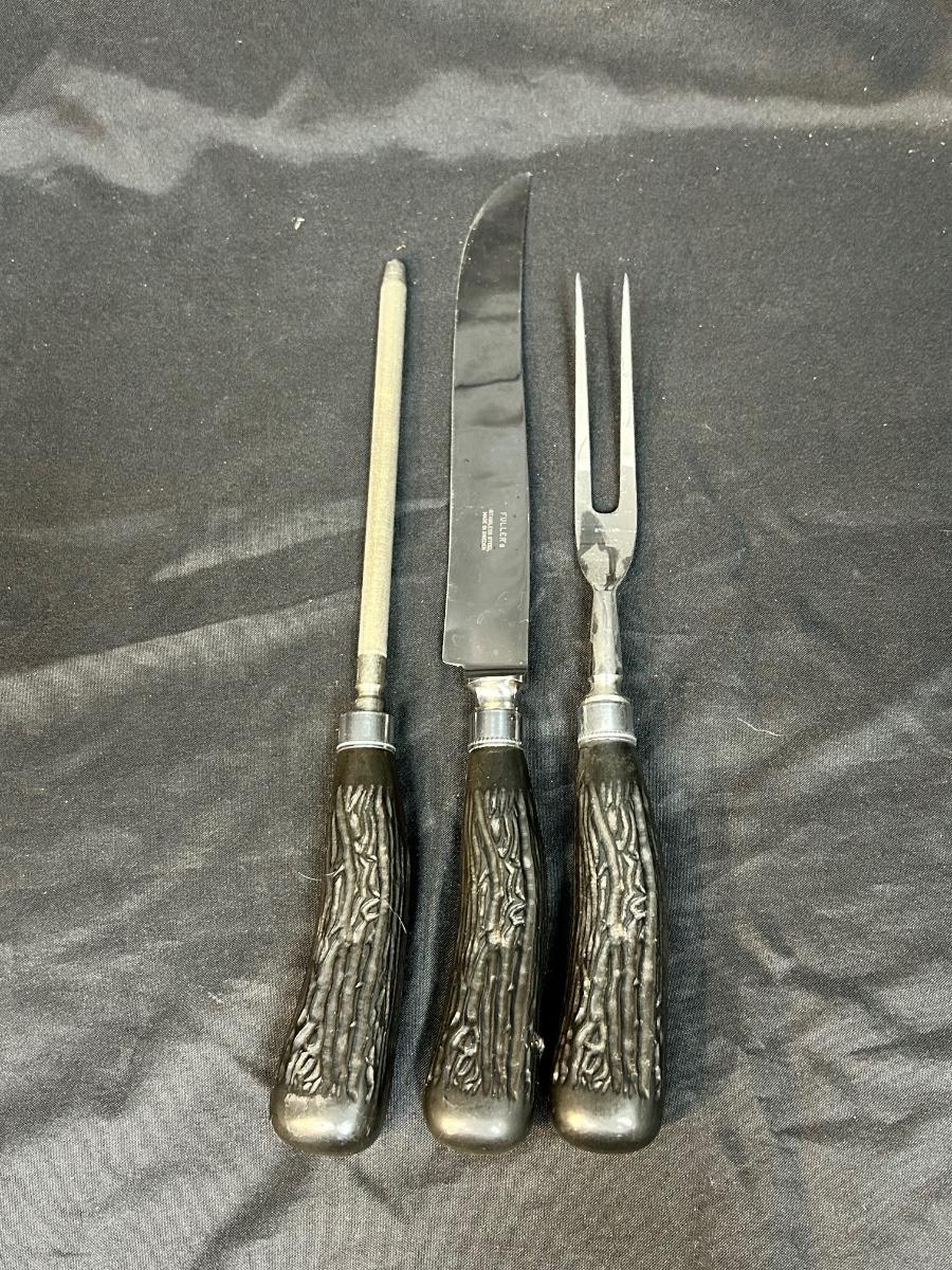 Vintage Fuller Faux Antler Black Handled Cutlery Carving Set Meat Fork Knife Blade Sharpener