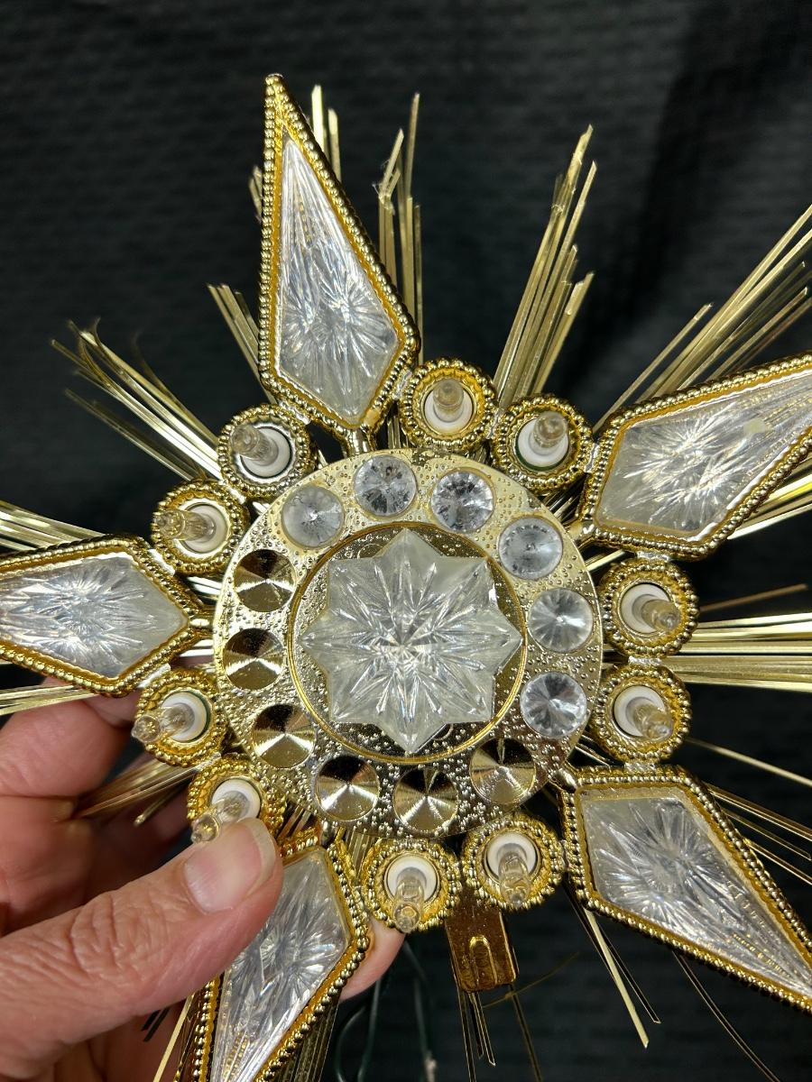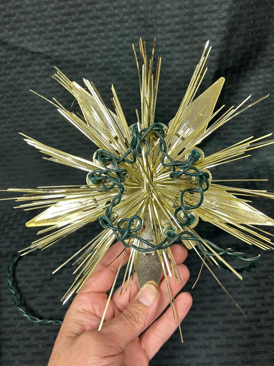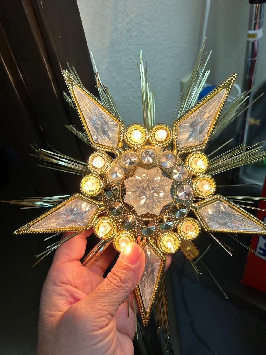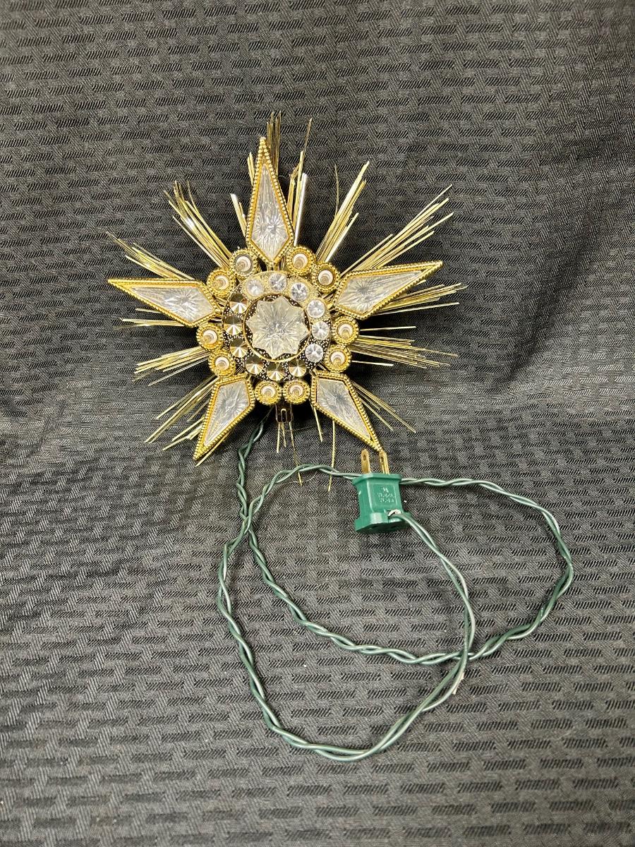 Vintage Retro Jewel Star Tree Topper Lights Up Works. Not sure how it actual attaches to treetop, would have to sit on branches. Is missing some of the rhinestones from around the center but isn't too noticeable.