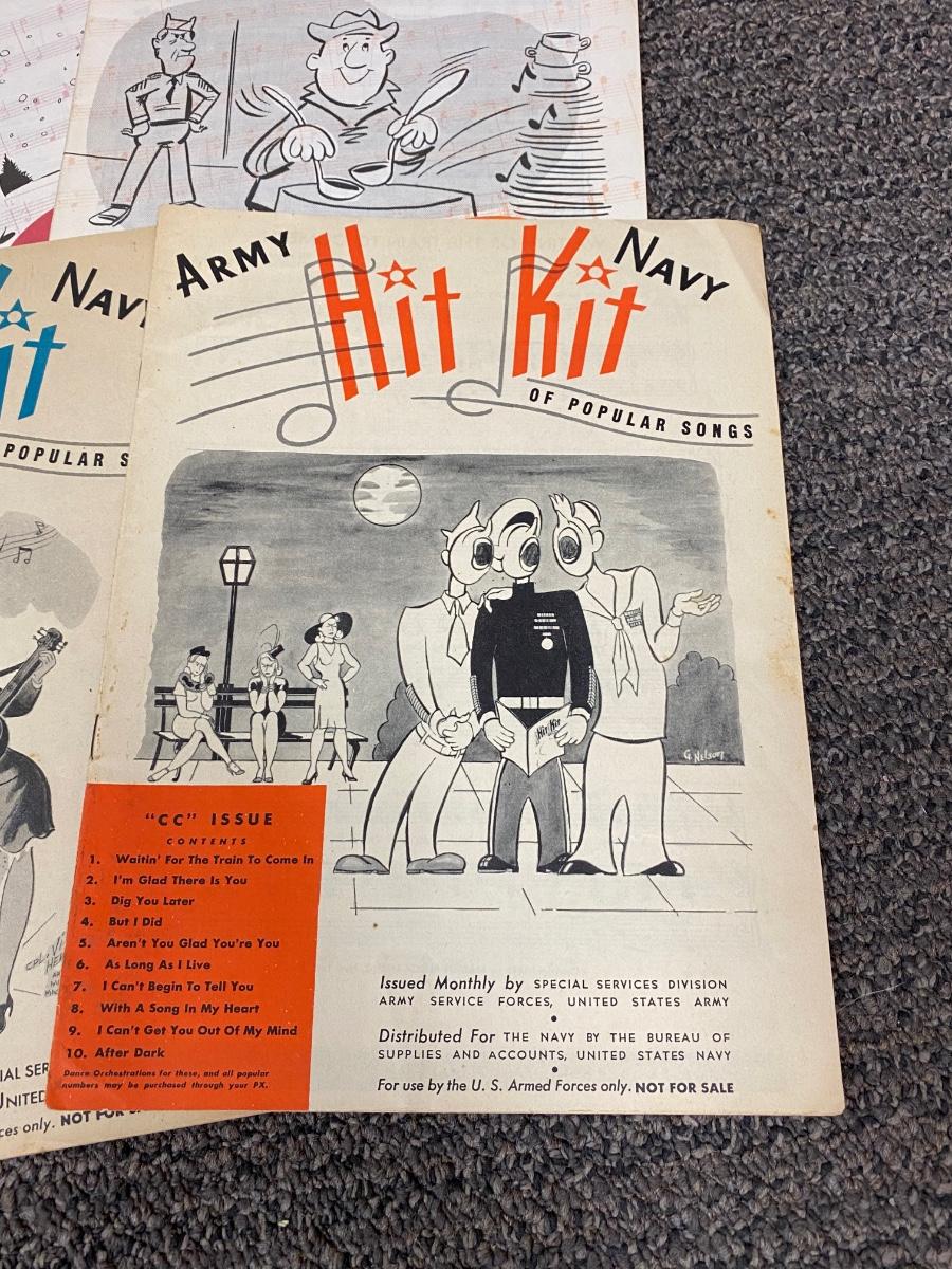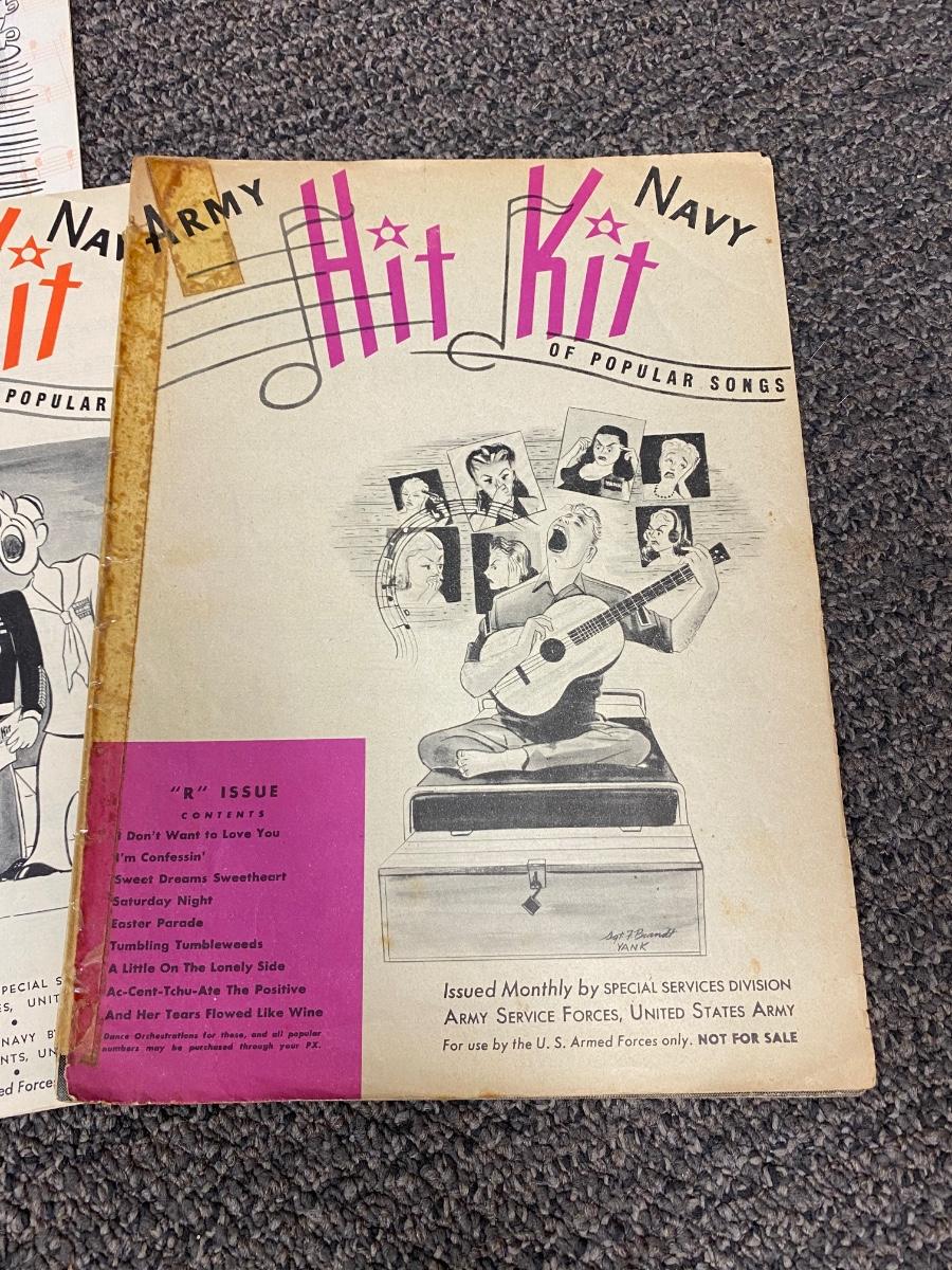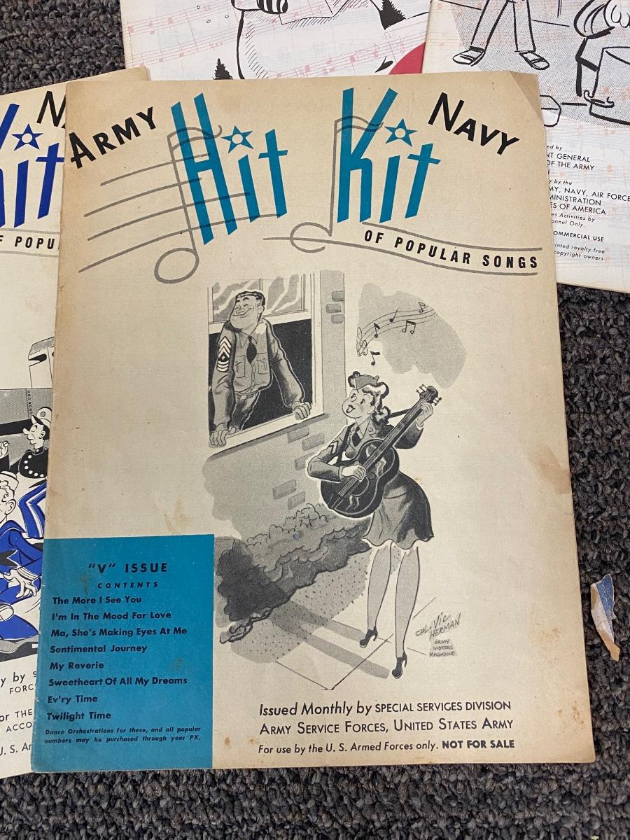 Vintage Military Army Navy Hit Kit Armed Forces Song Folio Band Song Sheet Music Books 1940s WWII. In good vintage condition, some light wear. Popular songs used for soldier shows.
