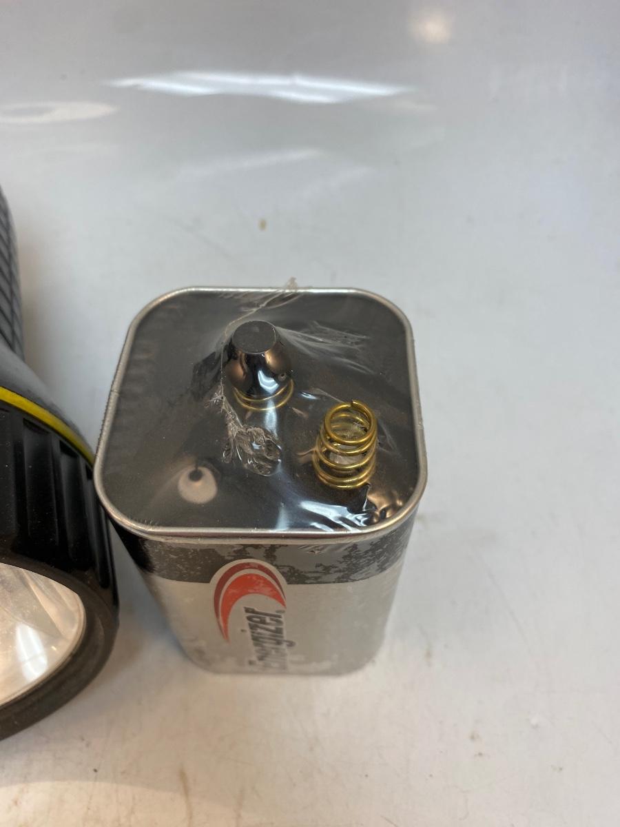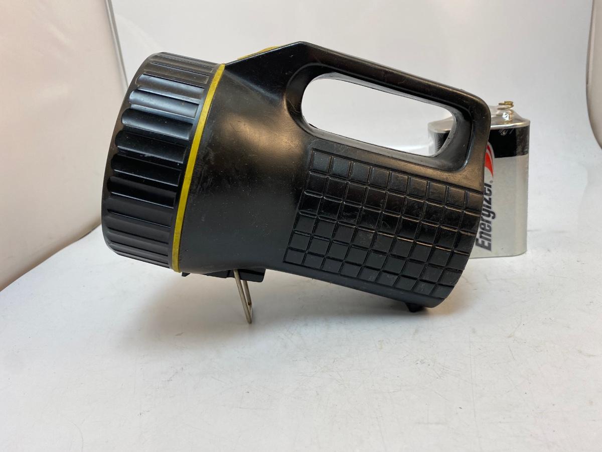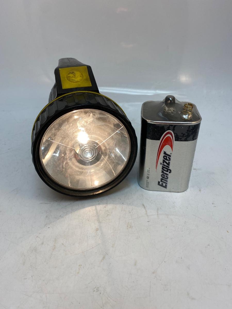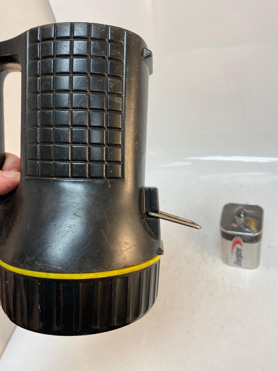Large Handheld Flashlight with Extra Battery Works. Battery is still sealed in plastic.