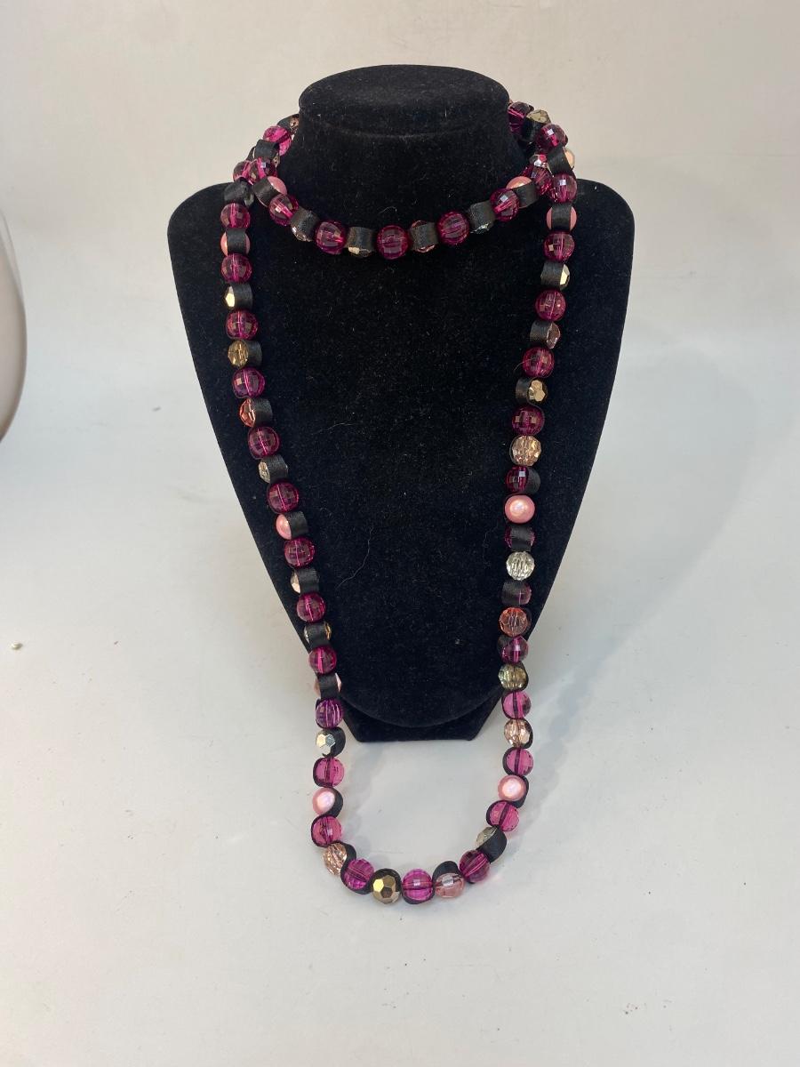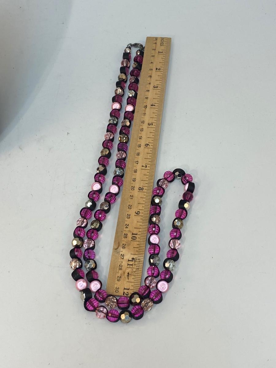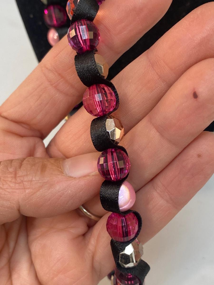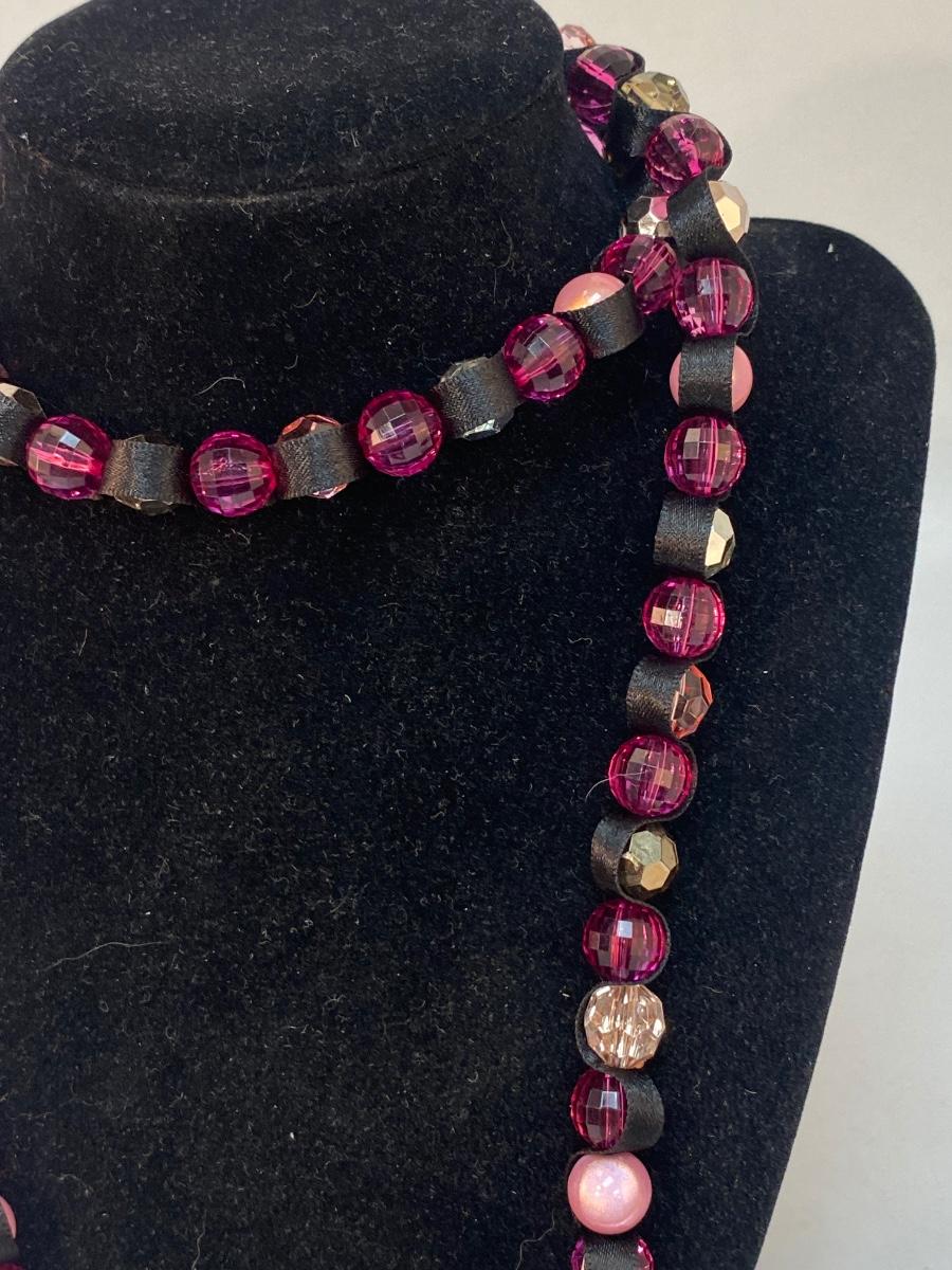 Extra Long Pink Tone Bead and Black Ribbon Necklace. Ribbon is weaved throughout the beads. About 18" length.