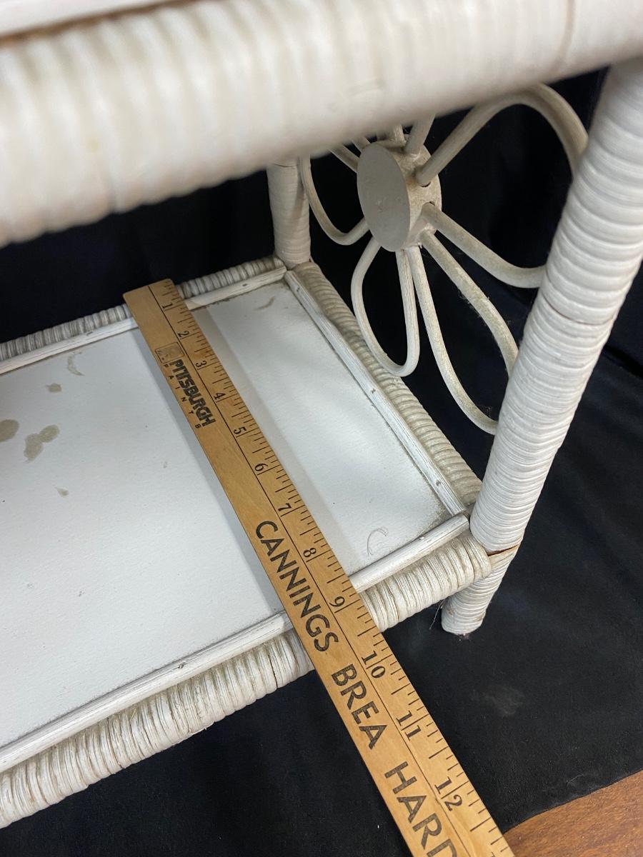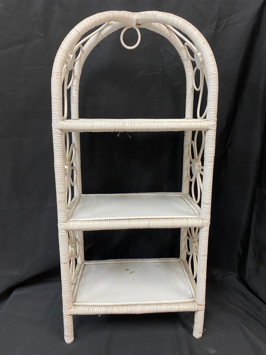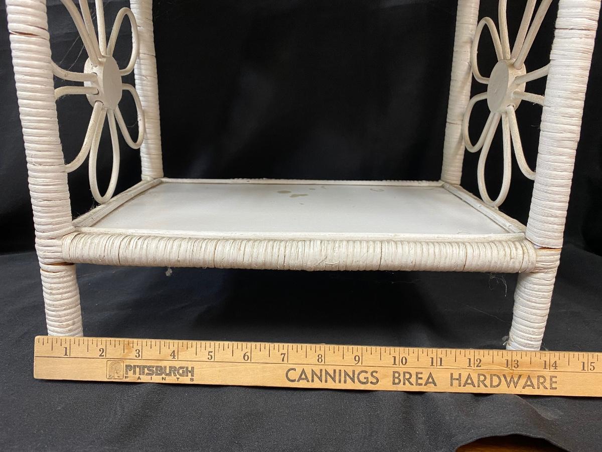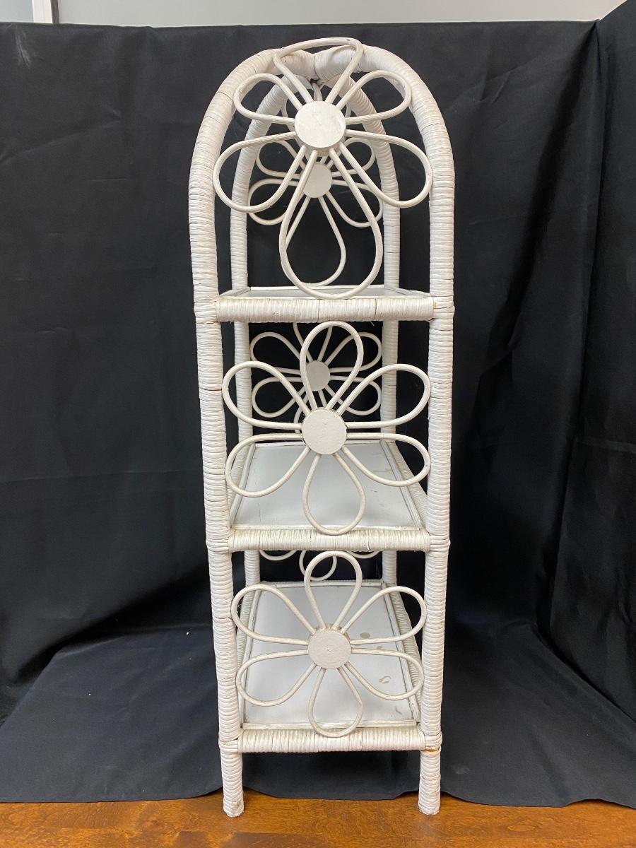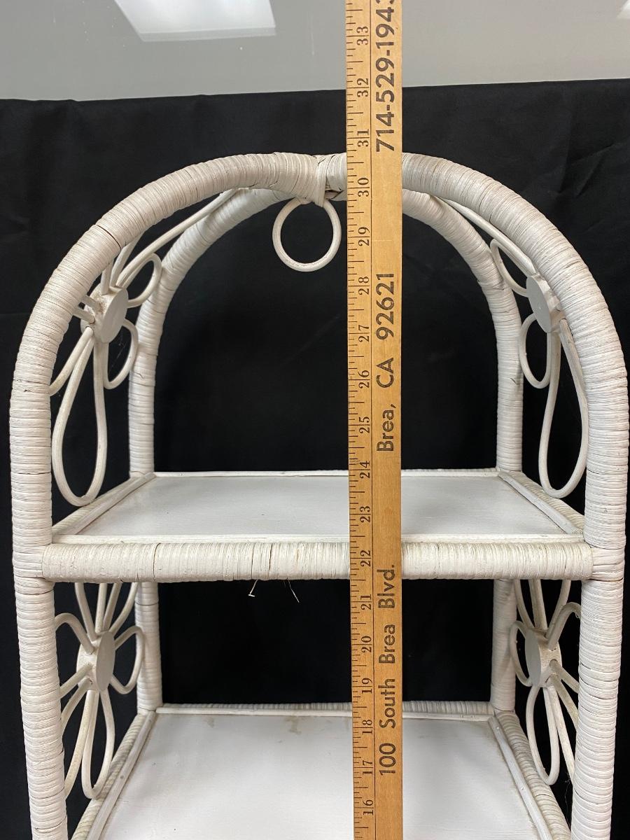 Vintage Retro White Wicker Small Bookcase Storage Display Shelf Flower Sides. A little dusty but in good condition. Easily repaint as desired. About 31x14x10.