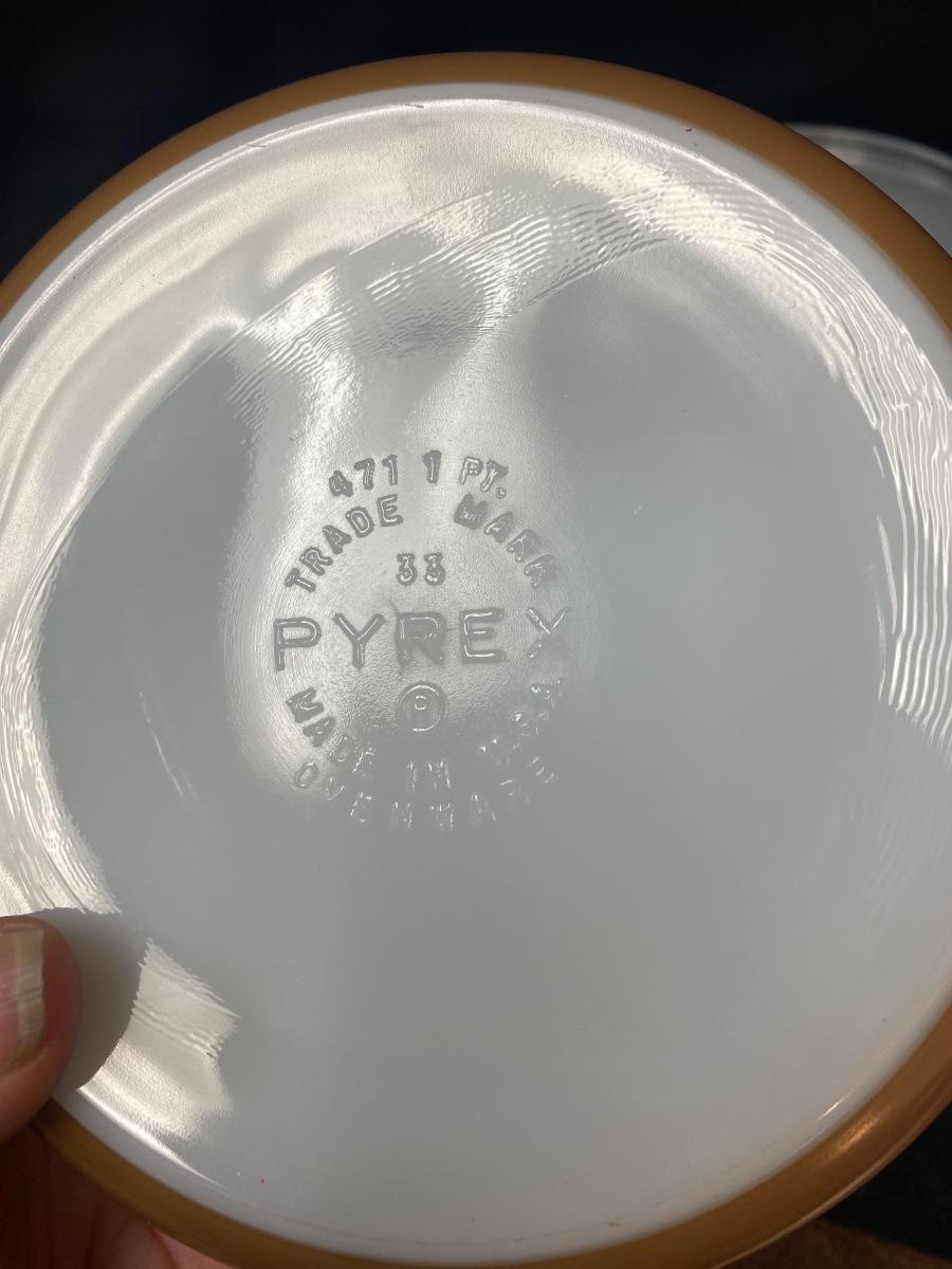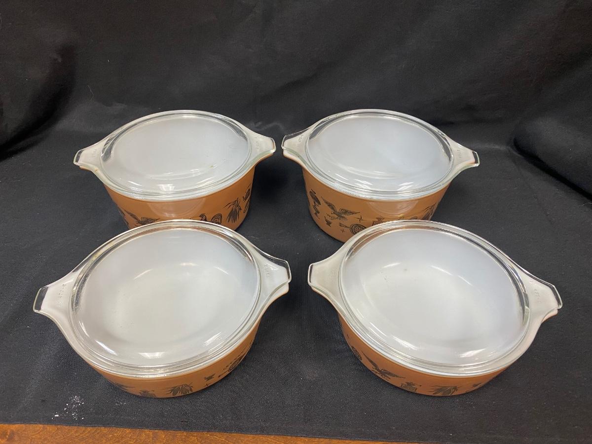 Set of Four Vintage Pyrex Lidded Casserole Dishes 471 473 Brown & Gold Early American Pattern