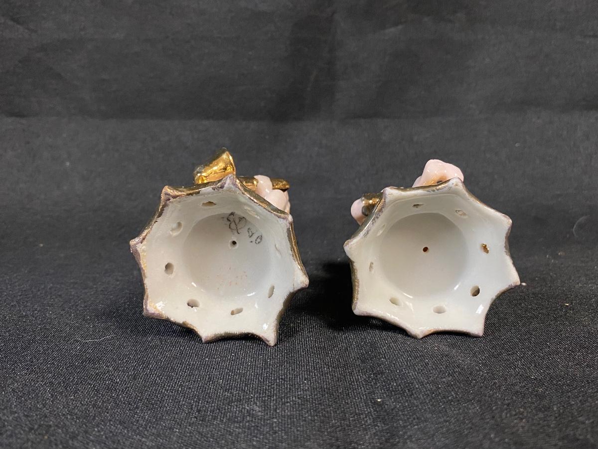 Pair of Vintage Gold Gilt Cherub Angels Playing Instruments Tiny Candle Holder Bud Vases Figurines. In good condition. Small opening in top, display great as figurines.