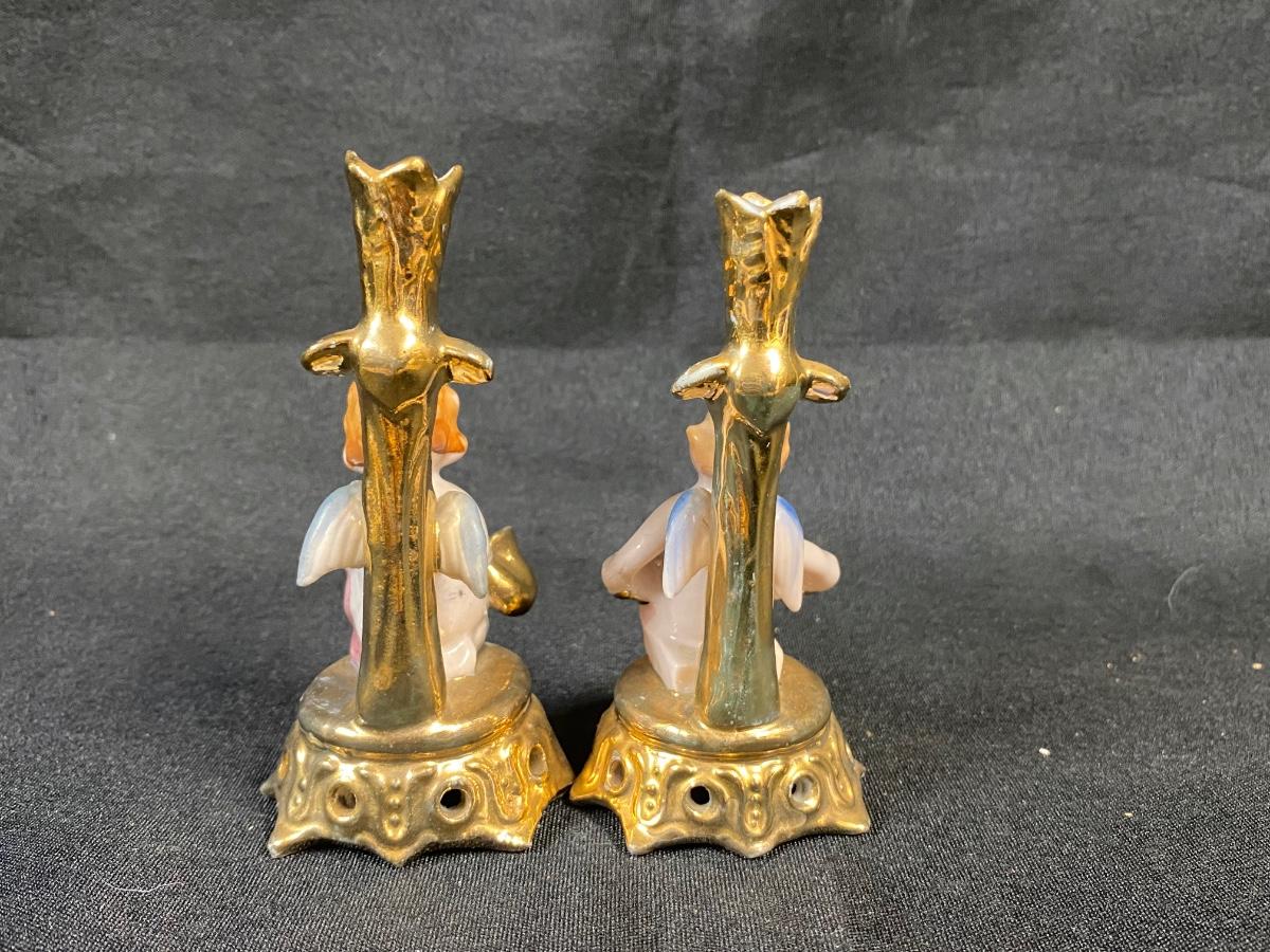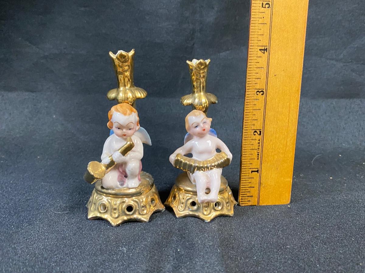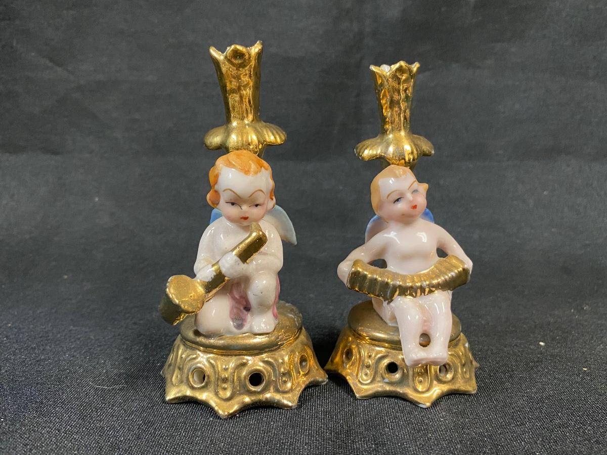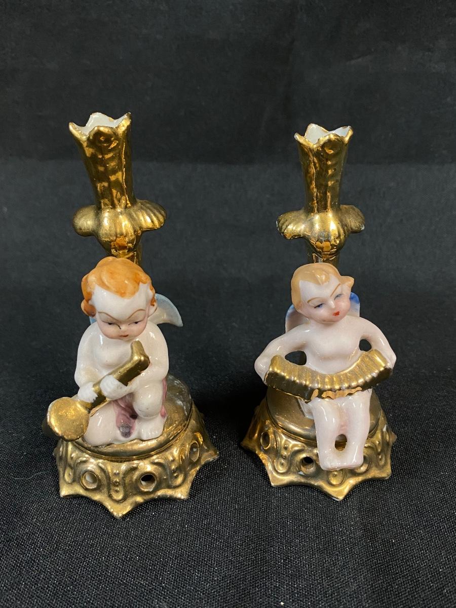 Pair of Vintage Gold Gilt Cherub Angels Playing Instruments Tiny Candle Holder Bud Vases Figurines