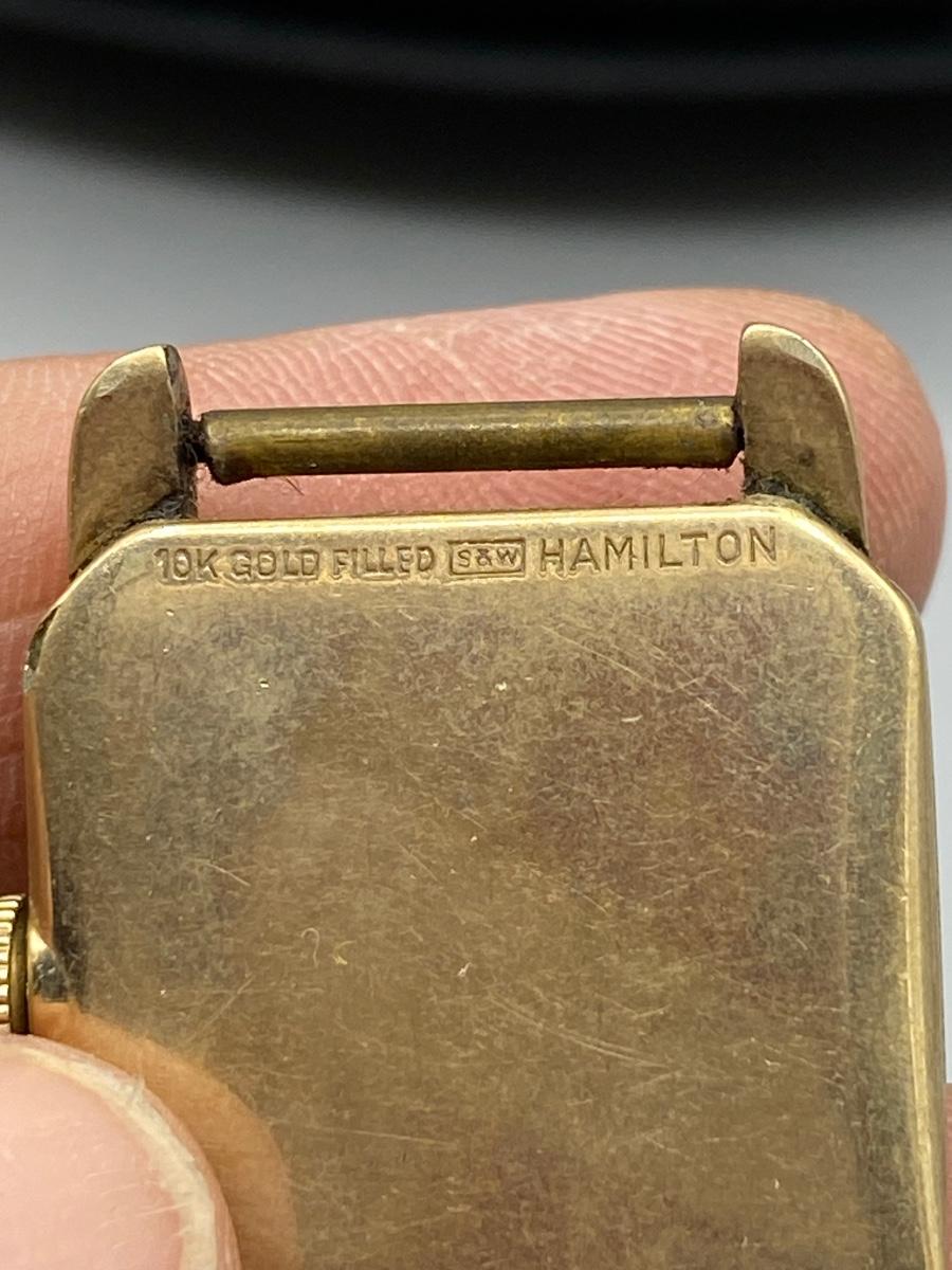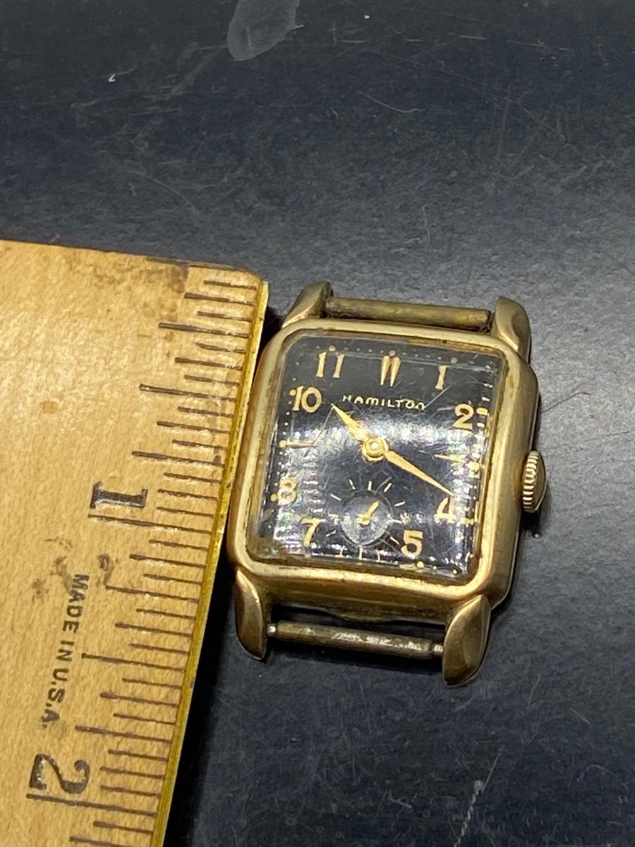 Vintage Midcentury Hamilton Wind Up 10k Gold Filled Watch Face with Wrist Band. Wristband and watch face are not connected, may not be original to one another. Some wear to glass from use. The watch winds and trys to work but stops, may just need to be serviced. Stamped 10k gold filled on the back.