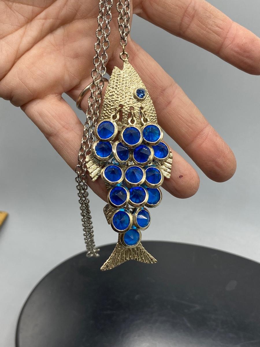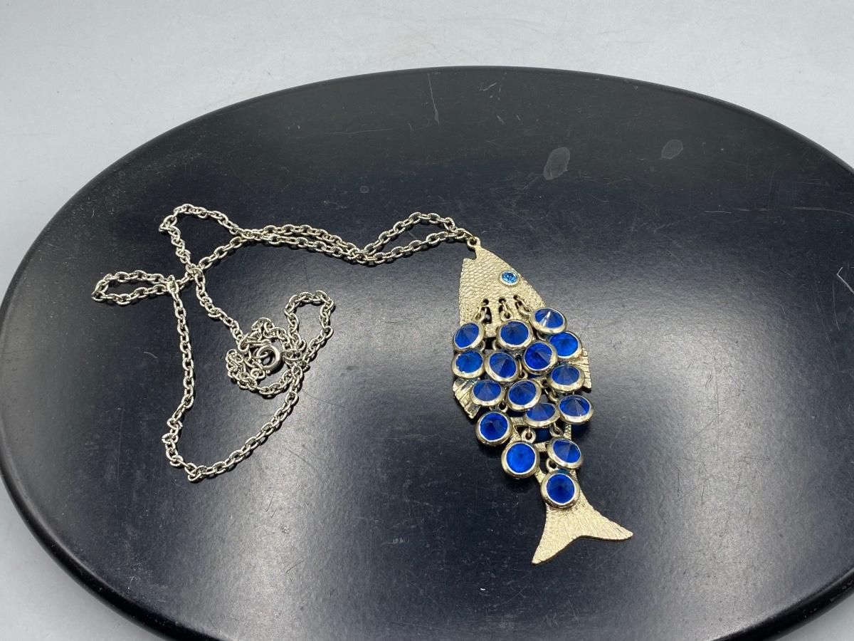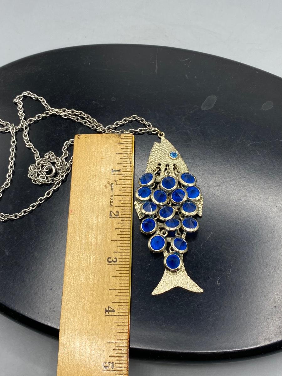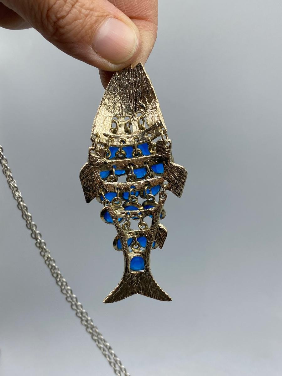 Retro Silver Tone Articulated Fish Pendant Necklace with Dangling Blue Rhinestones