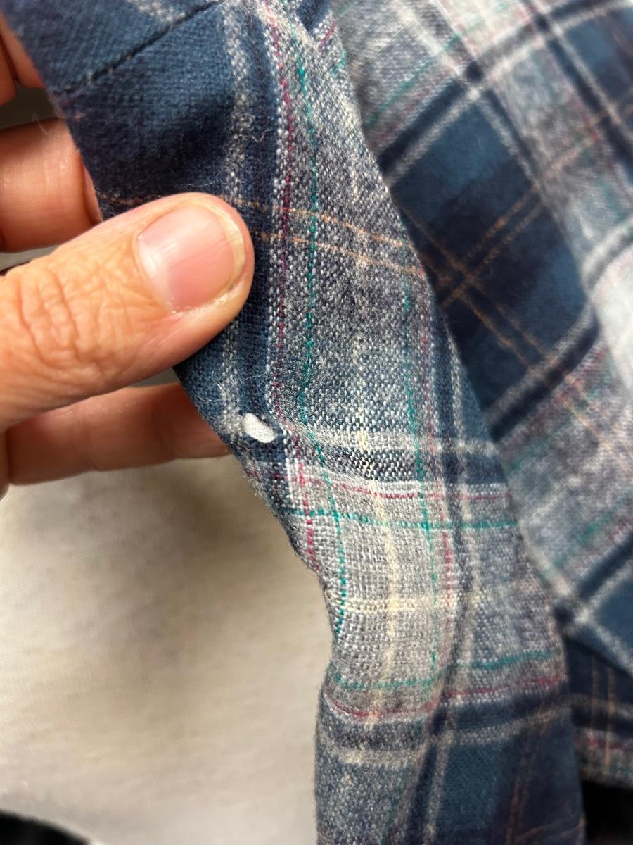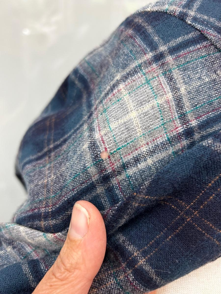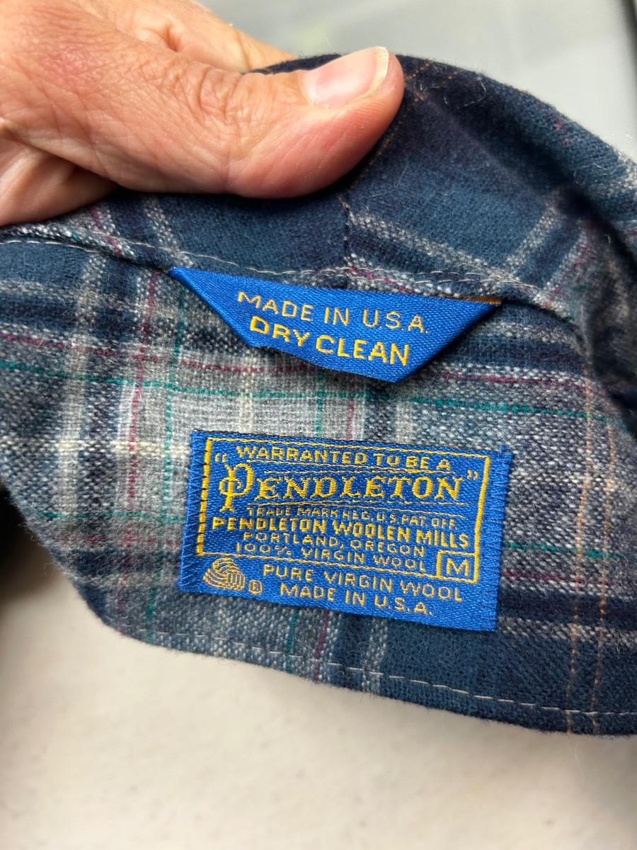 Blue Grey Plaid Pendleton Wool Flannel Robe Medium. In good, aged condition, did find a couple of tiny moth holes. Three pockets with tie waist.