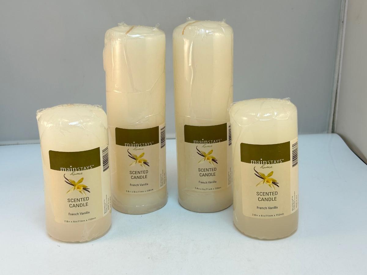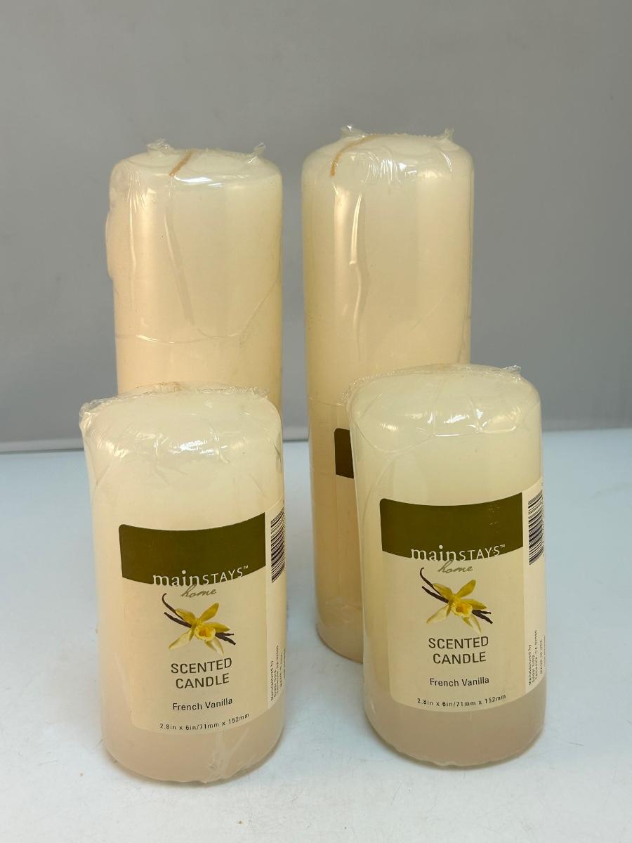 Lot of Four Pillar Style French Vanilla Scented Wax Candles UNUSED. Two sizes.