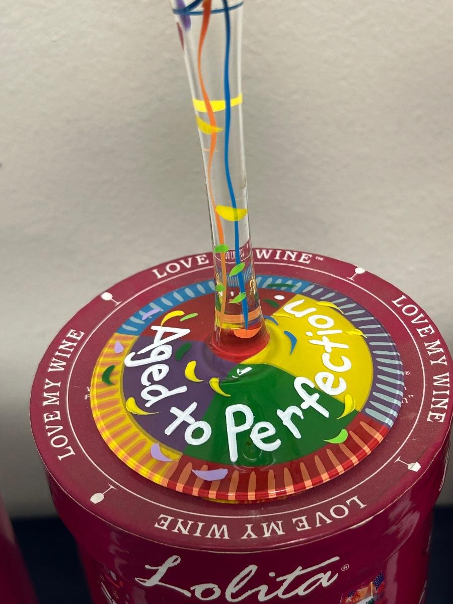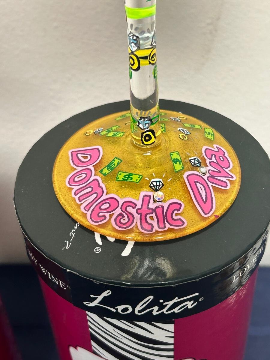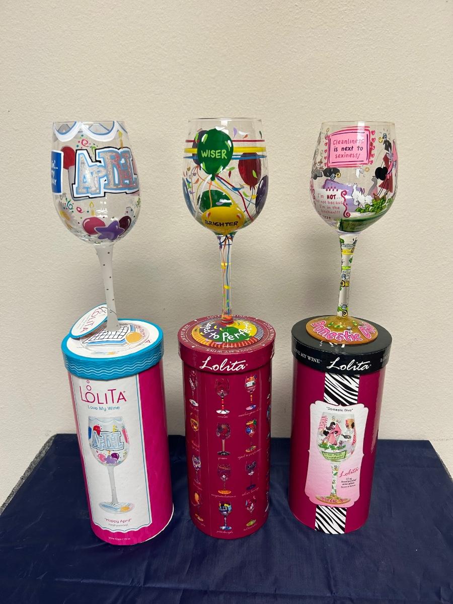 Lot of Three Lolita Specialty Decorated Wine Glasses with Original Boxes. In good condition. Look unused.