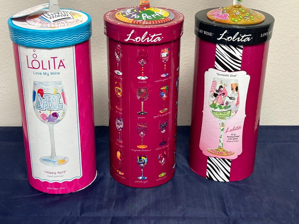 Lot of Three Lolita Specialty Decorated Wine Glasses with Original Boxes