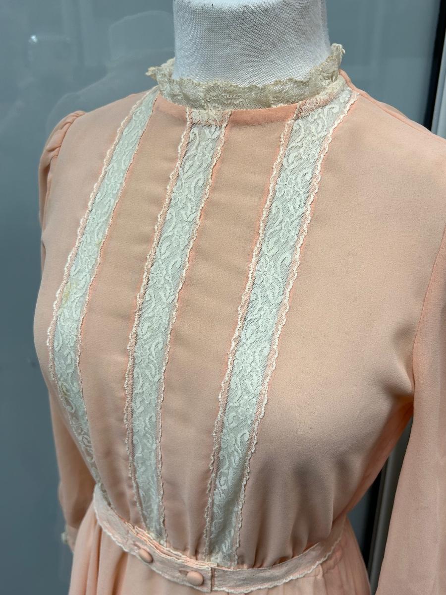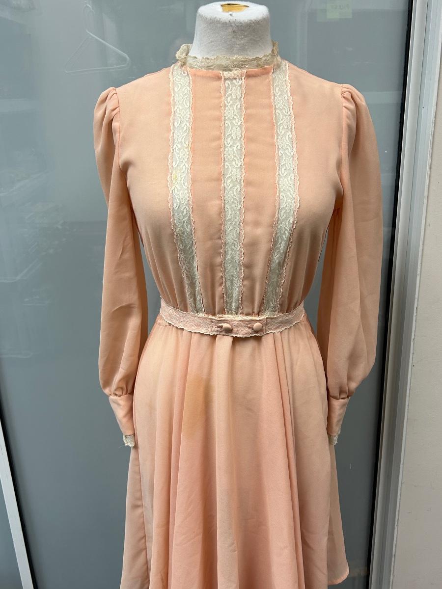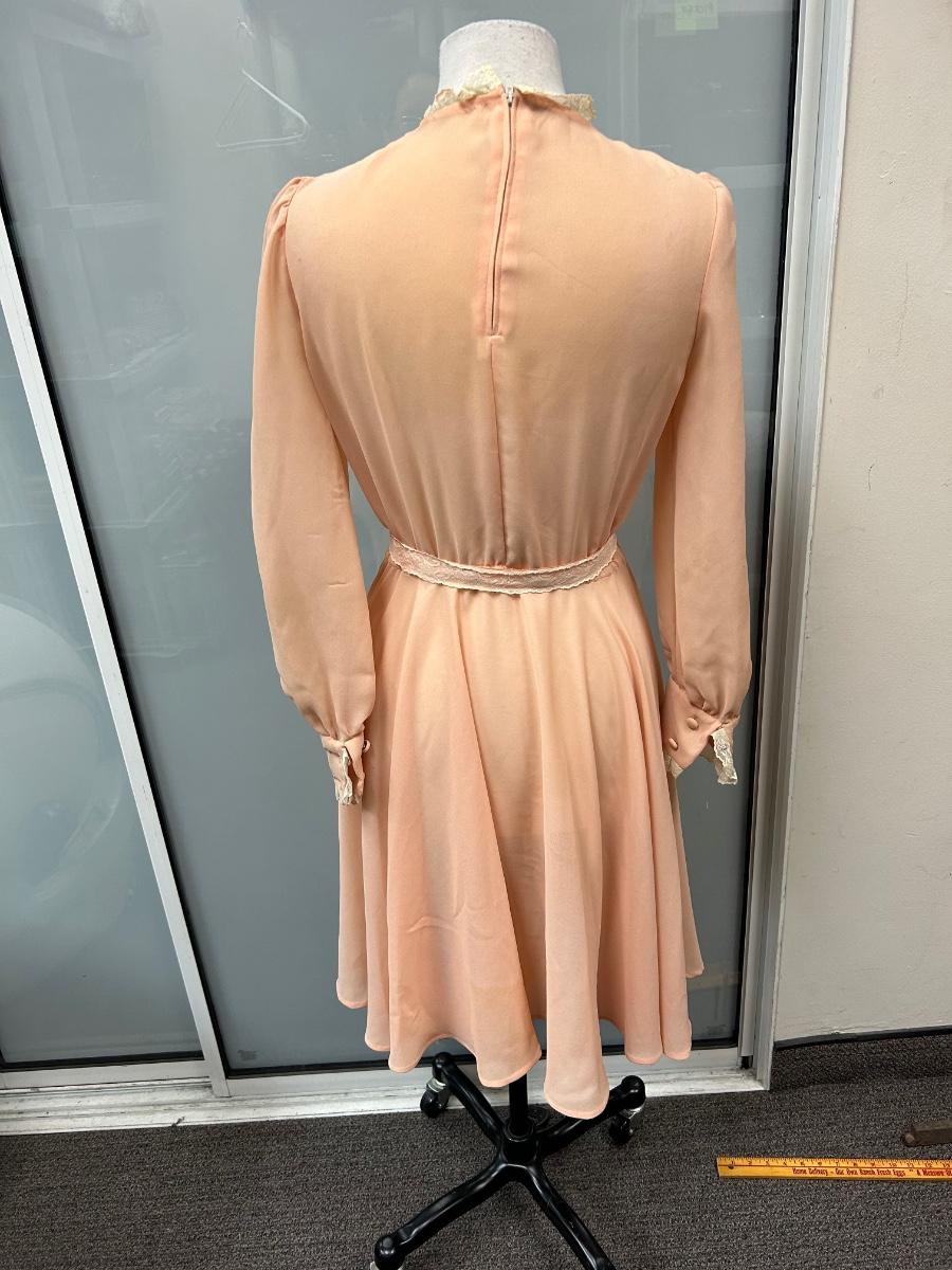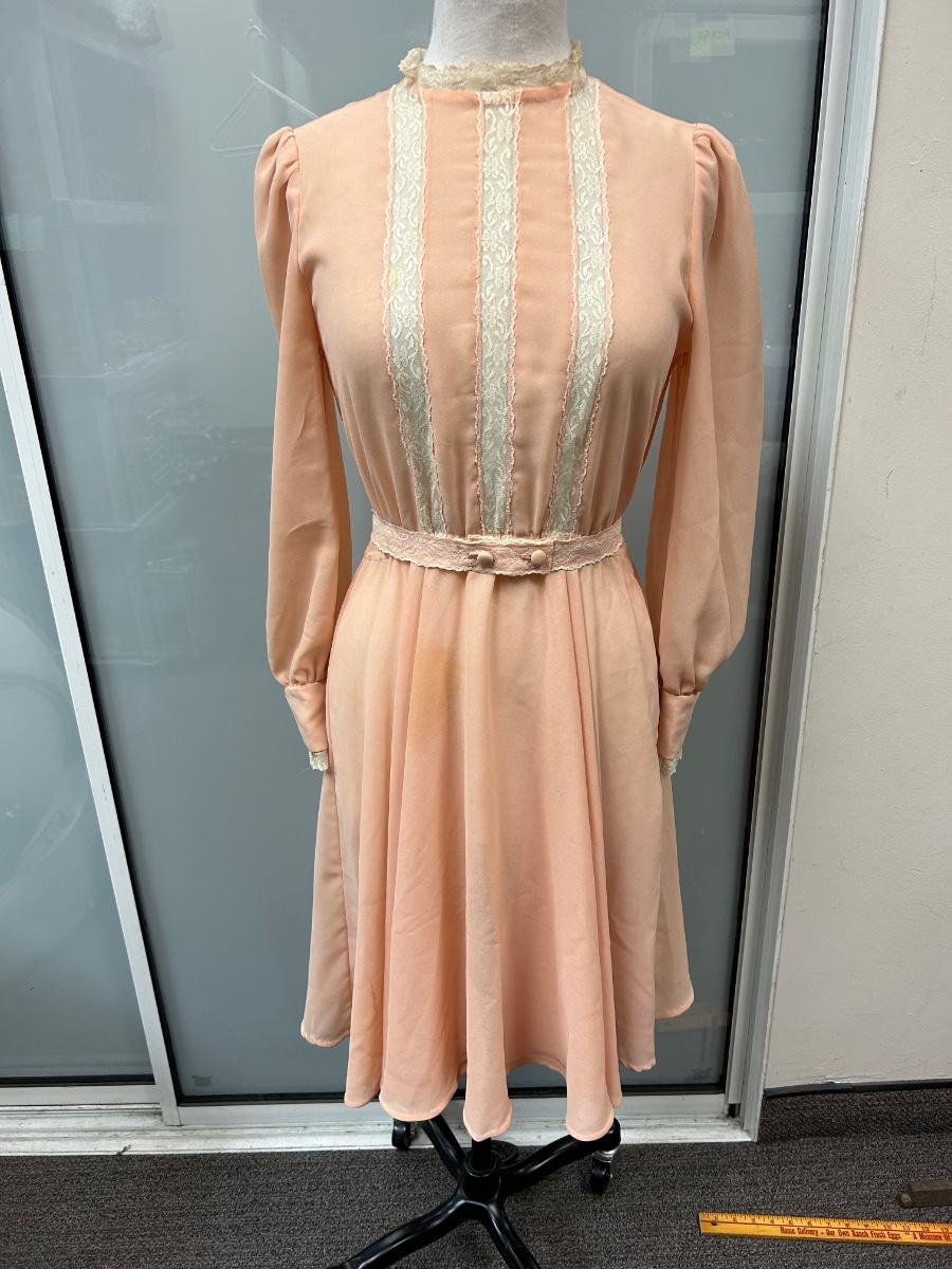 Vintage Peach Flowy Knee Length Long Sleeve Dress with Lace Trim. Looks to be from the 1970s. Some discoloration spots but no holes. No tags but based on the other clothes and mannequin fit, it is a small.