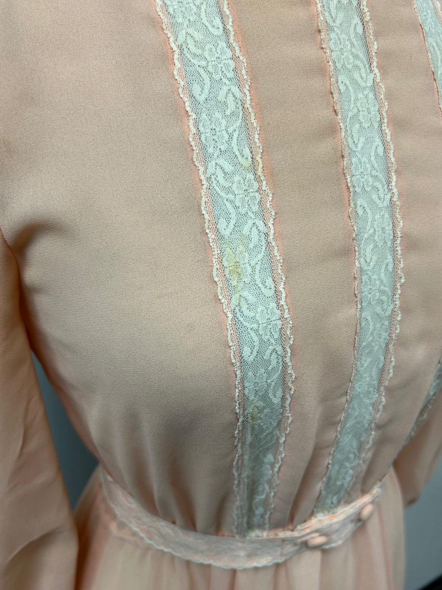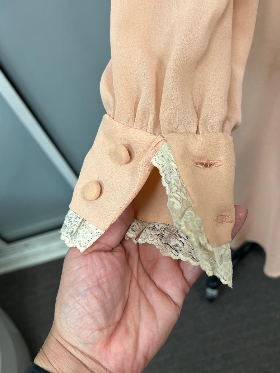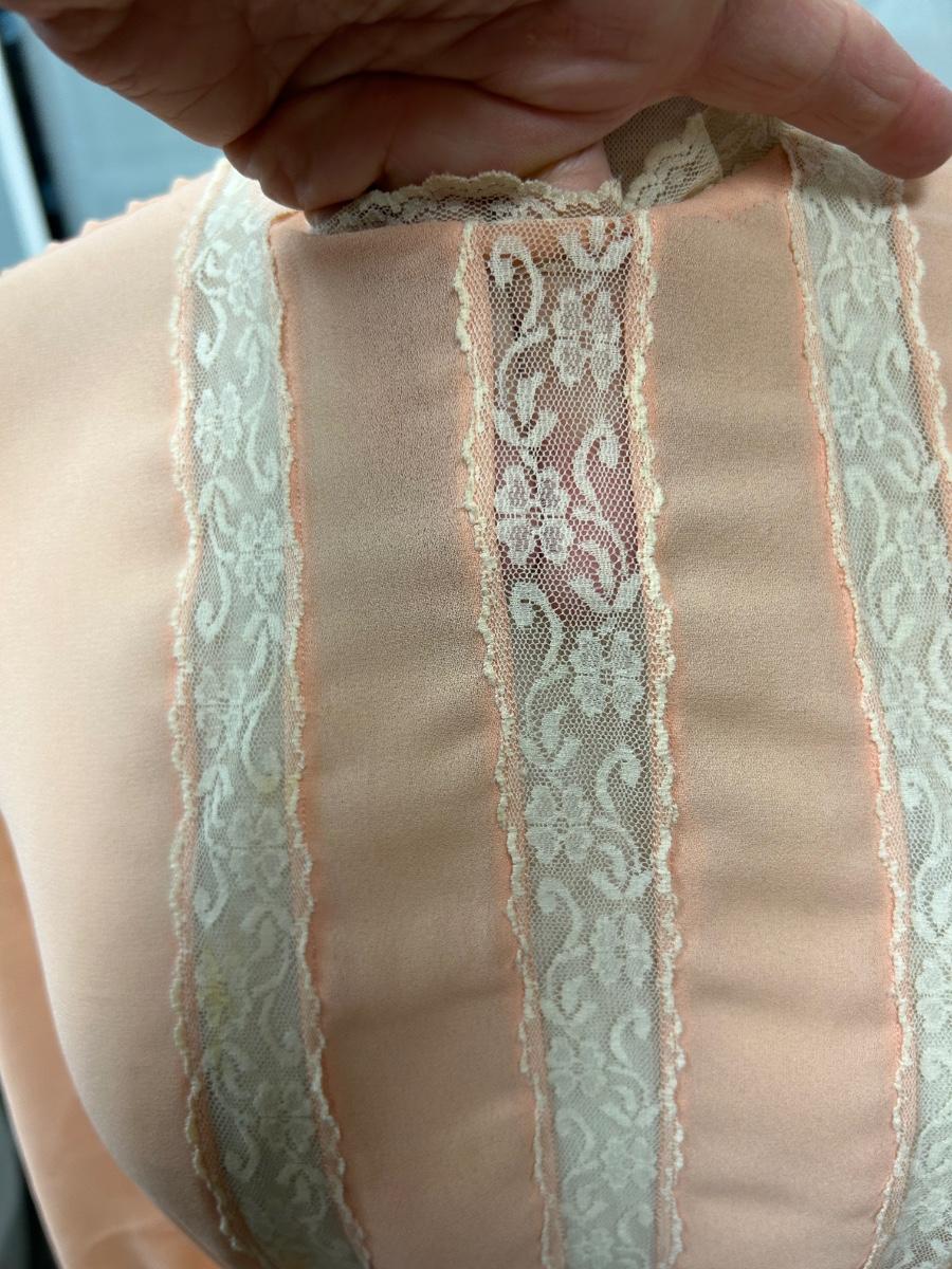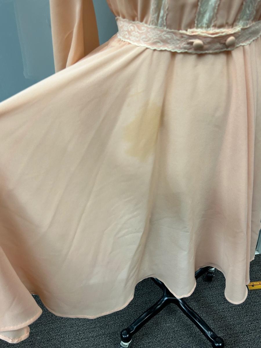Vintage Peach Flowy Knee Length Long Sleeve Dress with Lace Trim. Looks to be from the 1970s. Some discoloration spots but no holes. No tags but based on the other clothes and mannequin fit, it is a small.