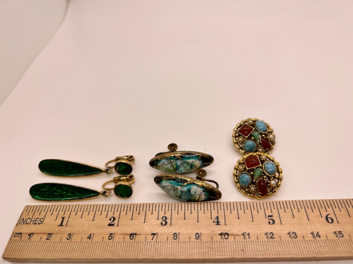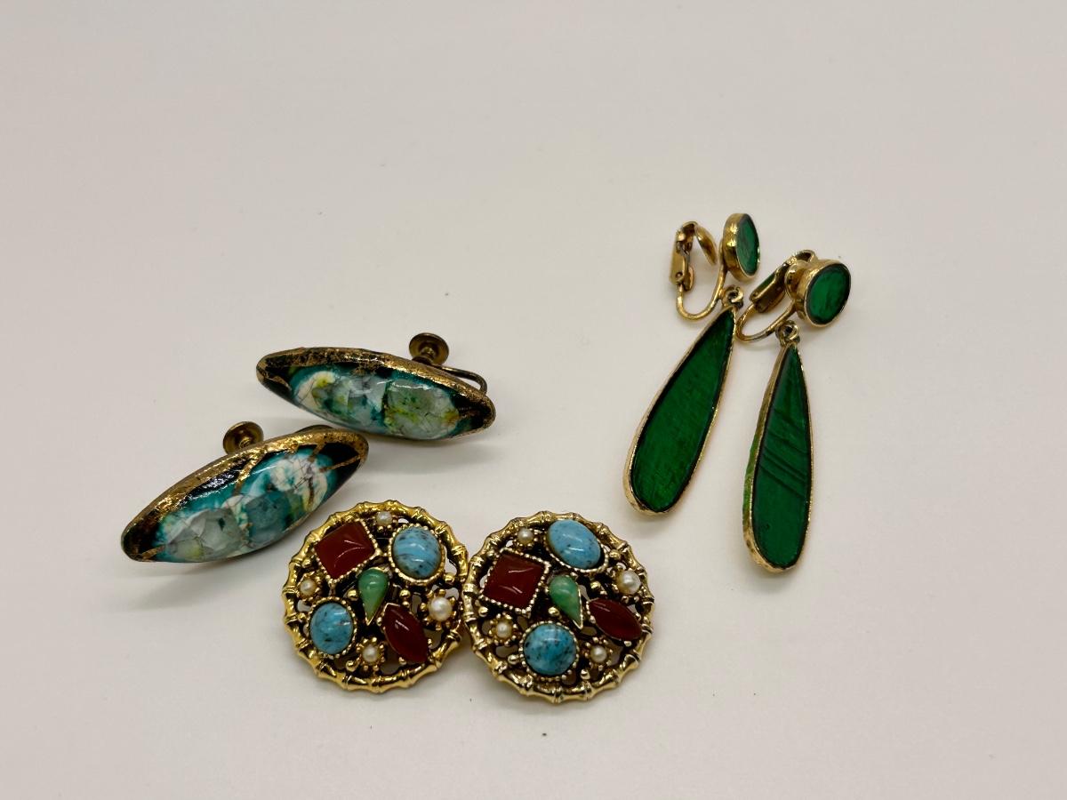 Three Pairs of Vintage Retro Jewel Tone Clip Style Earrings