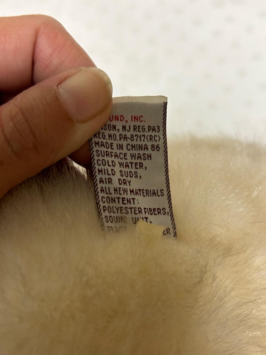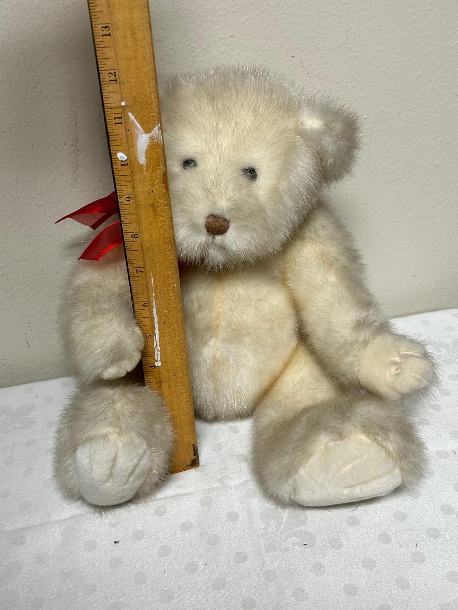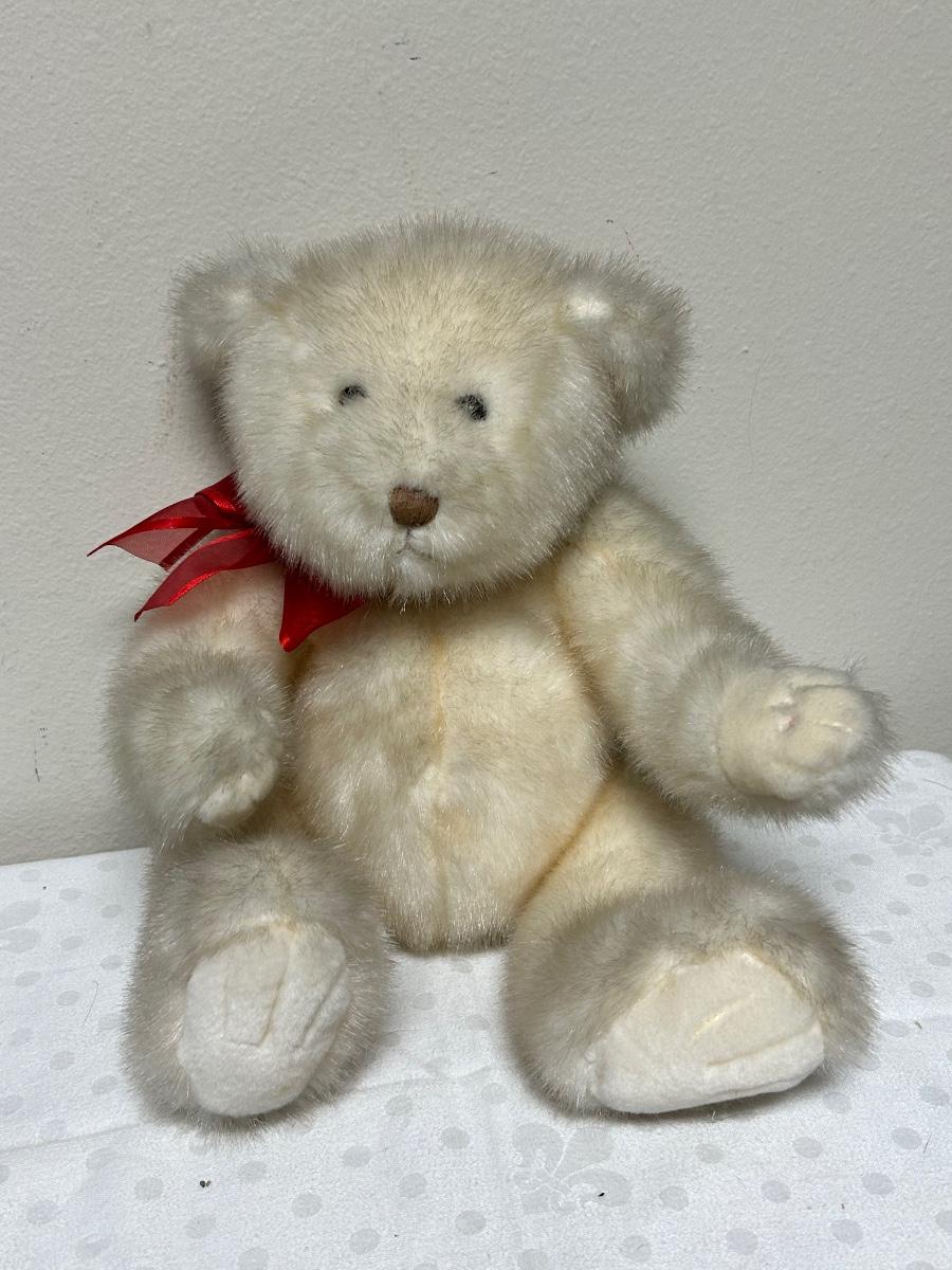 Fuzzy White Gund Teddy Bear Plush Stuffed Animal. Looks a little grey from dust from previous display. Has a sound box inside but does not work any longer.
