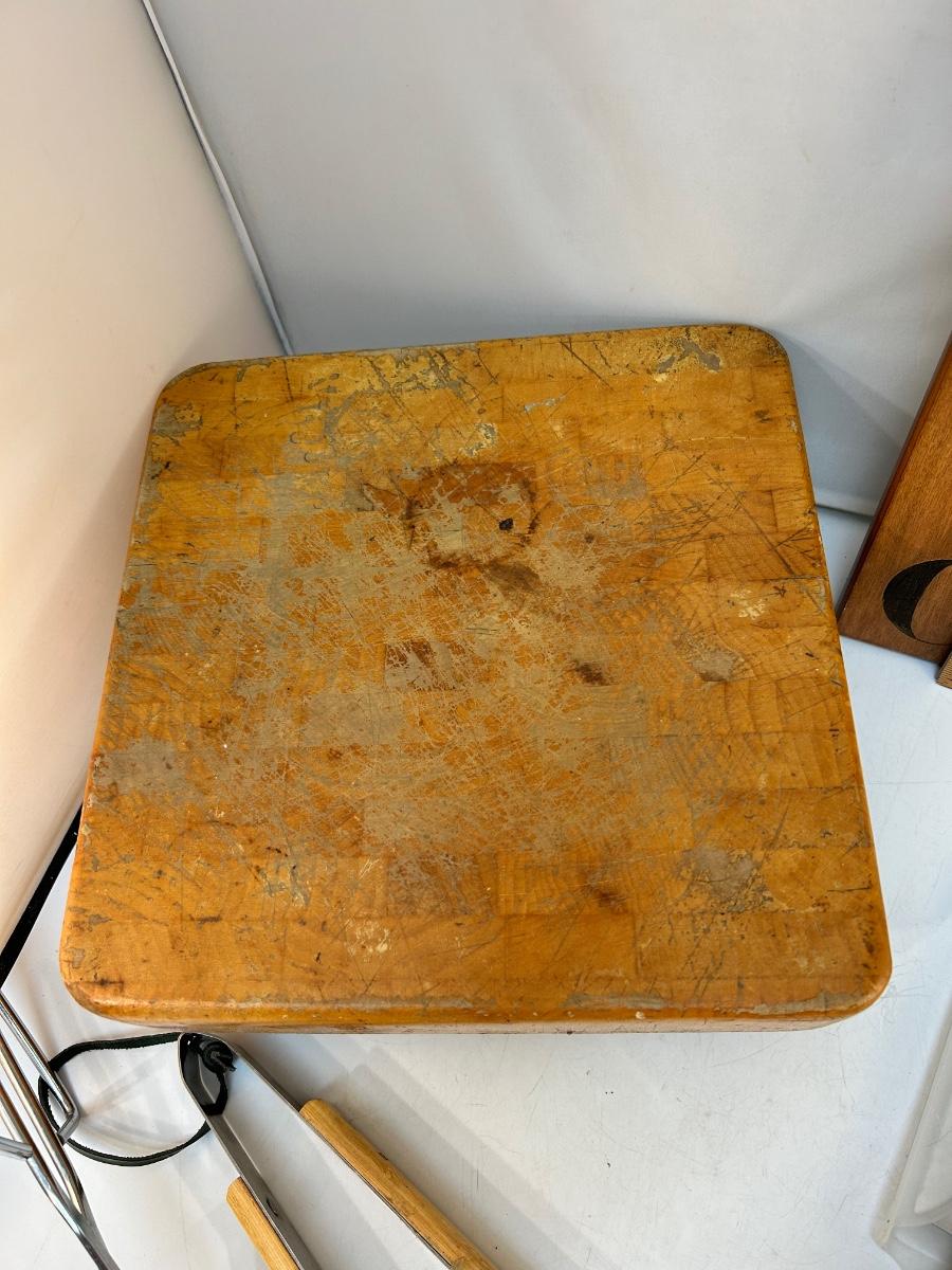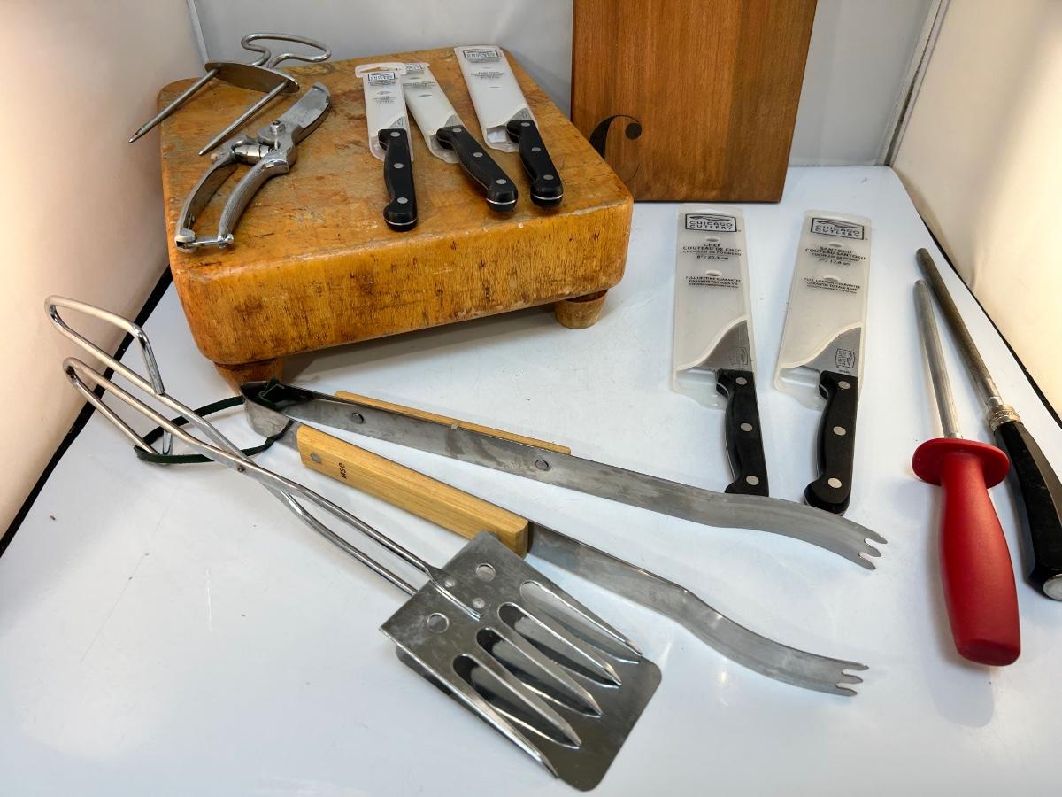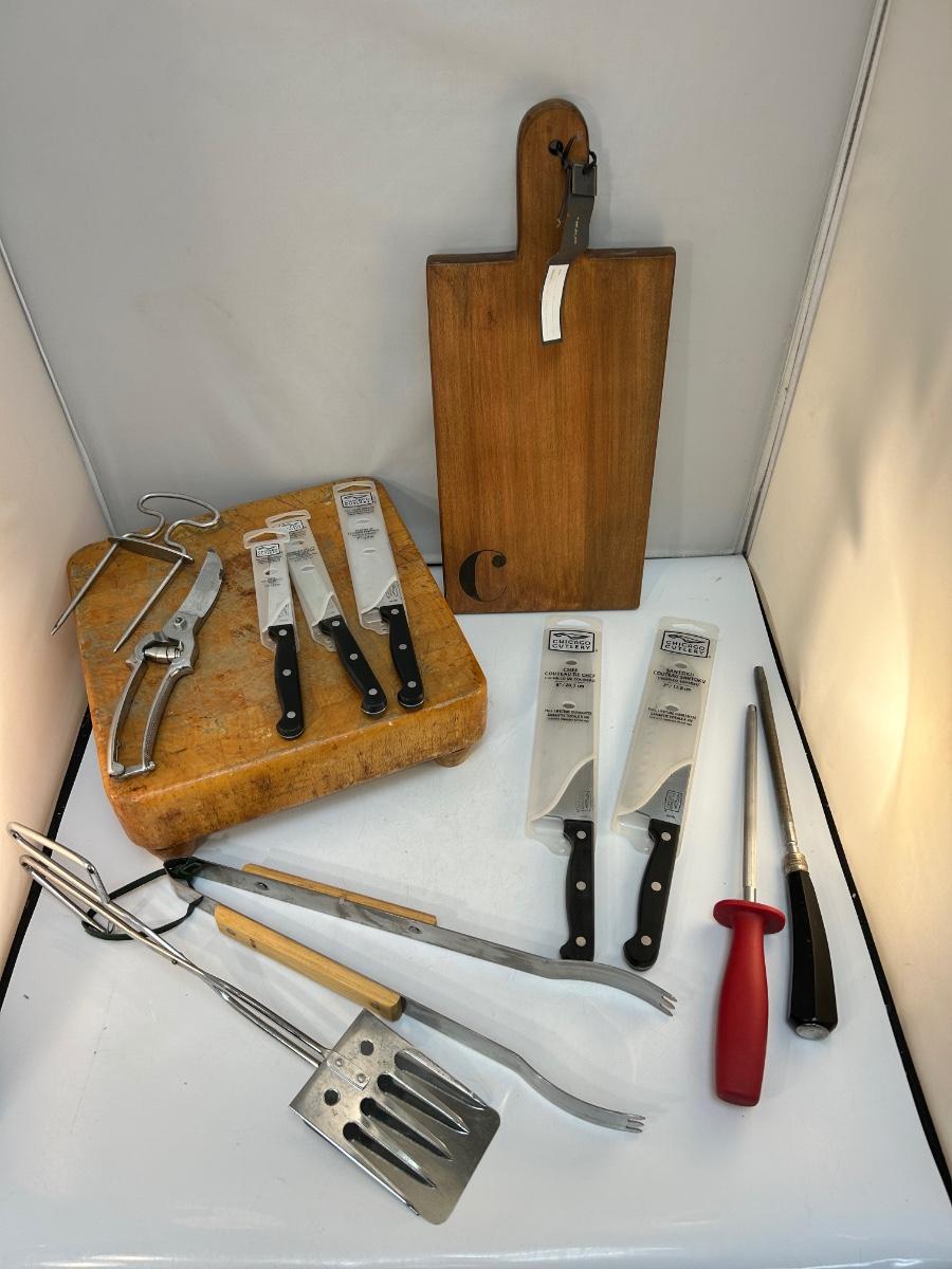 Cutting Board and Cutlery Knife Lot Grilling Tools Included. In good used condition. Knives have some light signs of use but were well kept with covers.