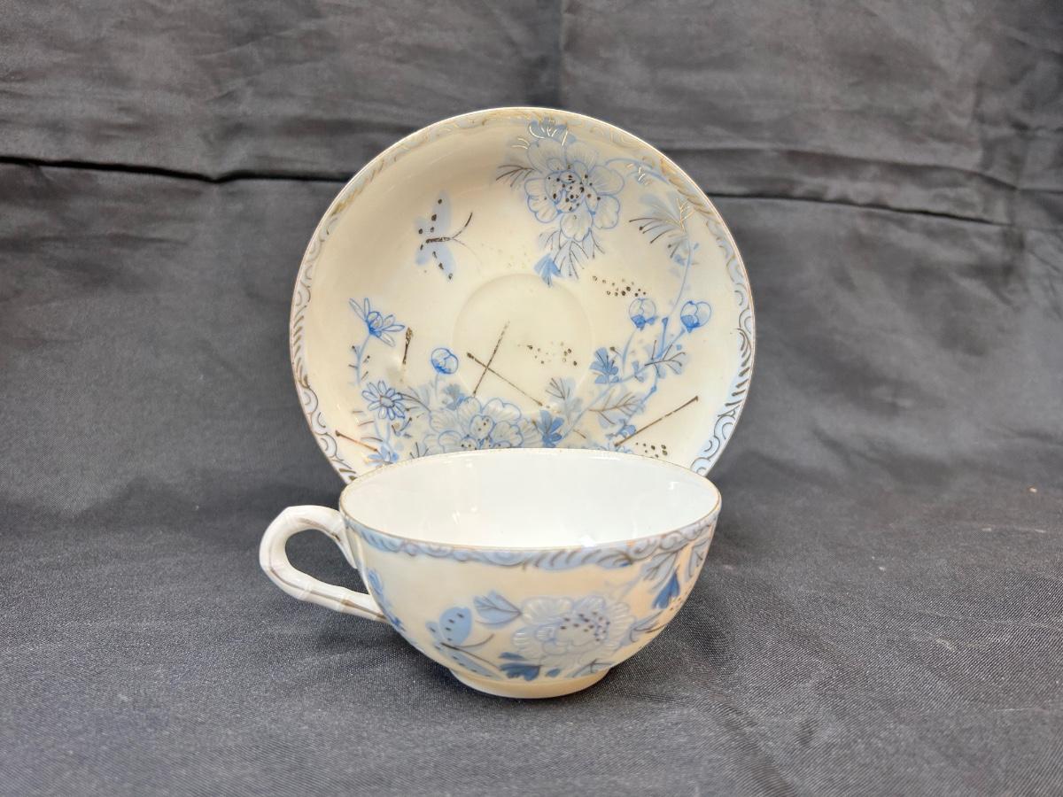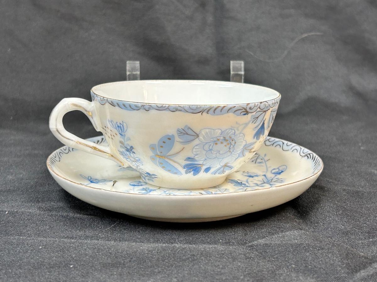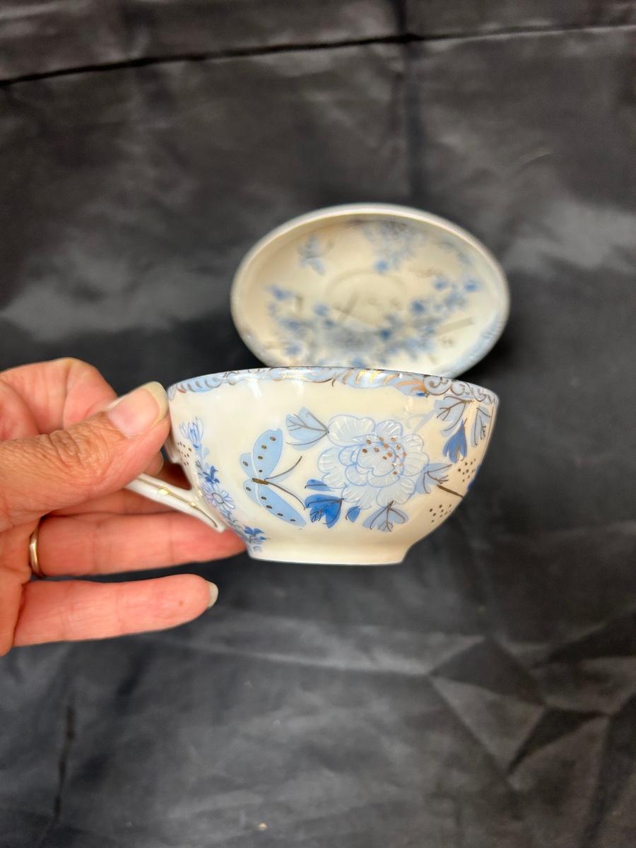 Vintage Delicate White with Blue Hand Painted Floral Pattern Teacup and Saucer. Unbranded. Very delicate, thin china. Beautifully painted flower with butterfly pattern. No damage noticed.
